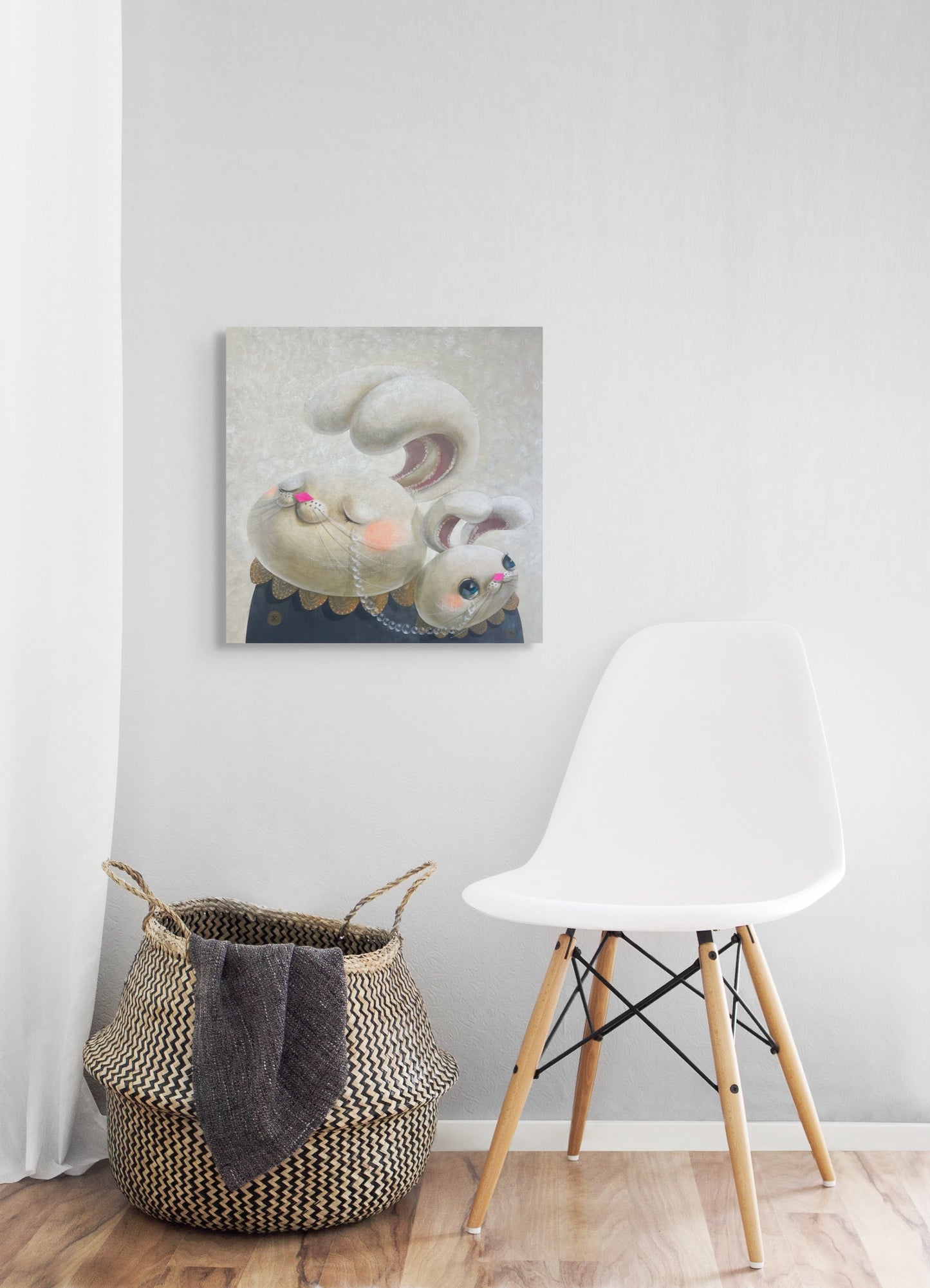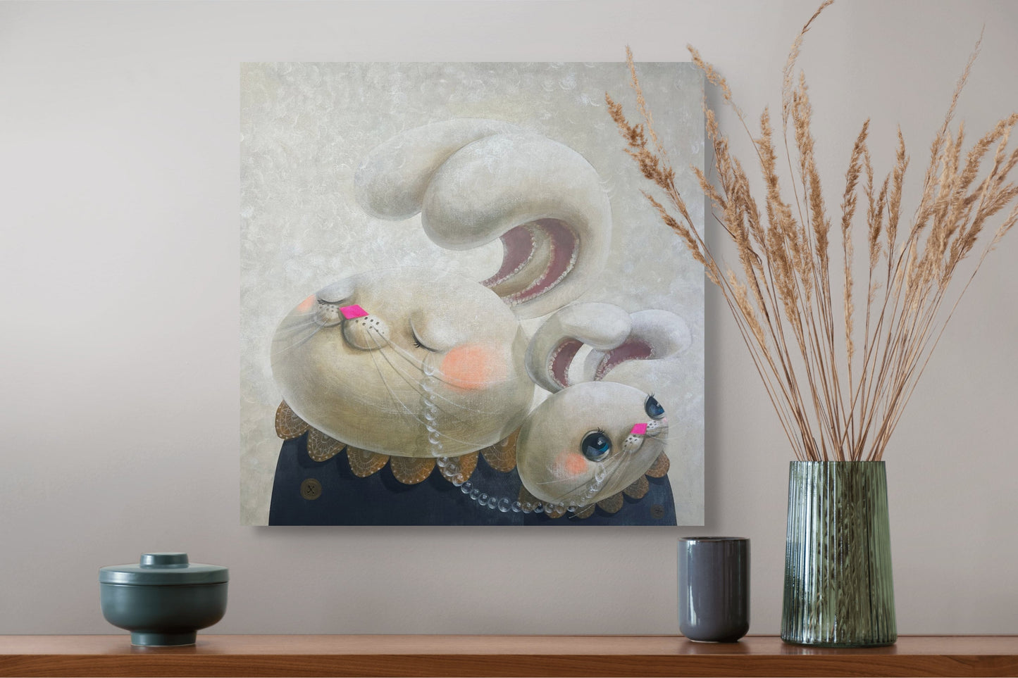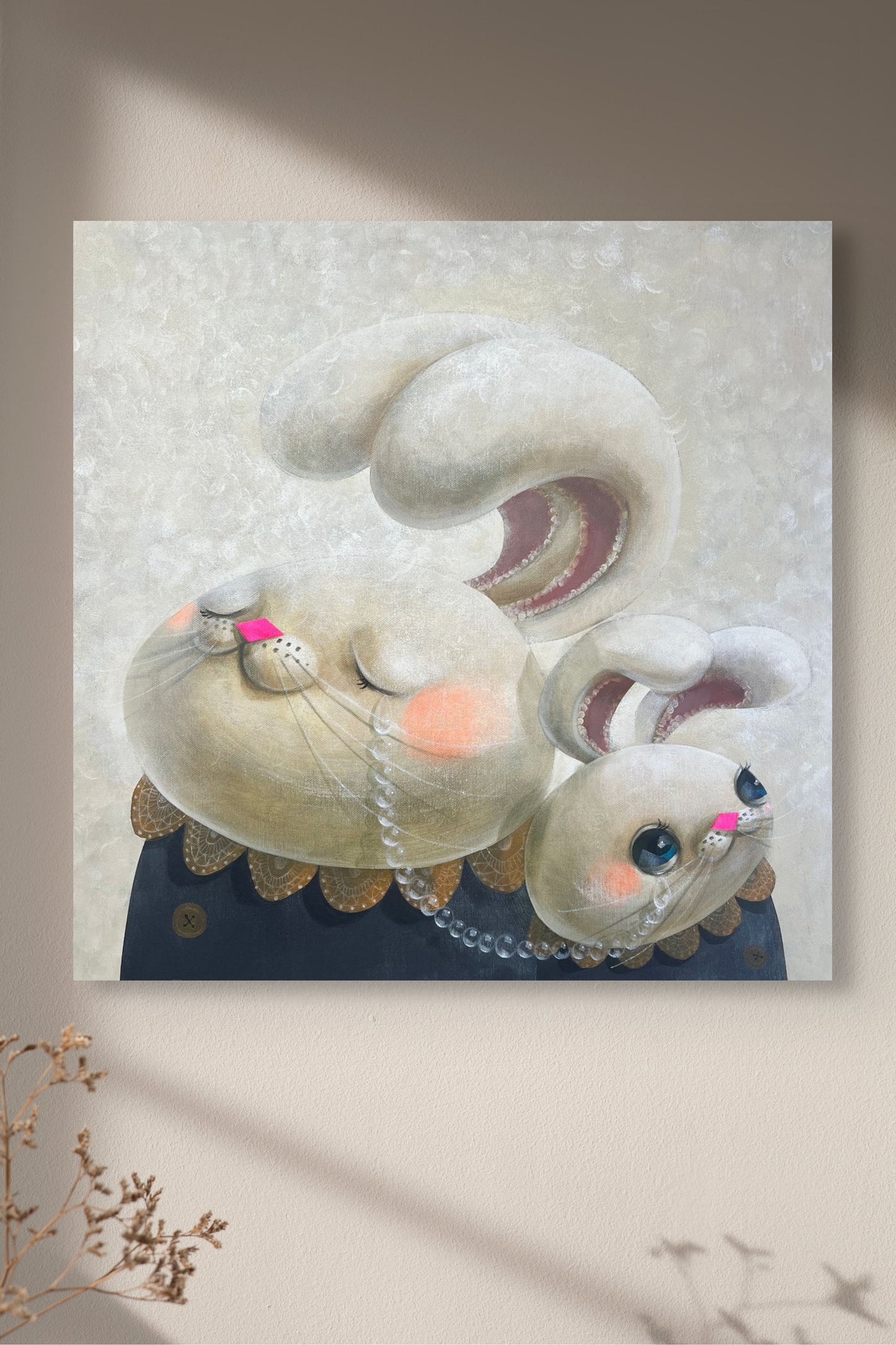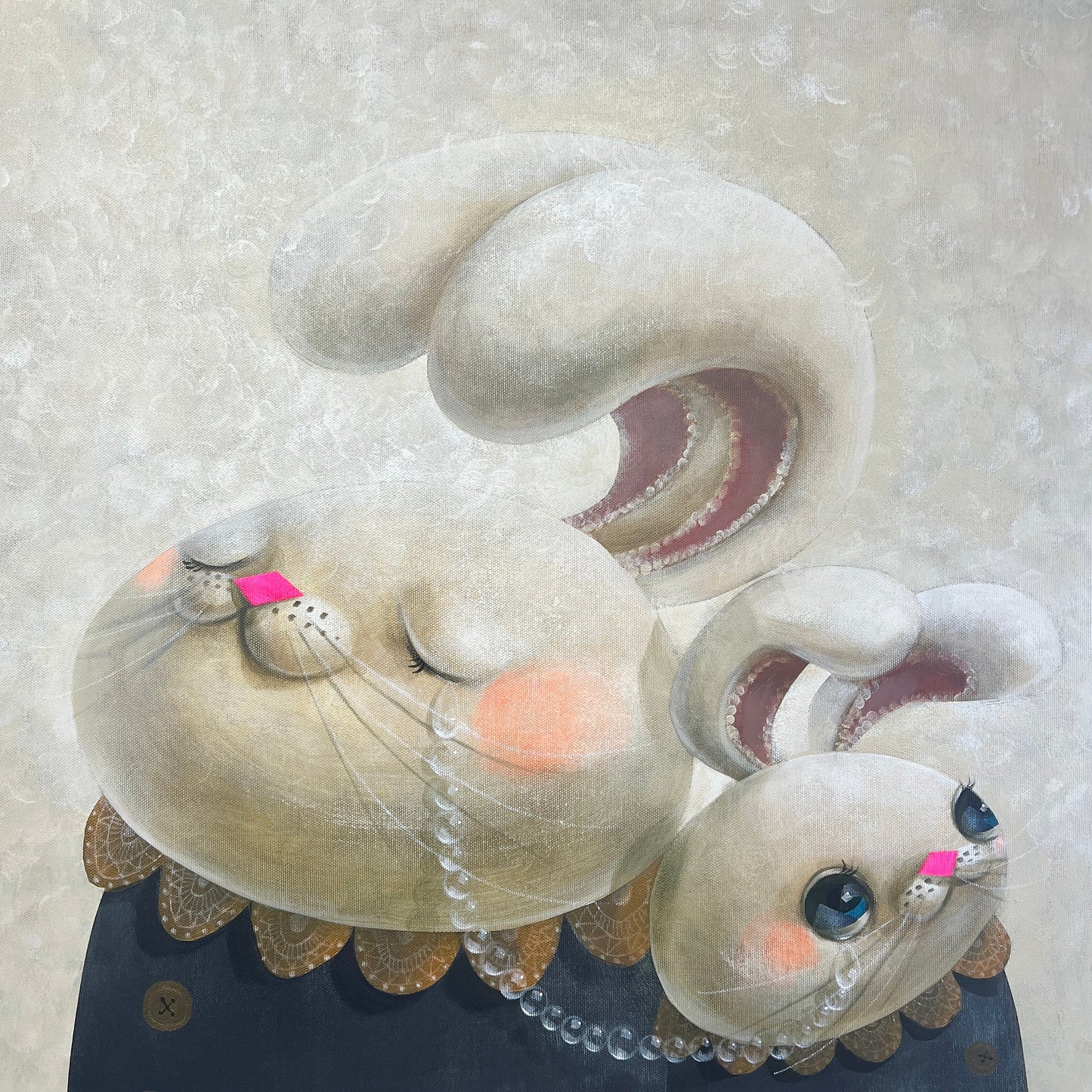 « Une querelle parent-enfant entourée de lumière » (光に包まれた親子喧嘩) d'Akio Harada montre un moment d'amour et de sincérité entre deux personnages ressemblant à des lapins, représentant un parent et sa progéniture. Le petit lapin lève les yeux avec de grands yeux expressifs, tandis que le personnage plus grand a les yeux fermés et semble tranquille. Des touches douces et délicates comme des larmes nacrées, des joues brillantes et des cols en dentelle élaborés décorent les deux. Mettant l'accent sur les concepts d'amour, de réconciliation et de compréhension au milieu du conflit, les couleurs pastel douces et l'arrière-plan brillant créent un environnement calme et éthéré. Cette œuvre d'art attachante capture parfaitement le talent d'Harada pour fusionner un design fantaisiste avec une narration.