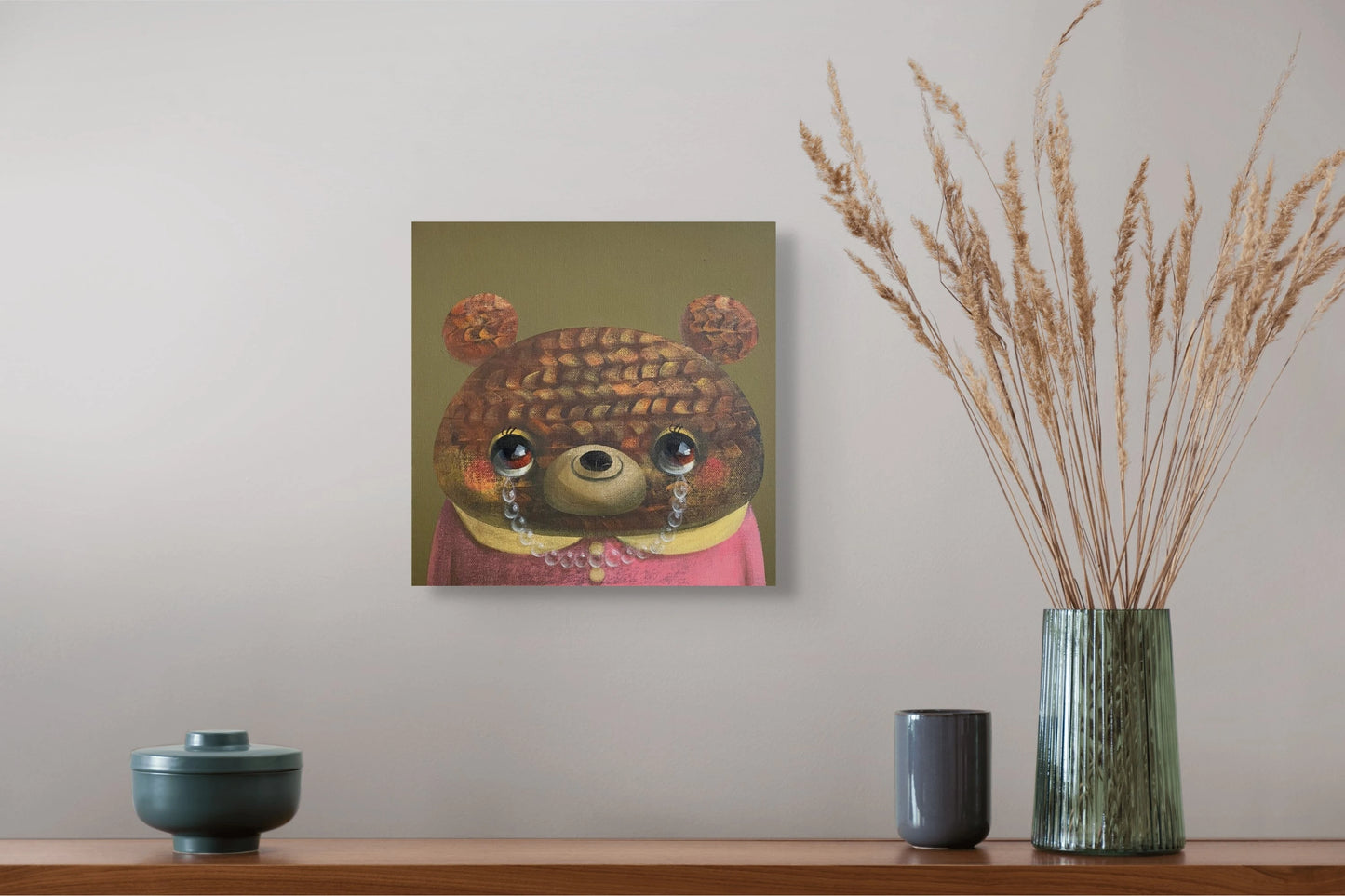 L'ours dans le tableau émouvant mais fantaisiste d'Akio Harada « Accessoires que je ne voulais pas » a une fourrure texturée et des yeux expressifs et larmoyants. L'ours, portant un délicat collier de perles, évoque des idées de beauté et de fardeaux indésirables avec son regard lugubre qui contraste avec le raffinement de ses accessoires. La délicate tenue rose de l'ours se marie bien avec le fond terreux et les tons de fourrure, donnant à l'image profondeur et confort. L'habileté d'Harada à fusionner charme et émotion donne lieu à un drame captivant qui permet aux spectateurs de s'identifier à l'histoire nuancée mais profonde de l'ours.