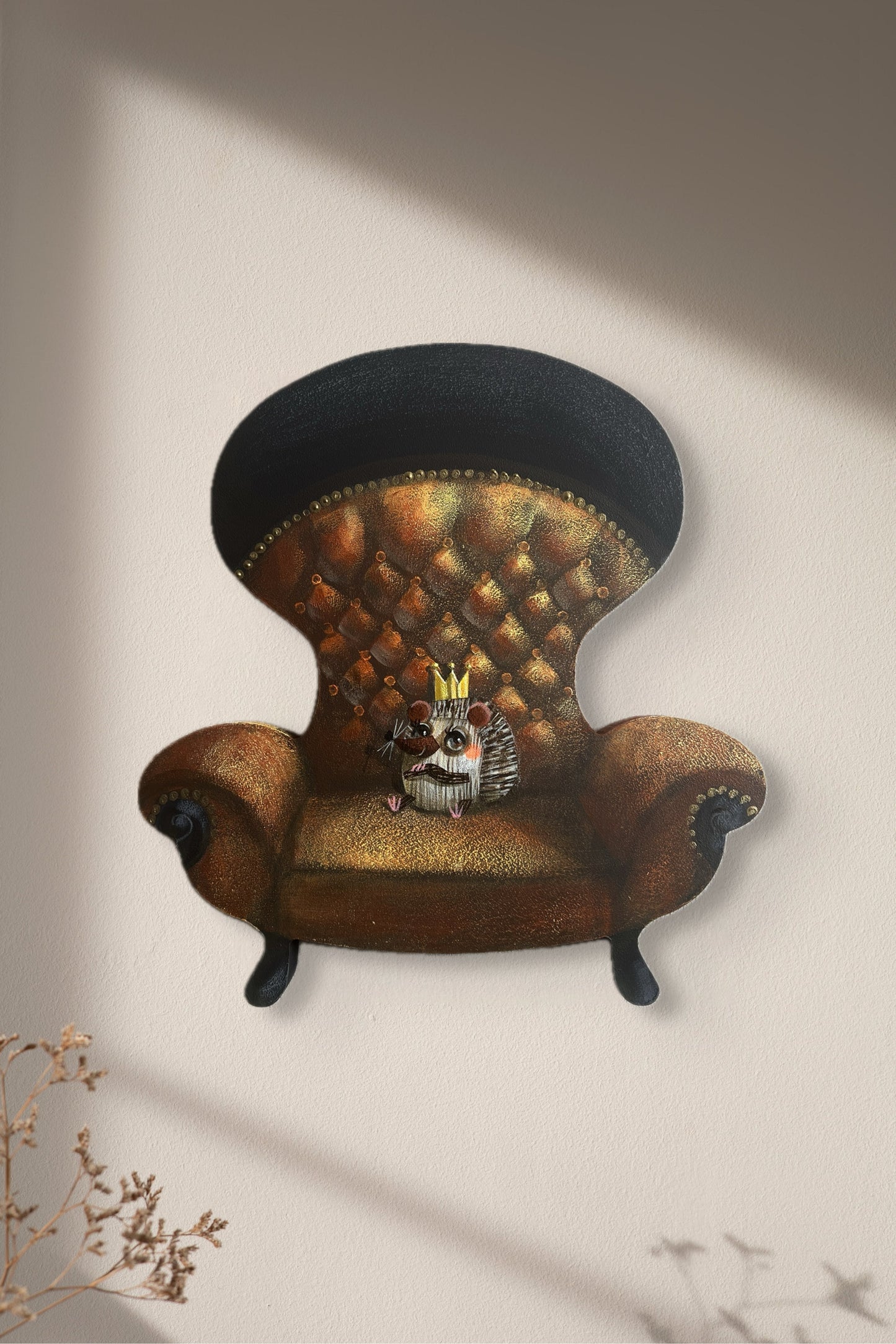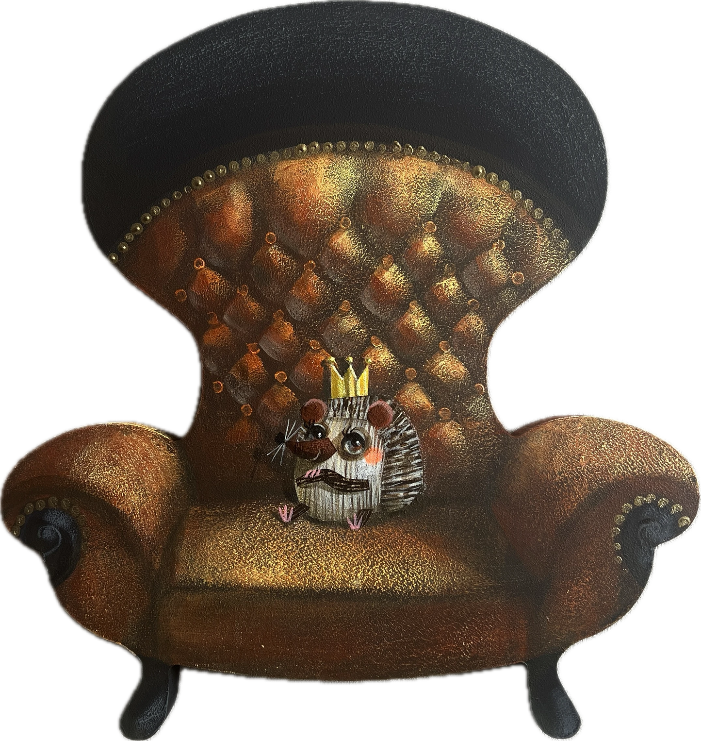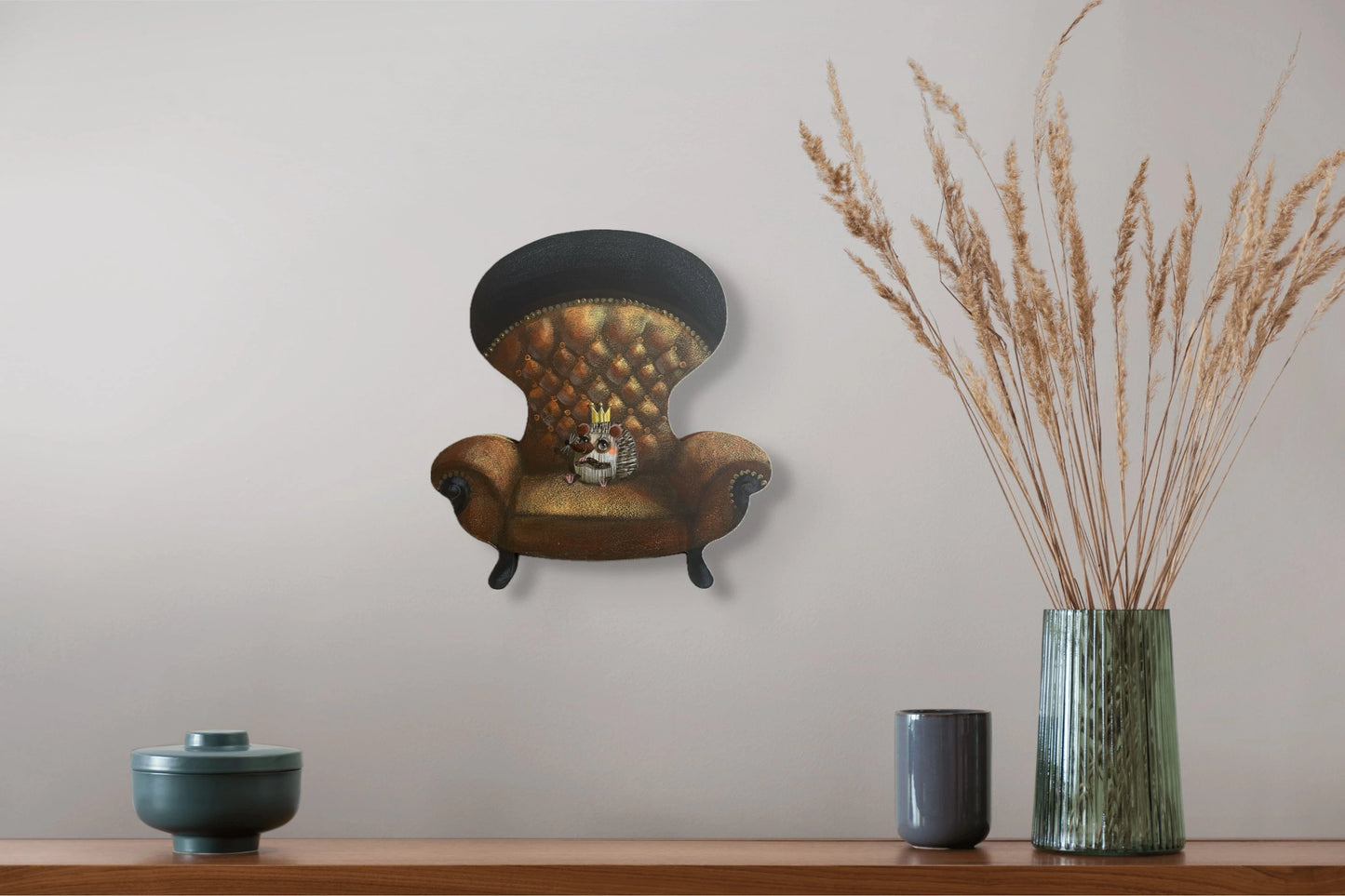 L'œuvre fantaisiste et majestueuse « Hari Chan » d'Akio Harada représente un mignon petit hérisson perché sur un fauteuil moelleux et capitonné. Avec ses joues roses et ses petites pattes roses, le hérisson, qui porte un diadème doré, brille de personnalité et de charme. La personnalité délicate et pleine d'esprit du hérisson contraste merveilleusement avec le fauteuil opulent, représenté dans des tons bruns profonds avec des décorations complexes. Cette belle peinture invite les spectateurs dans un royaume magique de charme et d'imagination, mettant en valeur le mélange distinctif d'élégance et de comédie de Harada.