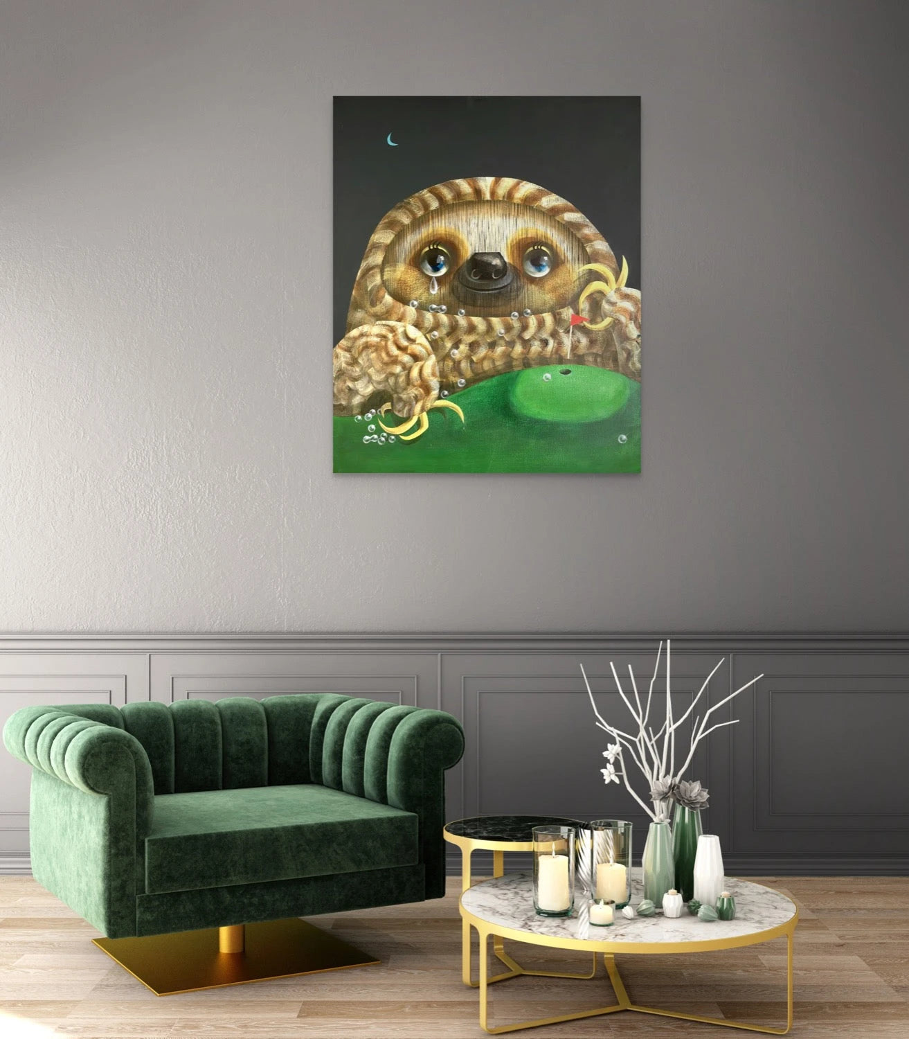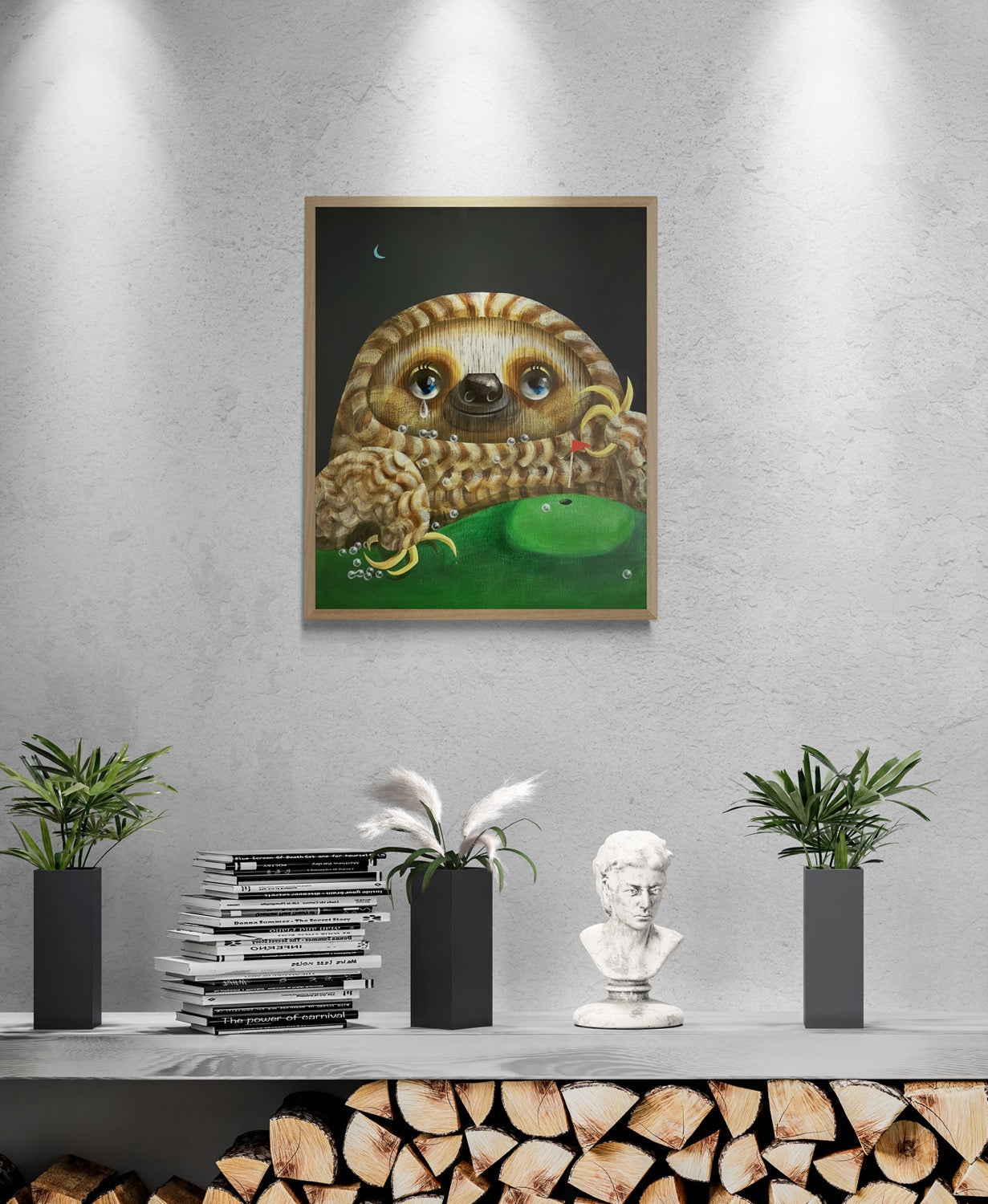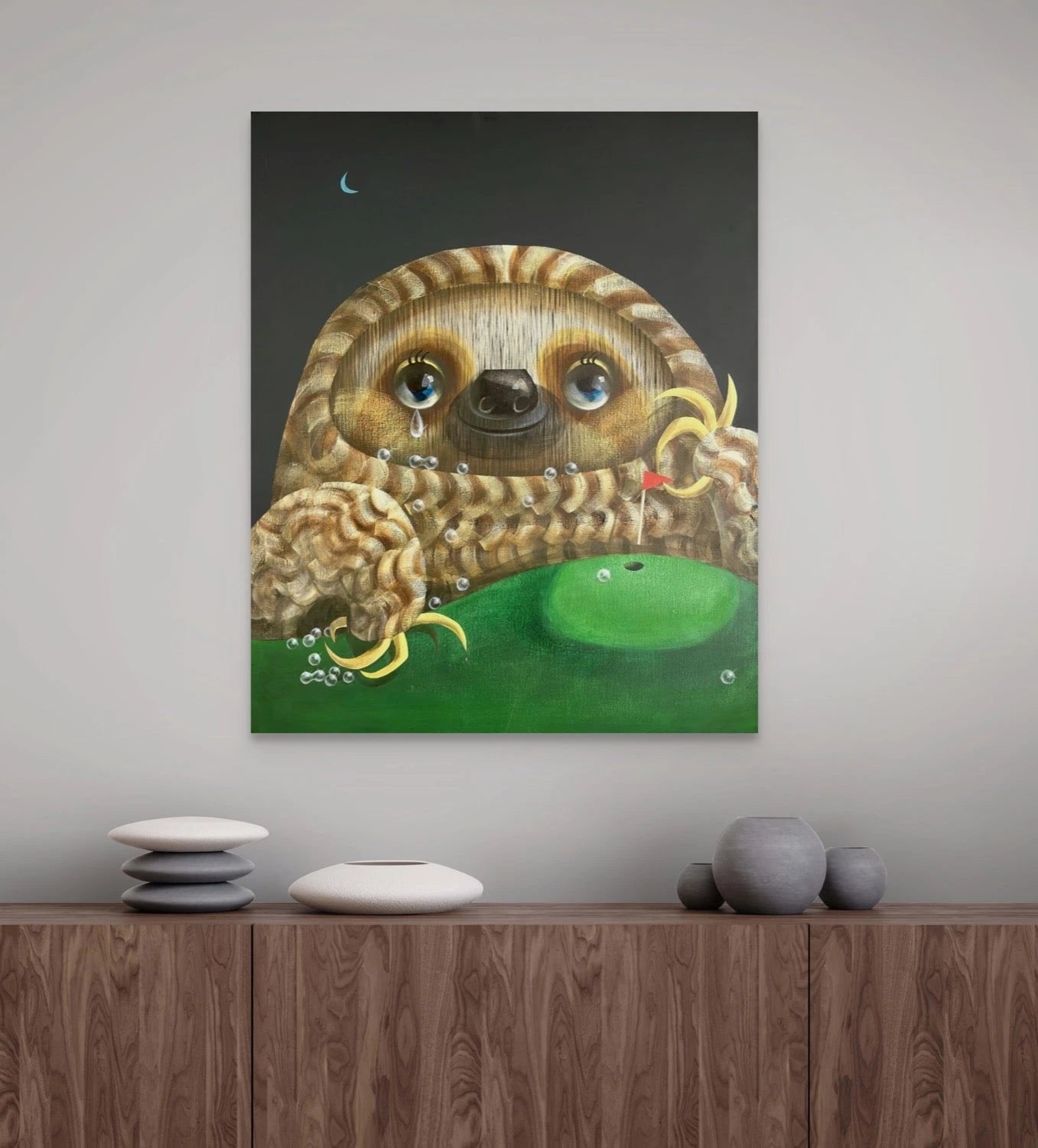 "Trou en Un de Nuit" par Akio Harada, 24"x29" pouces (60.6 x 72.7 cm), présente un paysage émotionnel avec un paresseux en larmes, un parcours de golf éclairé par la lune, et un drapeau triomphant, mêlant sport et sentiment.