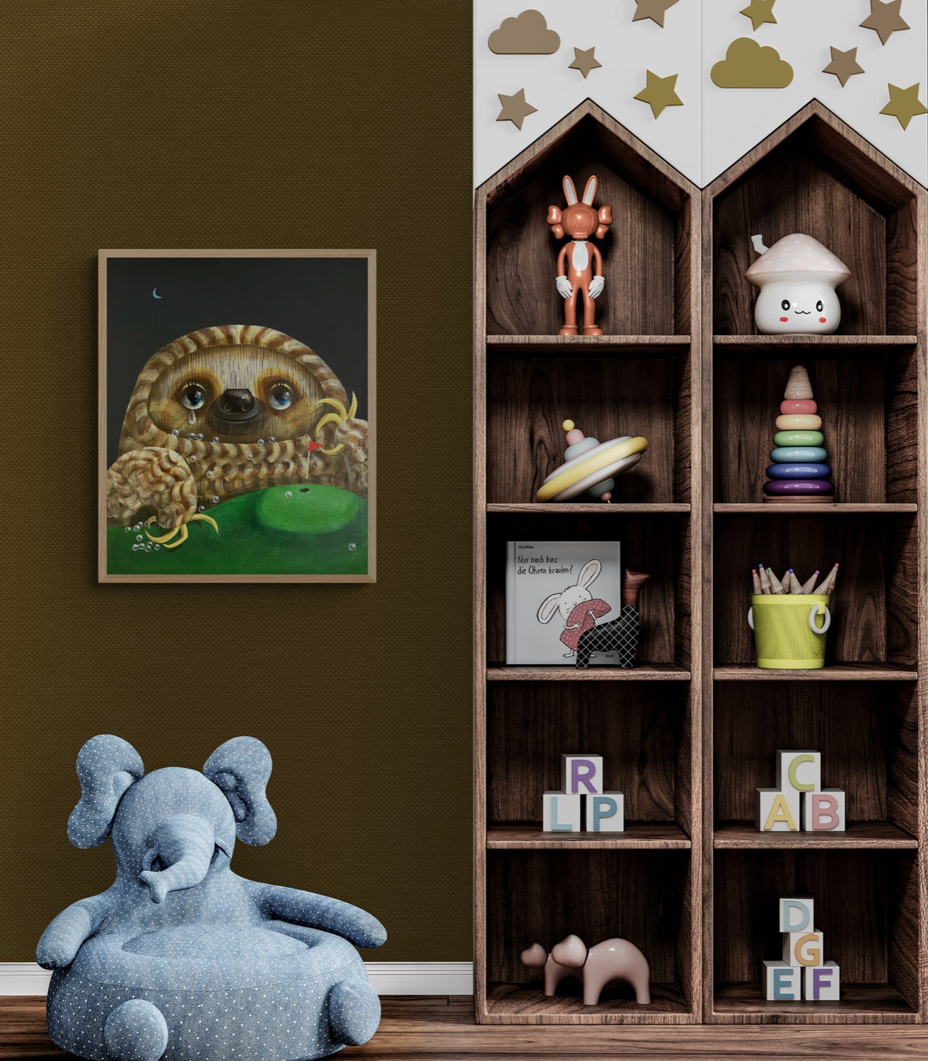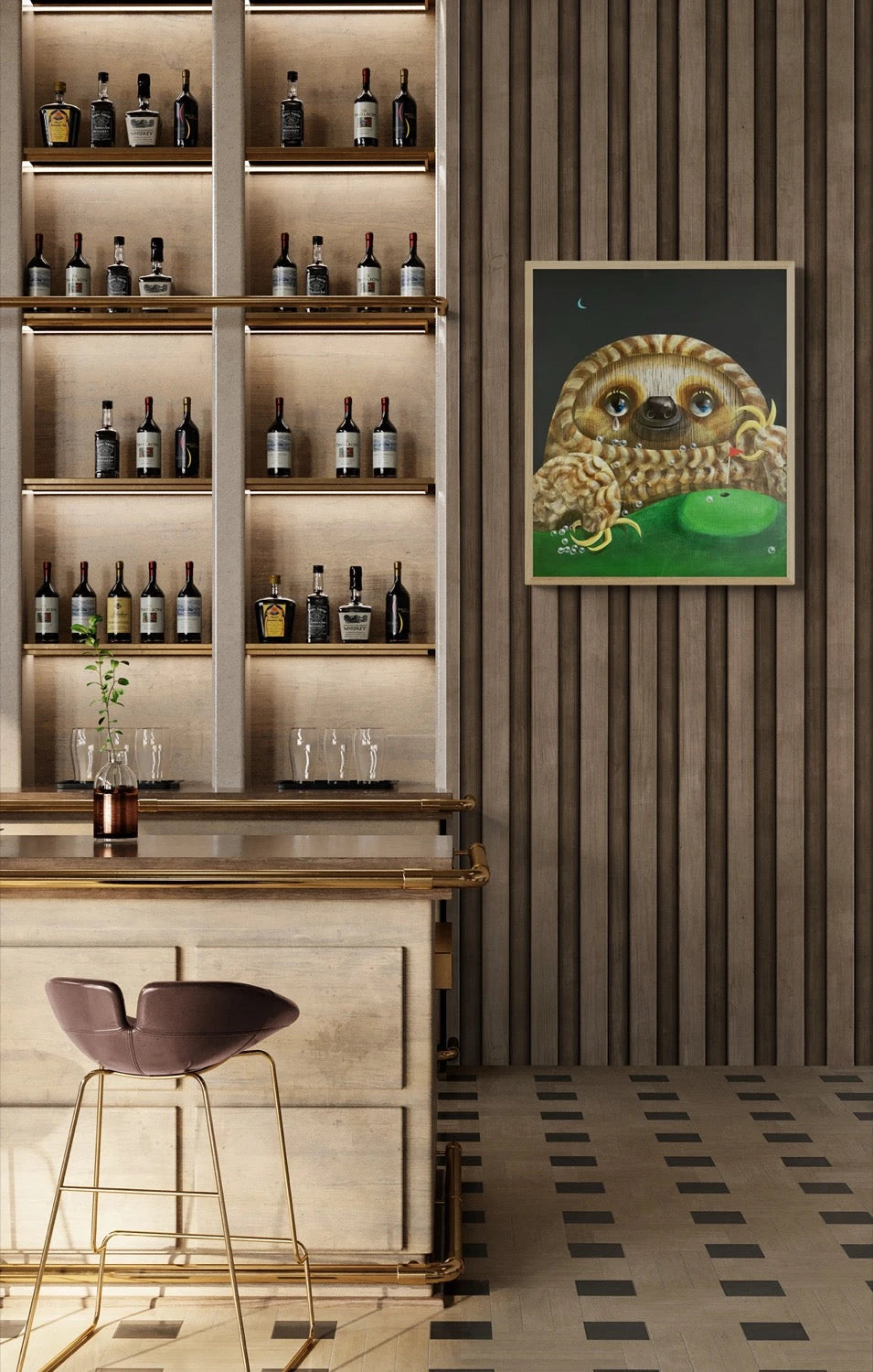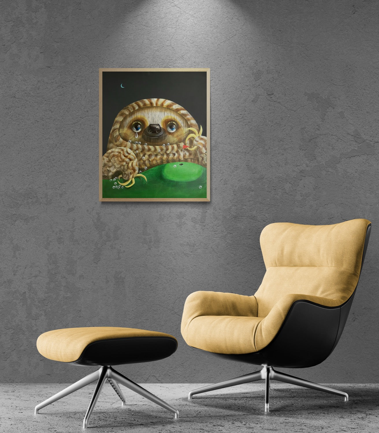"Trou en Un de Nuit" par Akio Harada, 24"x29" pouces (60.6 x 72.7 cm), présente un paysage émotionnel avec un paresseux en larmes, un parcours de golf éclairé par la lune, et un drapeau triomphant, mêlant sport et sentiment.