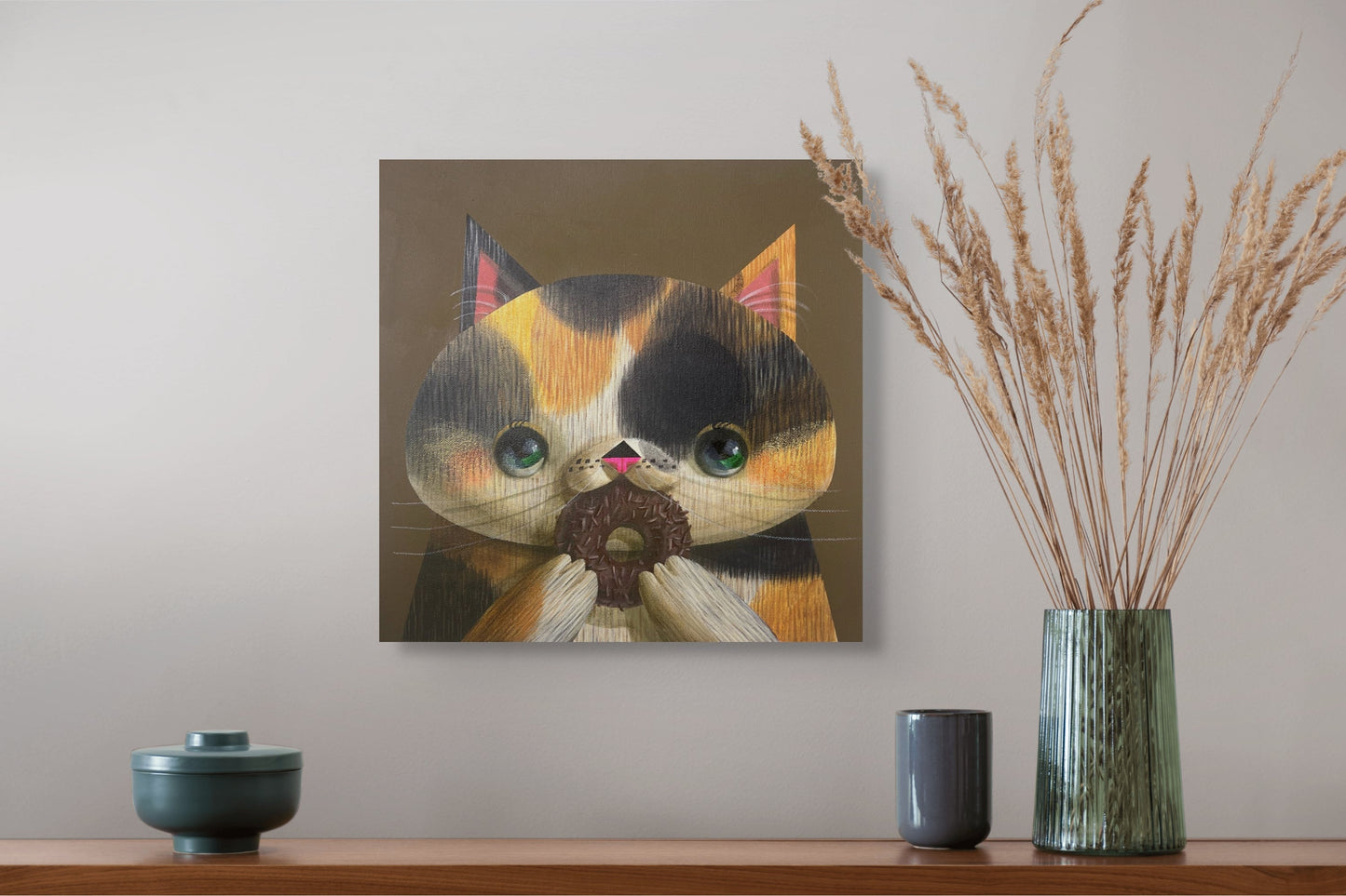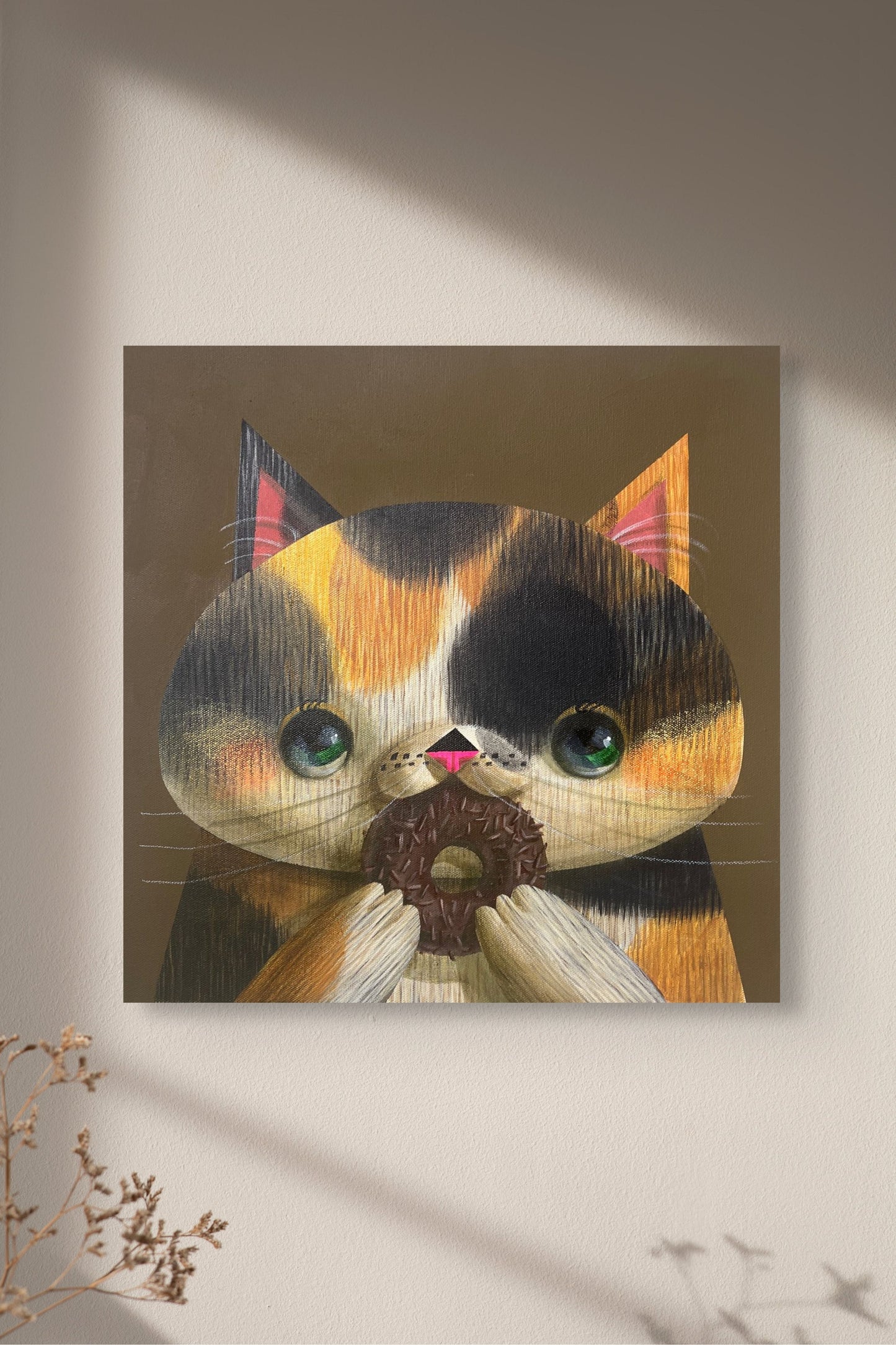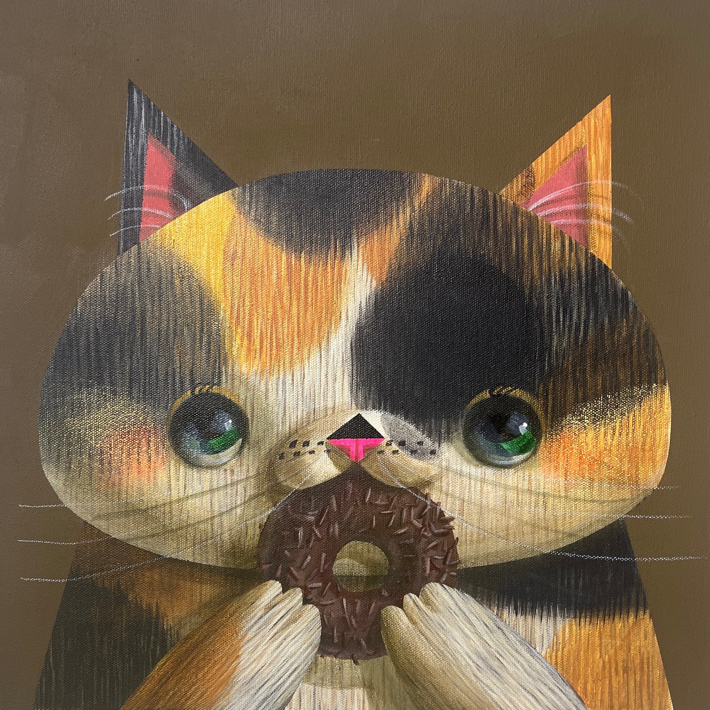 Un chaton calico tenant un beignet enrobé de chocolat est le sujet de la peinture attachante et fantaisiste « Invitation to My Mouth » d'Akio Harada. Tandis qu'il regarde devant lui, les grands yeux verts du chat et son joli nez rose rayonnent de joie et de curiosité, entraînant l'observateur dans son moment de plaisir. Le fond marron chaud accentue l'ambiance chaleureuse et accueillante, tandis que les textures détaillées de la fourrure du chat et les paillettes du beignet apportent profondeur et réalisme. Dans cette œuvre charmante et attachante, l'habileté d'Harada à capturer à la fois la fantaisie et le détail est évidente.
