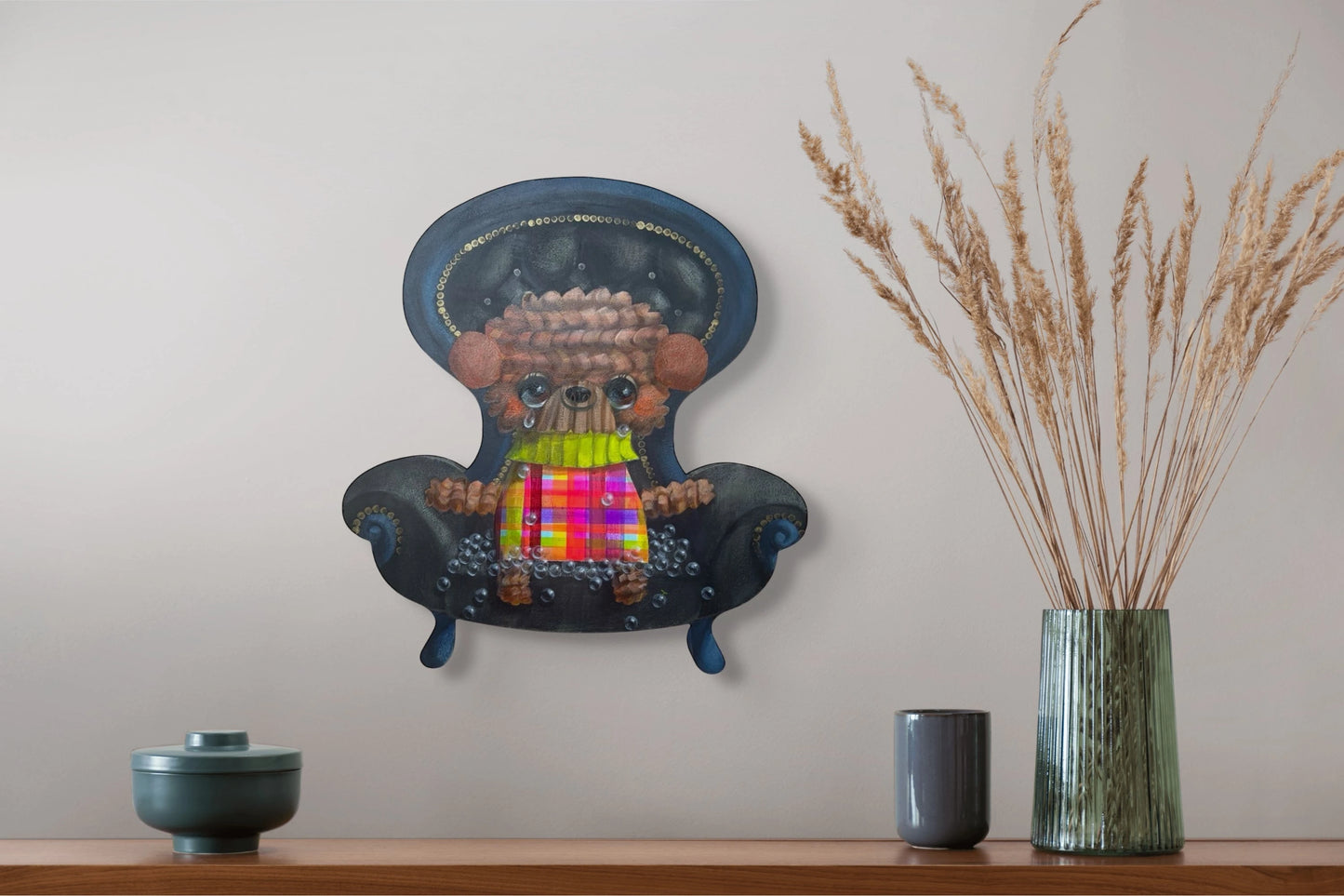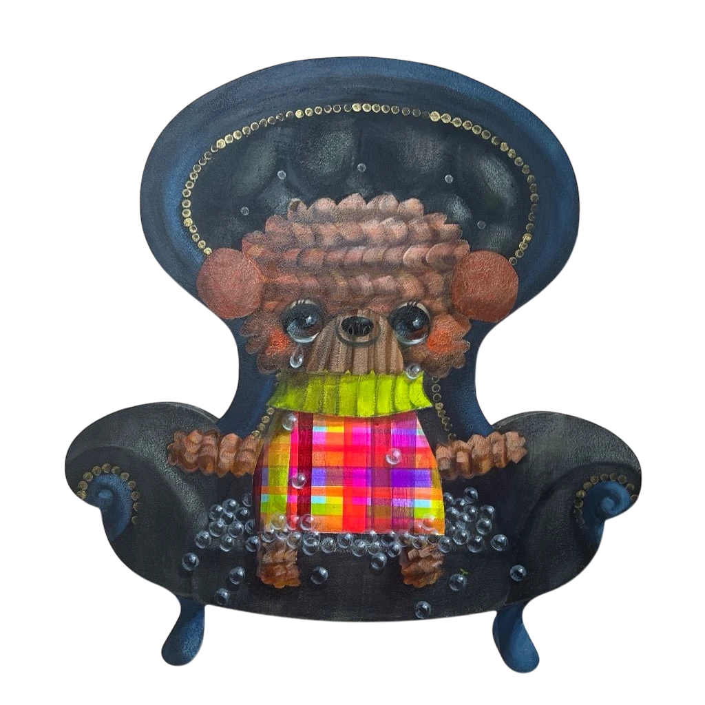La scène étrange et légère de « Time Machine Here Too » tourne autour d'une petite créature câline assise dans un énorme fauteuil élaboré. Avec des caractéristiques similaires à celles d'un ours en peluche, la créature a des yeux brillants et expressifs et une écharpe à carreaux multicolores et chaleureuse qui se détache sur sa fourrure brune et texturée. Une atmosphère rêveuse et nostalgique est créée par le fauteuil noir, qui est orné de bulles et de clous argentés, ajoutant une touche fantaisiste et fantastique. Le tableau transmet des sentiments de confort et d'attrait intemporel tout en suscitant l'émerveillement et la curiosité.