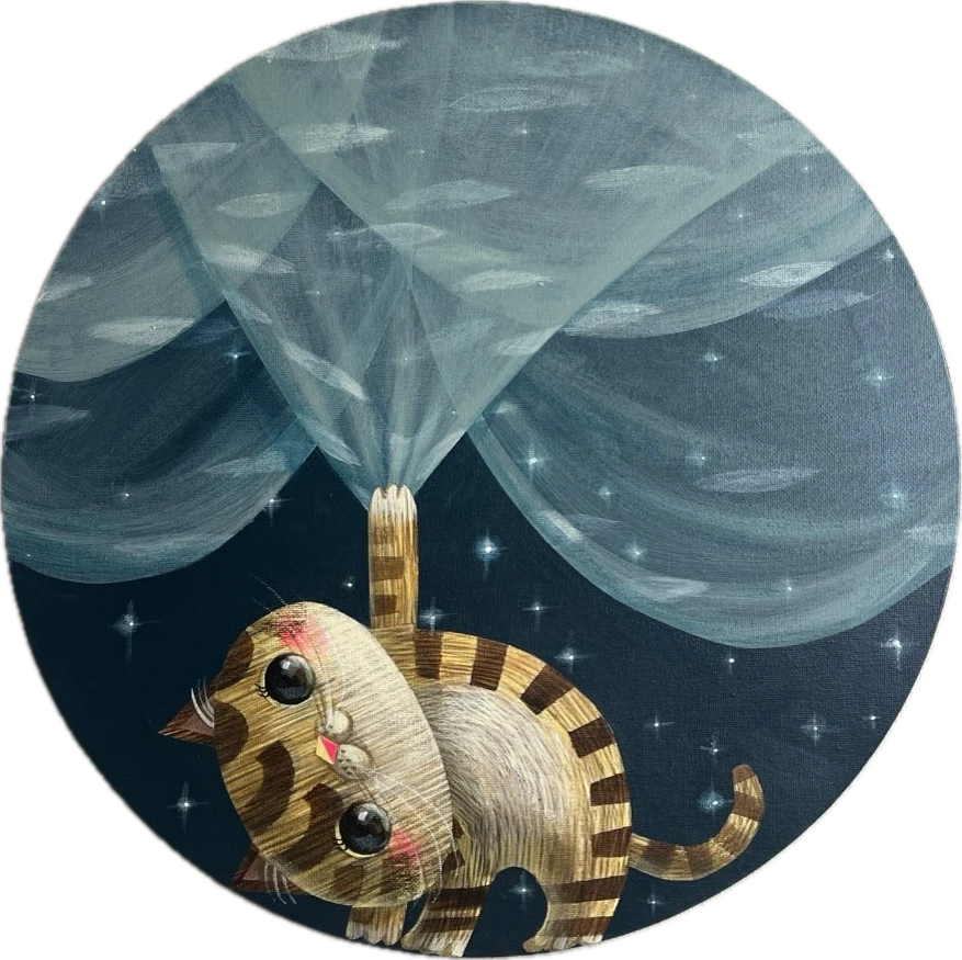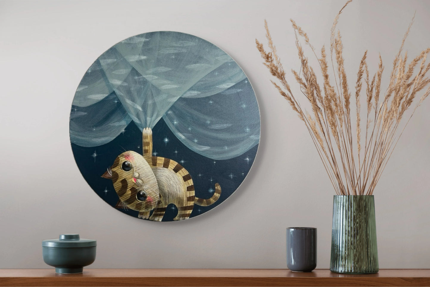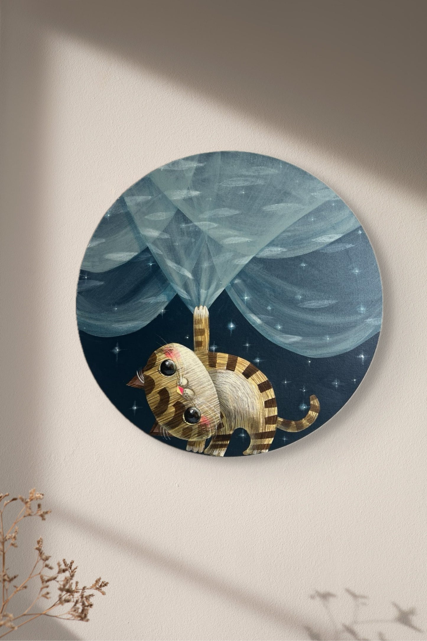 L'amusant chat rayé de cette peinture circulaire unique en son genre d'Akio Harada a de grands yeux expressifs. Suspendu de manière ludique, le chat semble s'accrocher à un rideau translucide sur fond de ciel nocturne surréaliste rempli de motifs duveteux ressemblant à des nuages et d'étoiles scintillantes. La composition met en valeur l'attention particulière d'Harada aux détails et son style de narration léger tout en fusionnant une touche de fantaisie avec une ambiance charmante et joyeuse. Pour les amoureux des chats et ceux qui apprécient les œuvres d'art créatives, la toile ronde ajoute à l'ambiance aérienne et harmonieuse de la sculpture, ce qui en fait une belle œuvre d'art.