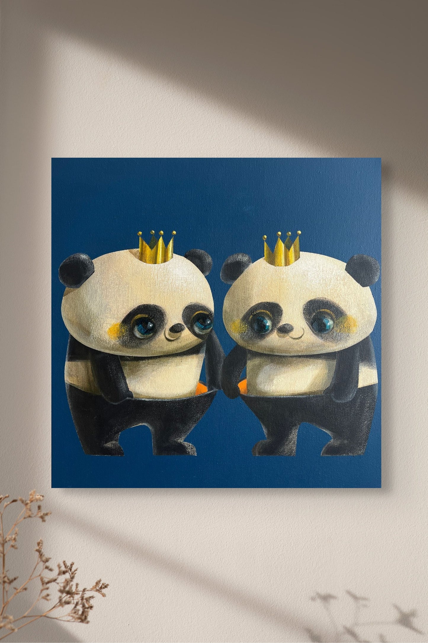 L'œuvre d'Akio Harada, « Two Champions », met en scène un adorable couple de pandas portant des couronnes dorées et se tenant la main en signe de solidarité et d'amitié. La fourrure soyeuse noire et blanche des pandas est représentée avec une texture et des couleurs complexes, et leurs grands yeux scintillants et leurs doux sourires respirent le bonheur et un sens de la communauté. Les pandas et leurs couronnes symboliques de réussite sont mis en valeur par le fort contraste créé par le fond bleu vif. Cette œuvre d'art attachante rend hommage à l'amitié et aux triomphes partagés par tous, capturant parfaitement la capacité distinctive d'Harada à combiner un design fantaisiste avec un récit poignant.