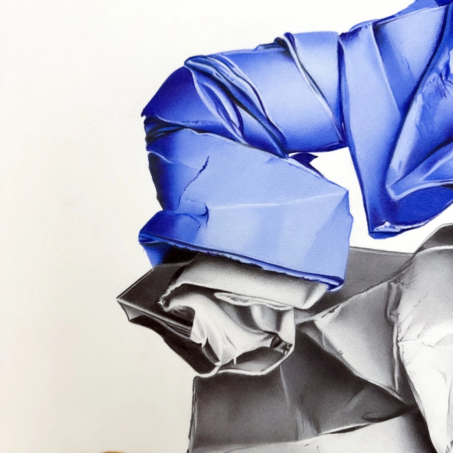 Ma démarche ne consiste pas à me contenter de reproduire ce que je vois. Je sélectionne et j’étudie d’abord soigneusement mon sujet, puis, au studio, je le déforme, je le sublime, je l’immerge, je donne à une surface solide un aspect liquide, je le casse ou je le reconstruis en le fusionnant avec d’autres objets… Je prends ensuite des dizaines de photos pour trouver l’image parfaite, en soignant la composition et le contraste ombre-lumière. Je réalise alors mon dessin à l’aide de crayons de couleur à pigment intense ou de stylos à encre noire ; j’en utilise souvent plusieurs pour chaque illustration, en superposant des couches de traits chaotiques jusqu’à obtenir la nuance idéale dans les moindres détails.