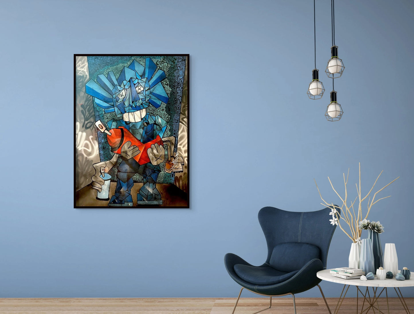 L'arrière-plan prend vie avec une gamme dynamique de gribouillages et de graffitis, créant une atmosphère urbaine. Cette pièce sert de commentaire sur le monde en constante évolution du street art, mettant en évidence la relation symbiotique entre les artistes et leurs outils.