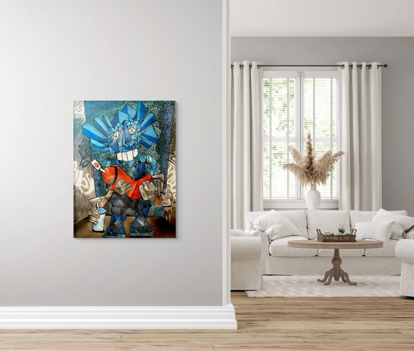 Dans "La vie en Kaws", Aket livre une toile captivante de 142 x 109 cm qui mélange de manière unique le personnage emblématique de KAWS avec une touche ludique du street art. Au centre du tableau, le célèbre personnage bleu de KAWS tient tendrement une bombe aérosol orange ressemblant à un humain avec des bras, des jambes et une tête en forme de buse de pulvérisation.