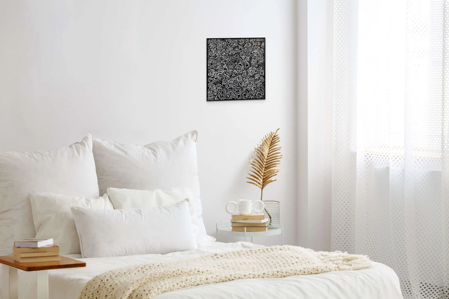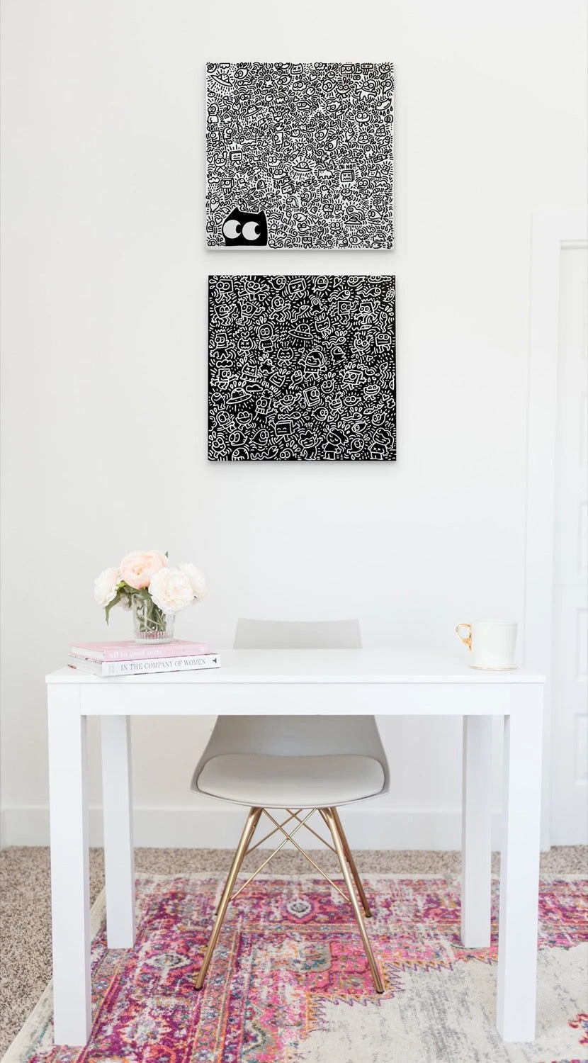 "OFF TOPIC"de BBQUEEN est une pièce visuellement convaincante de 16 x 16 pouces qui défie les conventions de manière ludique. Au centre de ce tableau vibrant se trouve le"Chat confus", le personnage emblématique de BBQUEEN, qui semble englouti dans un discours animé de gribouillages environnants. Cette œuvre d'art, rendue à l'acrylique et au marqueur, vibre avec l'énergie de la créativité spontanée, mettant le spectateur au défi de trouver une cohérence dans le délicieux chaos. Chaque doodle semble raconter sa propre histoire, mais le « Chat confus » reste le fil conducteur, incarnant le commentaire signature de l'artiste sur la nature fortuite des distractions de la vie.
