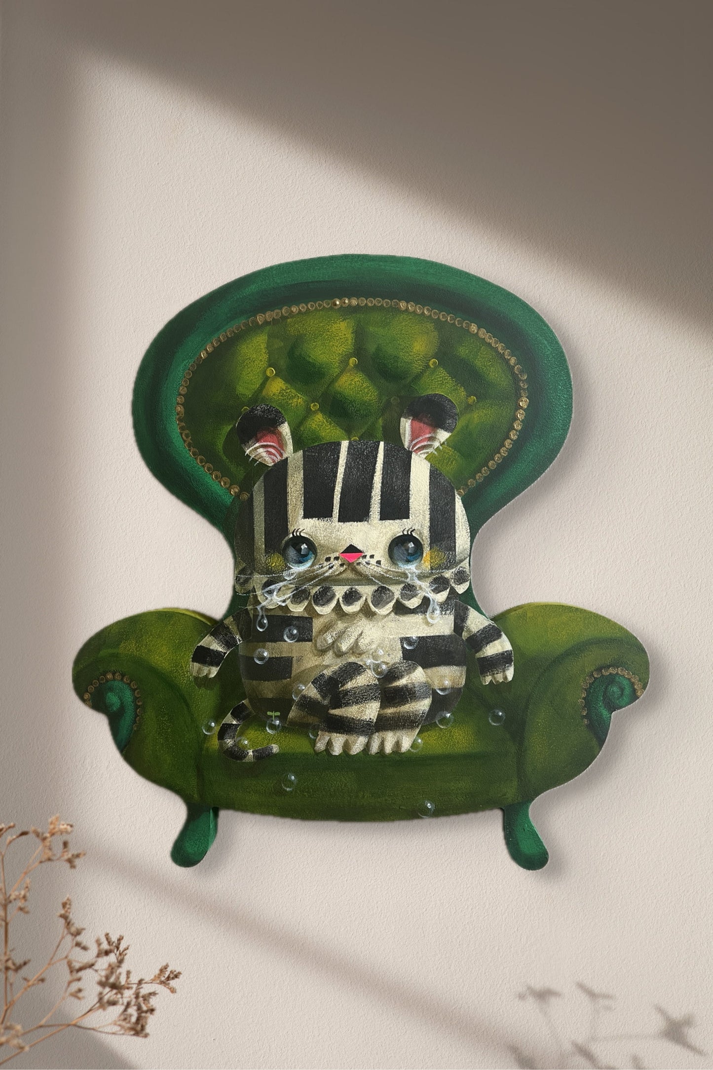 « Seeds of Beginning » d'Akio Harada représente une créature fantaisiste, rayée, élégante et amusante, assise sur un grand fauteuil vert. L'animal semble être l'incarnation de la curiosité et de l'innocence en raison de ses grands yeux expressifs et de sa fourrure rayée et duveteuse. Il est entouré de bulles délicates qui dégagent une atmosphère mystique et surréaliste. L'histoire est renforcée par le fauteuil vert capitonné aux accents dorés, qui crée un cadre à la fois royal et confortable. Le mélange de beauté et d'imagination de l'œuvre est merveilleusement complété par le titre, qui évoque des concepts de croissance, de nouveaux départs et de doux moments.