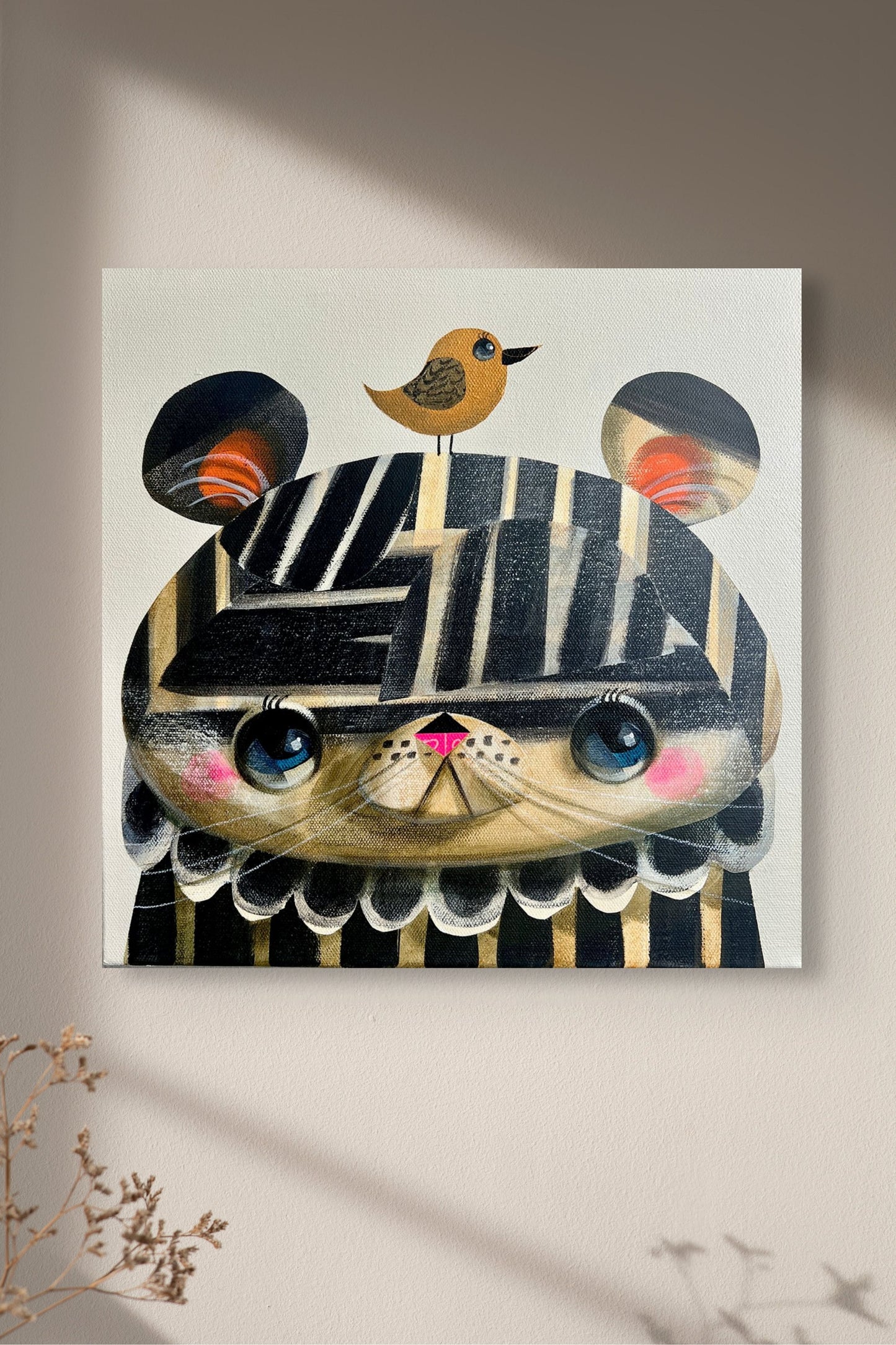 L'œuvre intrigante et fantaisiste « Mr. Collage at 2pm » d'Akio Harada met en scène un chat rayé aux motifs géométriques complexes, orné de joues roses et d'yeux bleus brillants. Un adorable oiseau brun se perche au sommet de la tête du chat, donnant à l'œuvre d'art un récit léger. Les rayures frappantes sont complétées par le délicat motif en dentelle autour du cou du chat, qui établit un équilibre entre style et jeu. Les textures complexes et les couleurs vives des personnages sont animées par le fond beige discret. Le style propre à Harada est évident, fusionnant habilement sophistication, espièglerie et charme.