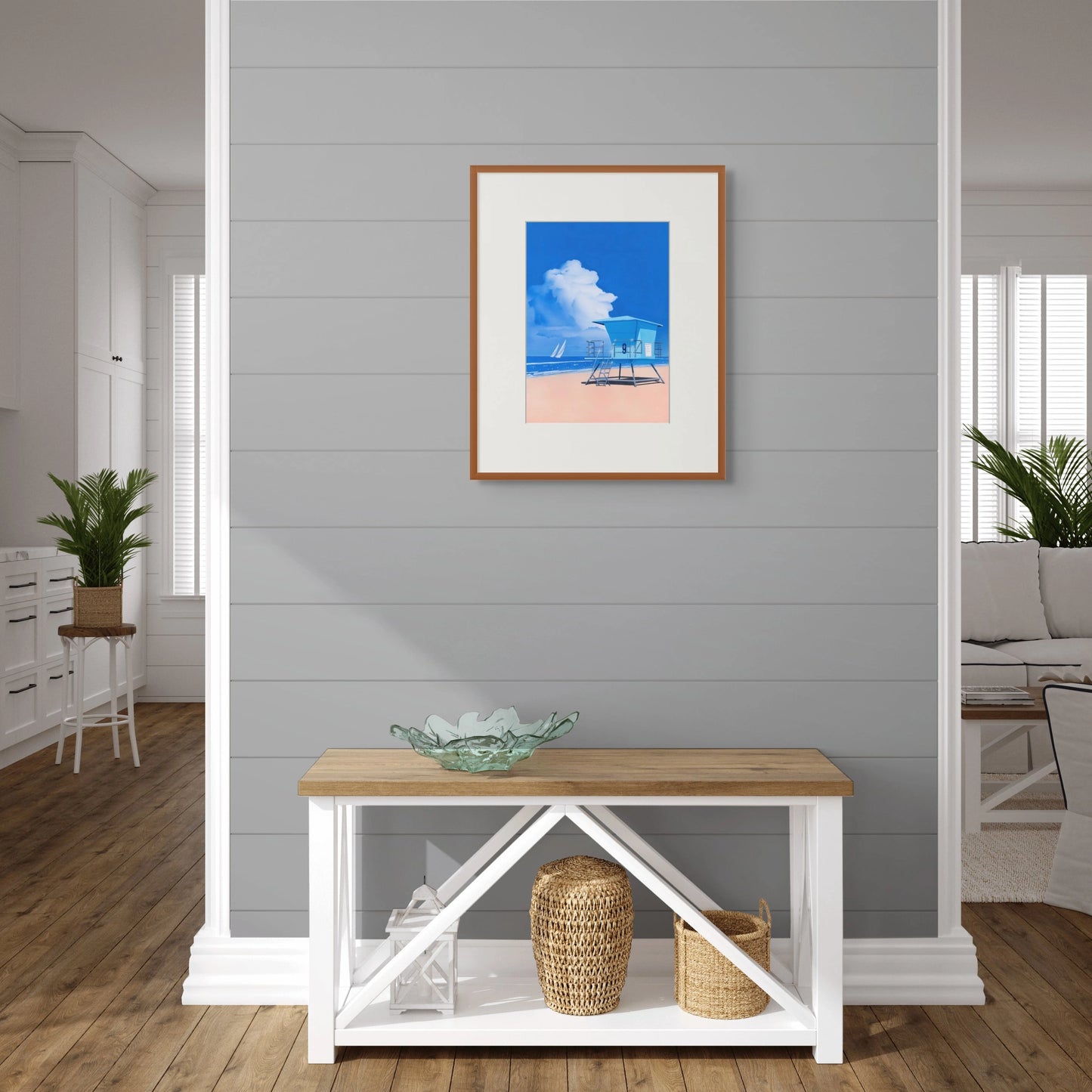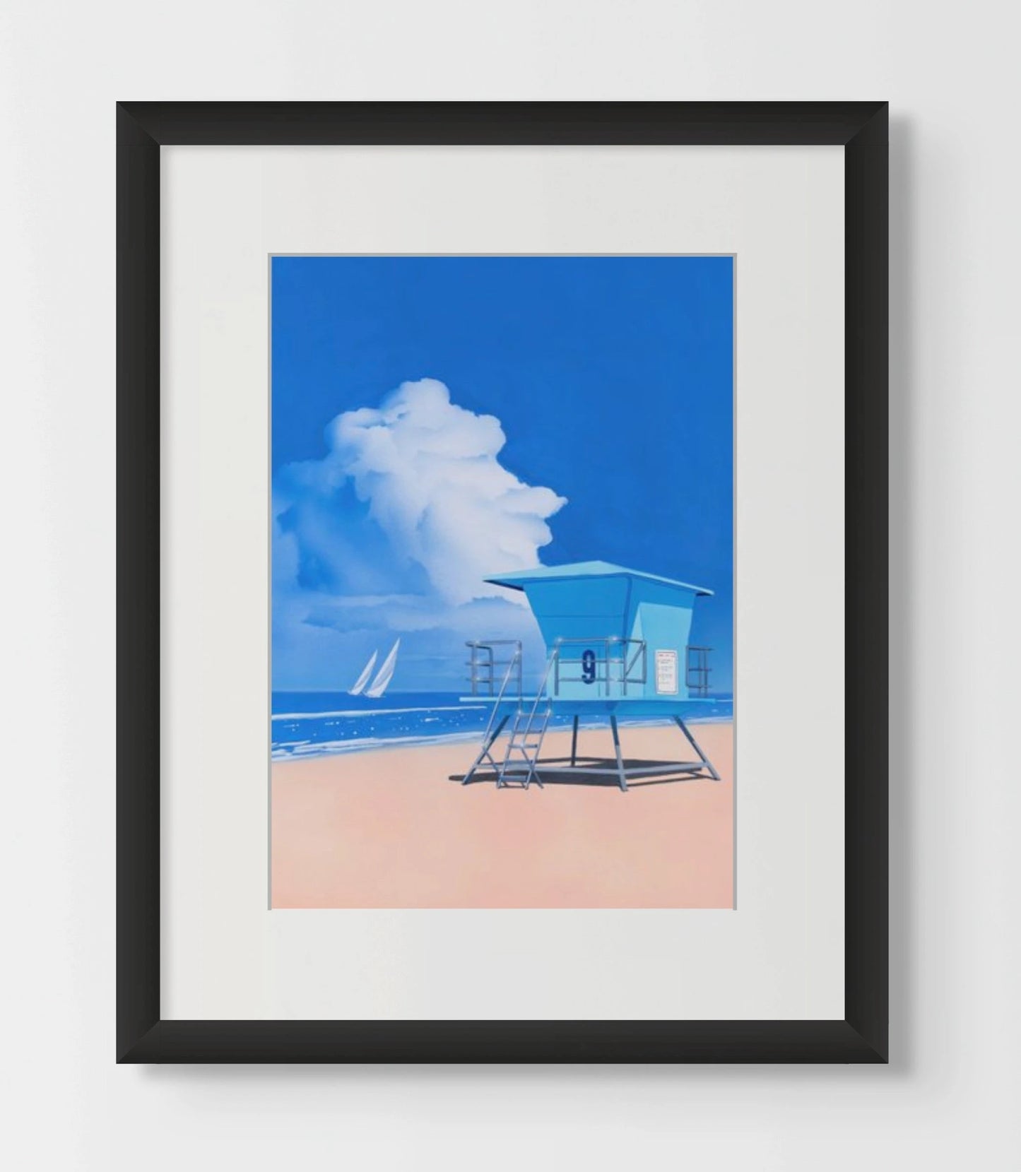 La tour de surveillance II de Bern Foster est une peinture faite à la main sur papier Canson qui capture avec vivacité la beauté sereine d'une scène côtière, dominée par une tour de surveillance bleu vif fermement perchée sur une plage de sable. La tour, marquée du chiffre « 9 », se dresse telle une sentinelle solitaire sur un ciel azur qui se reflète dans les vagues tranquilles de l'océan qui viennent lécher le rivage.