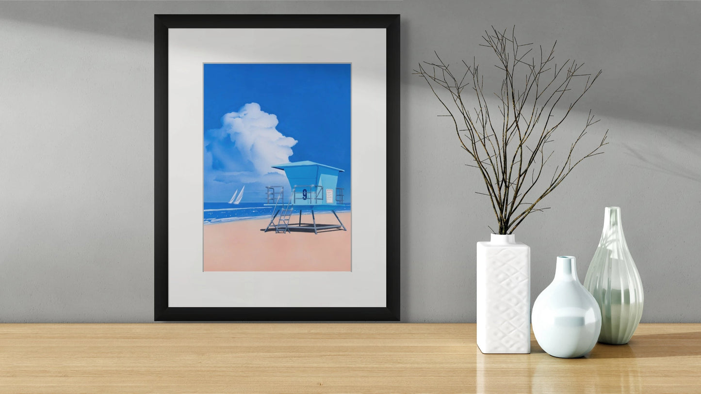 Les teintes vibrantes du bleu et les lignes nettes et épurées de la tour et de son environnement confèrent à l'œuvre un sentiment de calme et de clarté. En arrière-plan, l'océan est ponctué par l'élégance simple de deux voiliers blancs glissant gracieusement sur l'eau, évoquant un sentiment de liberté et d'aventure. L'artiste a magistralement rendu le grand nuage ondulant qui occupe le quadrant supérieur gauche de la toile, sa texture douce et duveteuse contrastant magnifiquement avec la forme anguleuse et nette de la tour de surveillance.