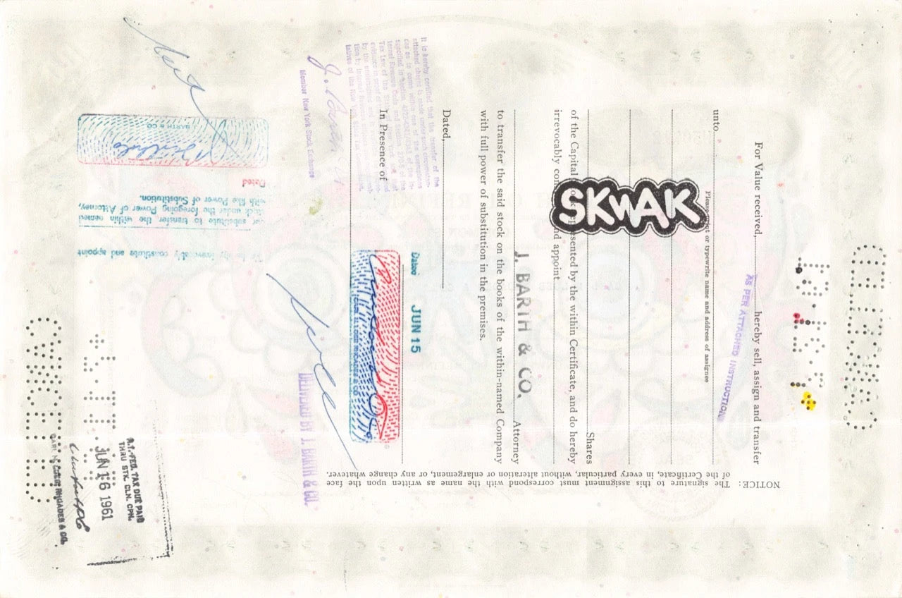 Cette œuvre d'art est une peinture originale et unique réalisée sur un authentique certificat d'actions américain vintage, joliment encadrée dans un cadre flottant de 11"x14" avec verre poli et matériel de suspension.