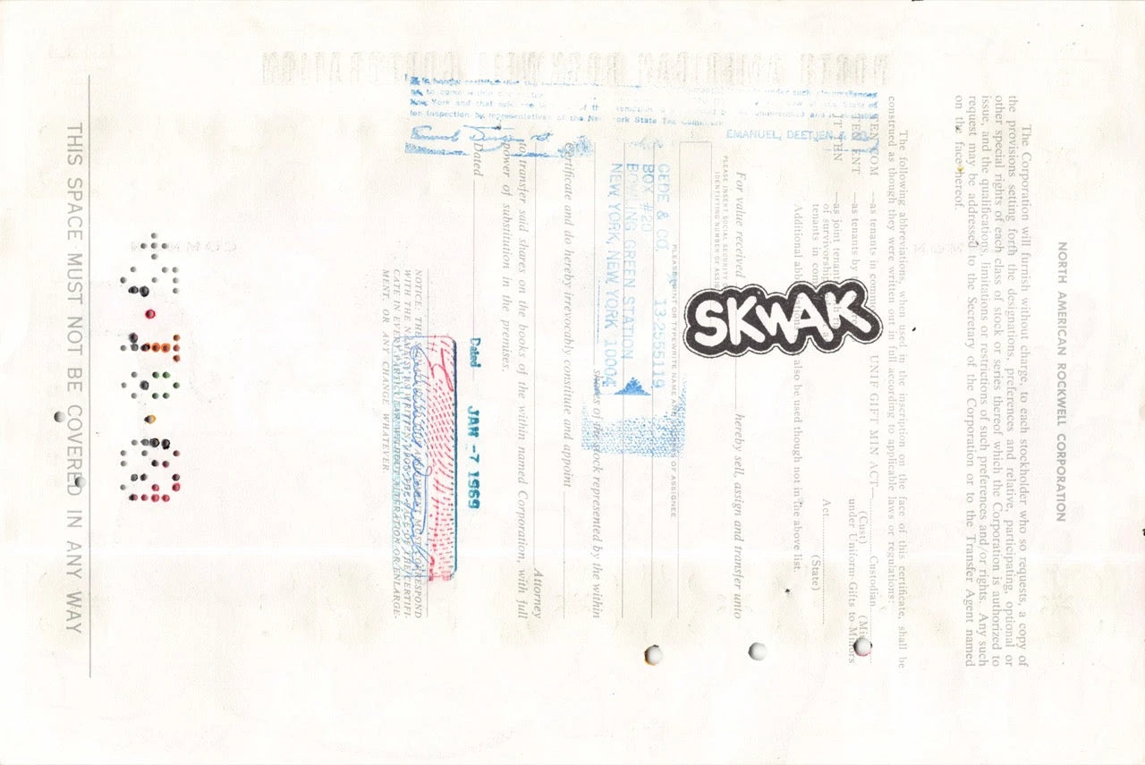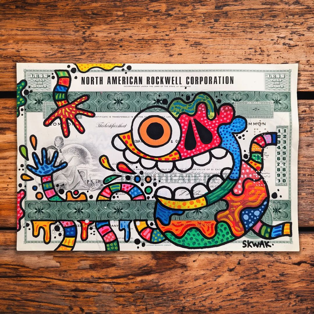 Cette œuvre d'art est une peinture originale et unique réalisée sur un authentique certificat d'actions américain vintage, joliment encadrée dans un cadre flottant de 11"x14" avec verre poli et matériel de suspension.