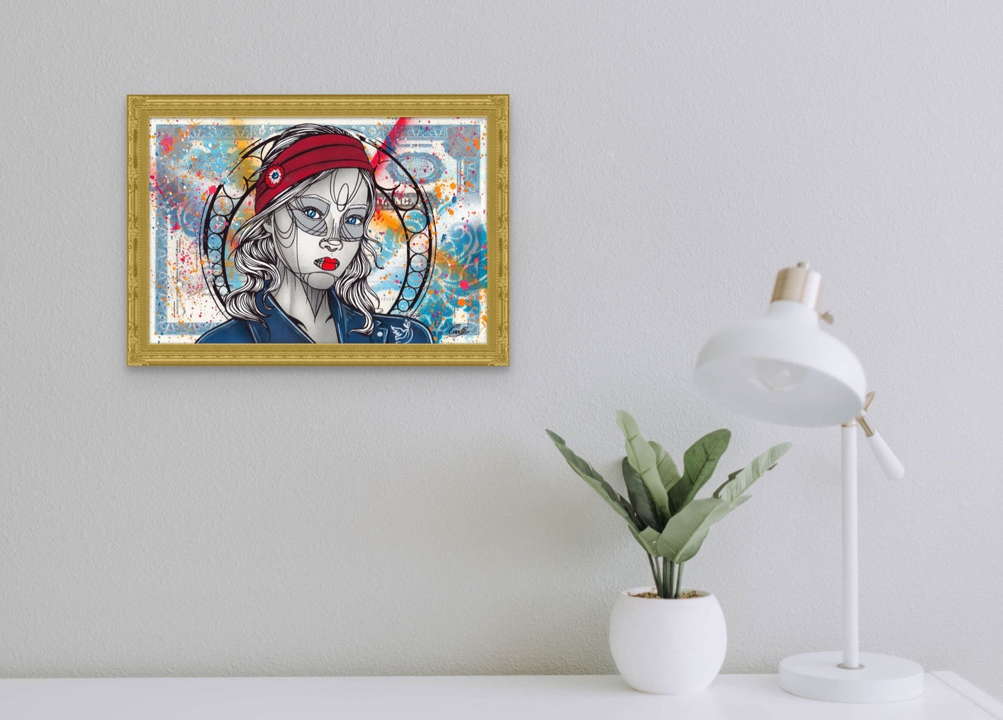 Cette œuvre d'art est une peinture originale et unique réalisée sur un authentique certificat d'actions américain vintage, joliment encadrée dans un cadre flottant de 11"x14" avec verre poli et matériel de suspension.