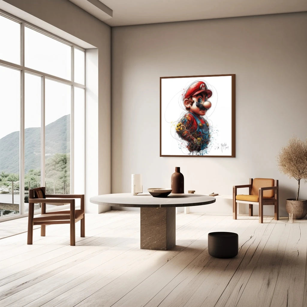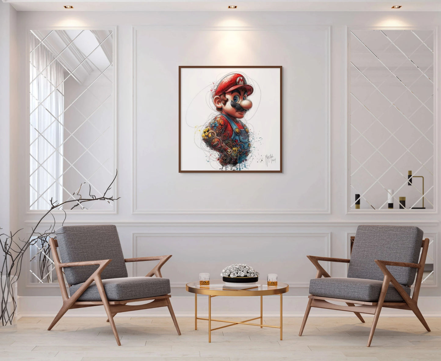 "Mario Tattoo"de Murciano réinvente le héros classique du jeu vidéo dans une toile de 120 x 120 cm (47 x 47 pouces), ornée de tatouages complexes qui évoquent une nostalgie à la fois ludique et audacieuse.