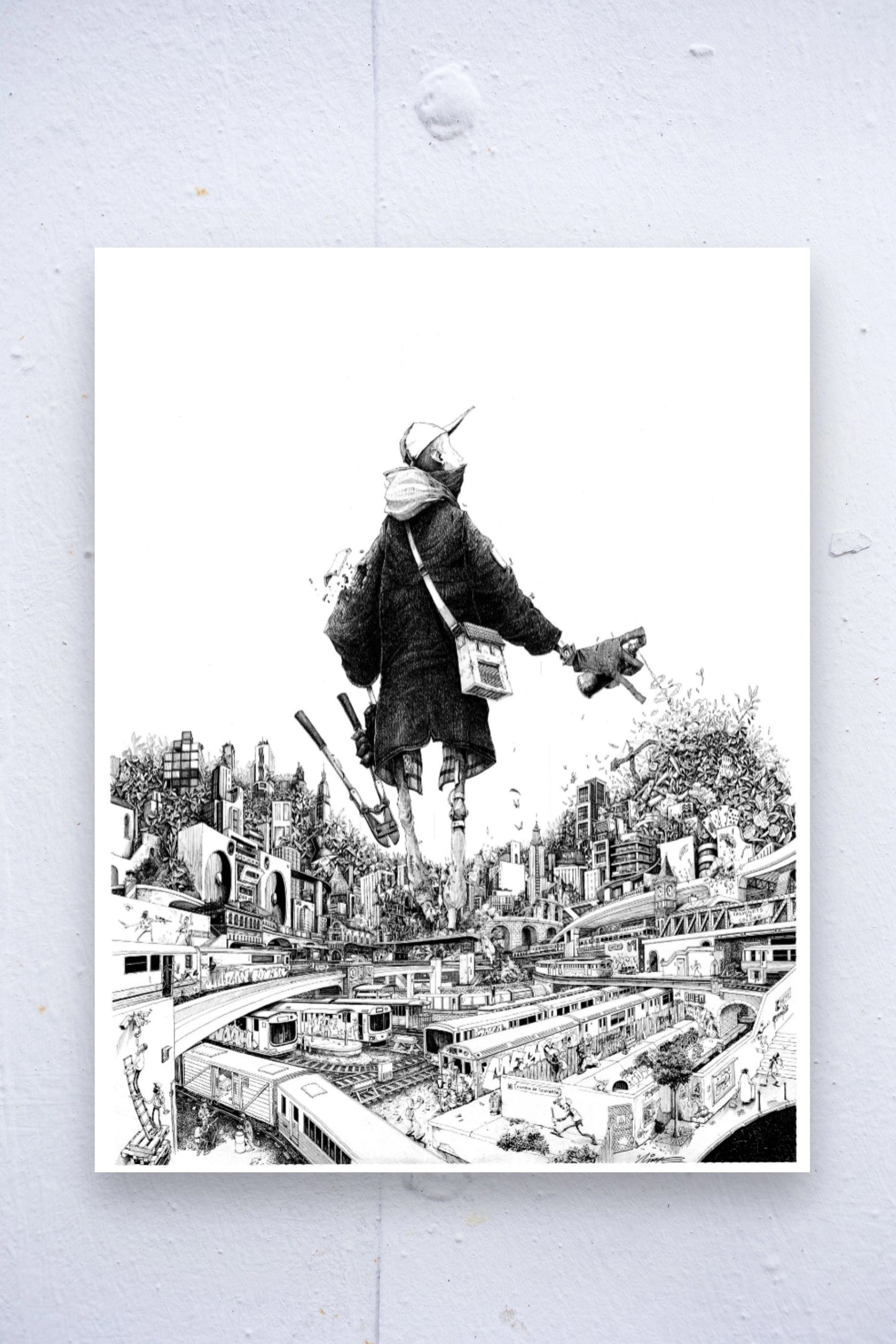 Alors que l'artiste dessinait initialement des personnages courts et en surpoids, il a choisi d'aller à l'envers de son propre dessin pour créer de curieux individus longs, nerveux, maigres et courbes. es. Au cœur de situations oniriques, poétiques voire absurdes, ces étranges personnages semblent suspendus dans les airs ou retenus par des câbles comme des marionnettes sur lesquelles s'incorporent de nombreux éléments, offrant ainsi aux passants des clés de lecture.