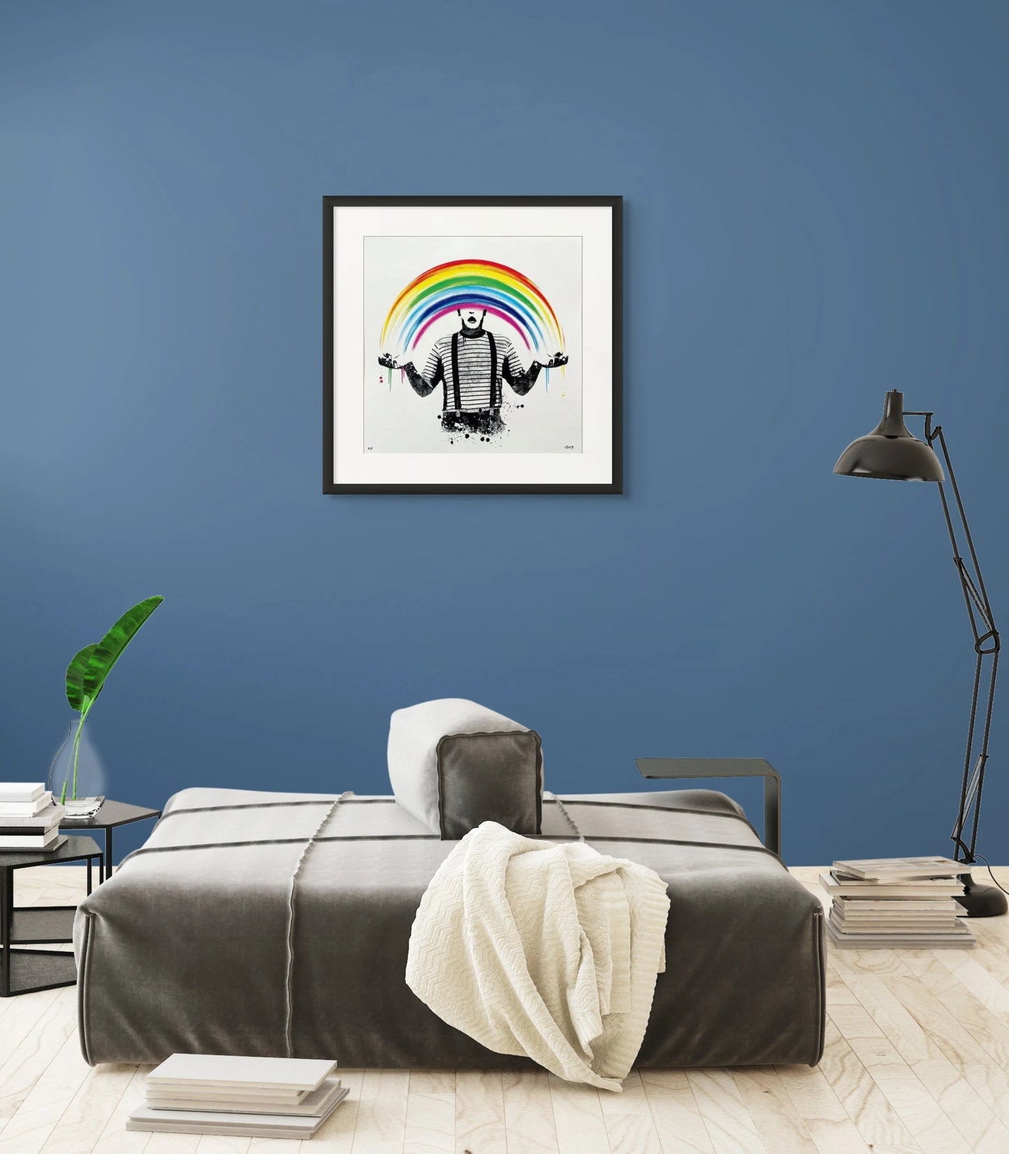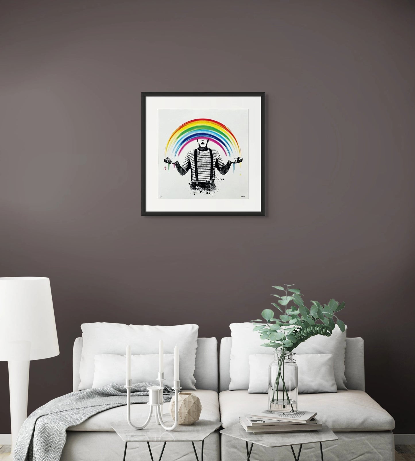 JBOY, un artiste basé au Royaume-Uni, a créé cette impression accrocheuse en édition limitée mesurant 50 x 50 cm. Elle représente un mime noir et blanc avec des bretelles et des rayures traditionnelles. Un immense arc-en-ciel qui s'étend au-dessus de la tête du mime cache son visage. Les couleurs vives et éclatantes de l'arc-en-ciel contrastent fortement avec l'apparence noir et blanc du personnage.