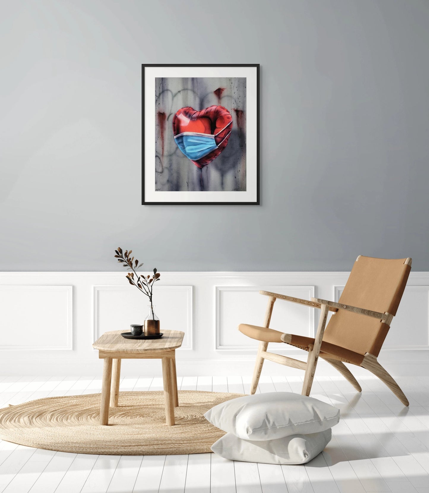 Cette œuvre d'art saisissante captive par son symbolisme poignant et sa composition saisissante. La toile est dominée par un ballon en forme de cœur rouge vif qui respire à la fois la vulnérabilité et la résilience. Le cœur, symbole universel de l'amour et de la vie, est contrasté de manière frappante avec l'ajout moderne et clinique d'un masque chirurgical bleu.
