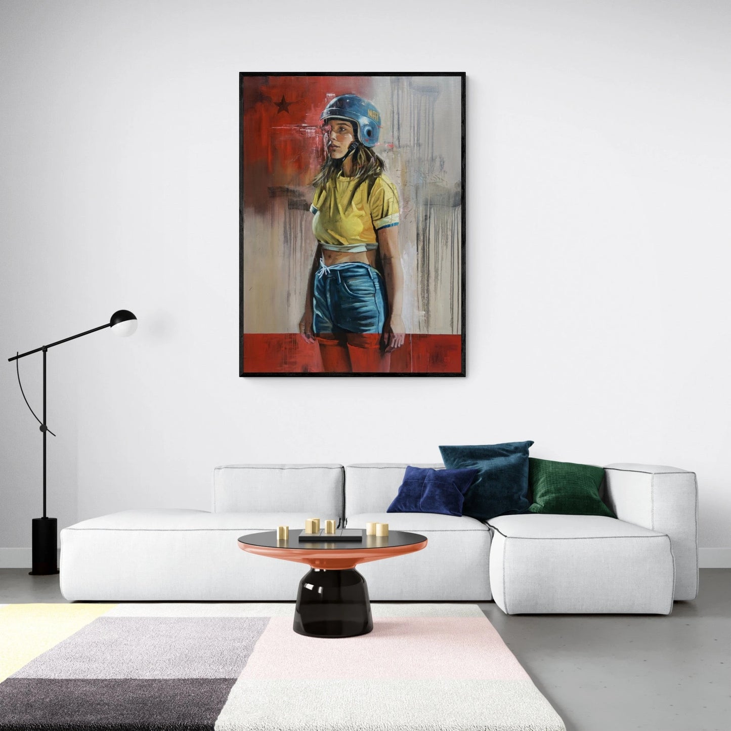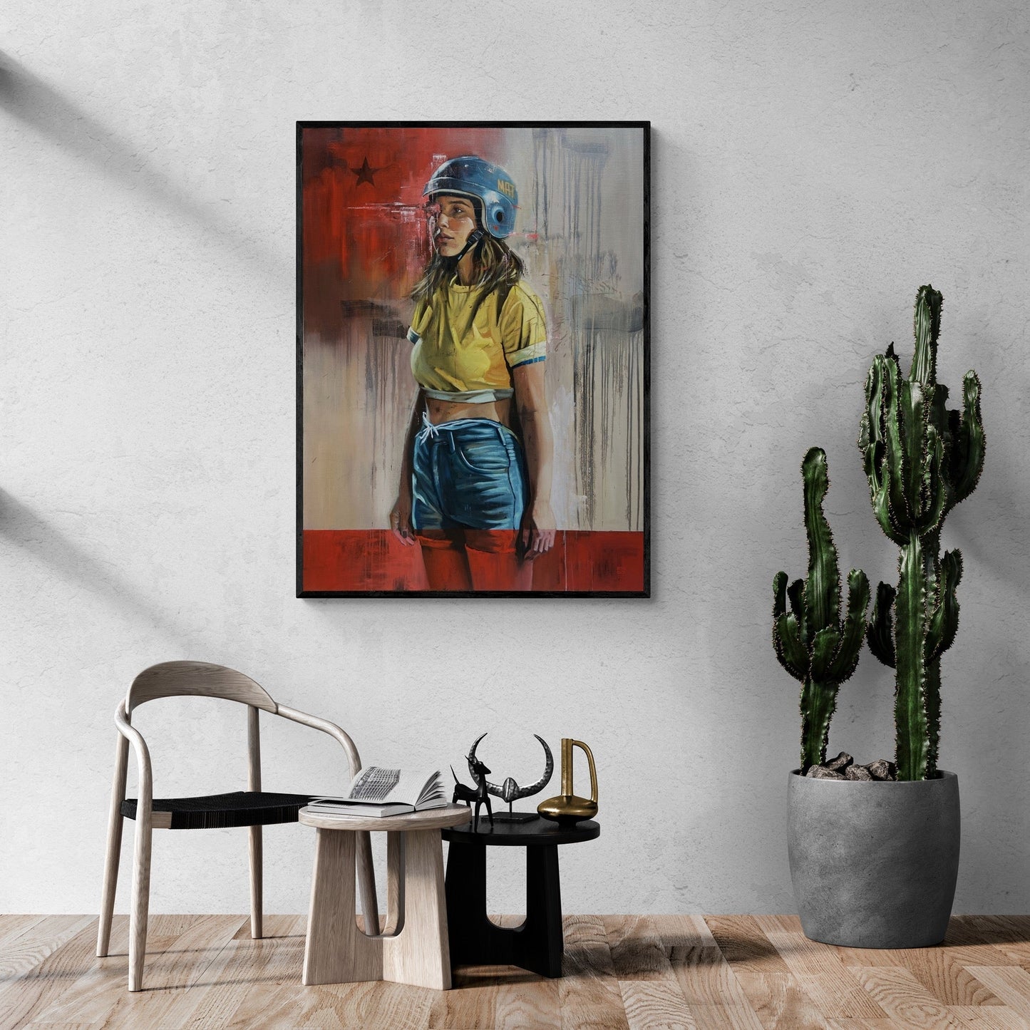 Le tableau, de dimensions 130 sur 97 centimètres, met en scène une jeune femme marquée par un casque de protection, son visage reflétant une détermination sereine.