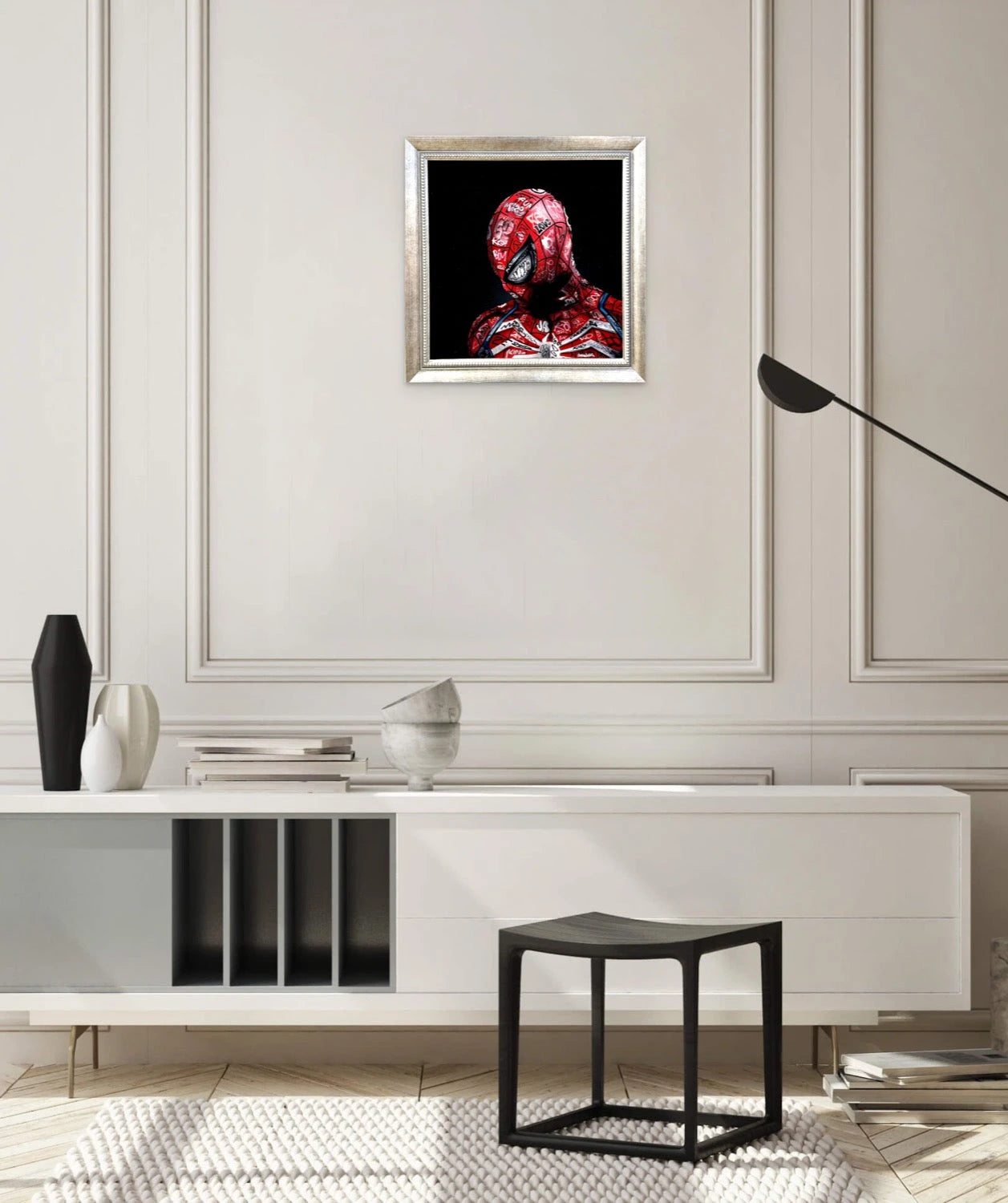 "Peter Marker" d'ONEMIZER est une pièce intime de 40 x 40 cm (environ 15,7 x 15,7 pouces) qui plonge dans l'essence vibrante de la mythologie des super-héros à travers le prisme du street art. Cette œuvre d'art présente l'image emblématique du masque de Spider-Man, réinventée avec une tapisserie de graffitis et de symboles qui insufflent une nouvelle vie au personnage classique.