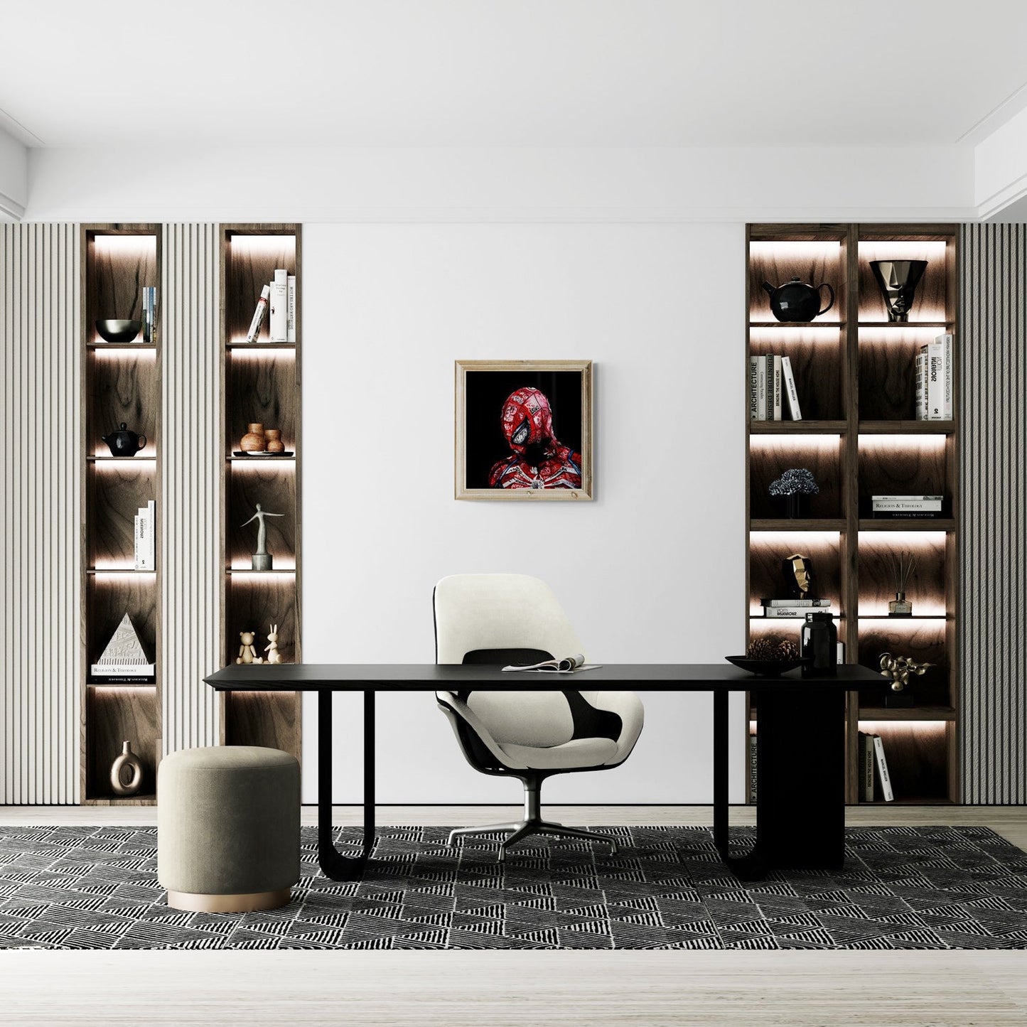 Chaque segment de la façade palmée de Spider-Man est rempli des graffitis caractéristiques d'ONEMIZER, transformant le masque en une toile narrative qui raconte l'histoire de l'art urbain étroitement liée à la culture populaire. Le rouge cramoisi du masque contraste fortement avec le fond sombre, faisant ressortir l'œuvre d'art avec un effet tridimensionnel qui semble surgir de la toile.