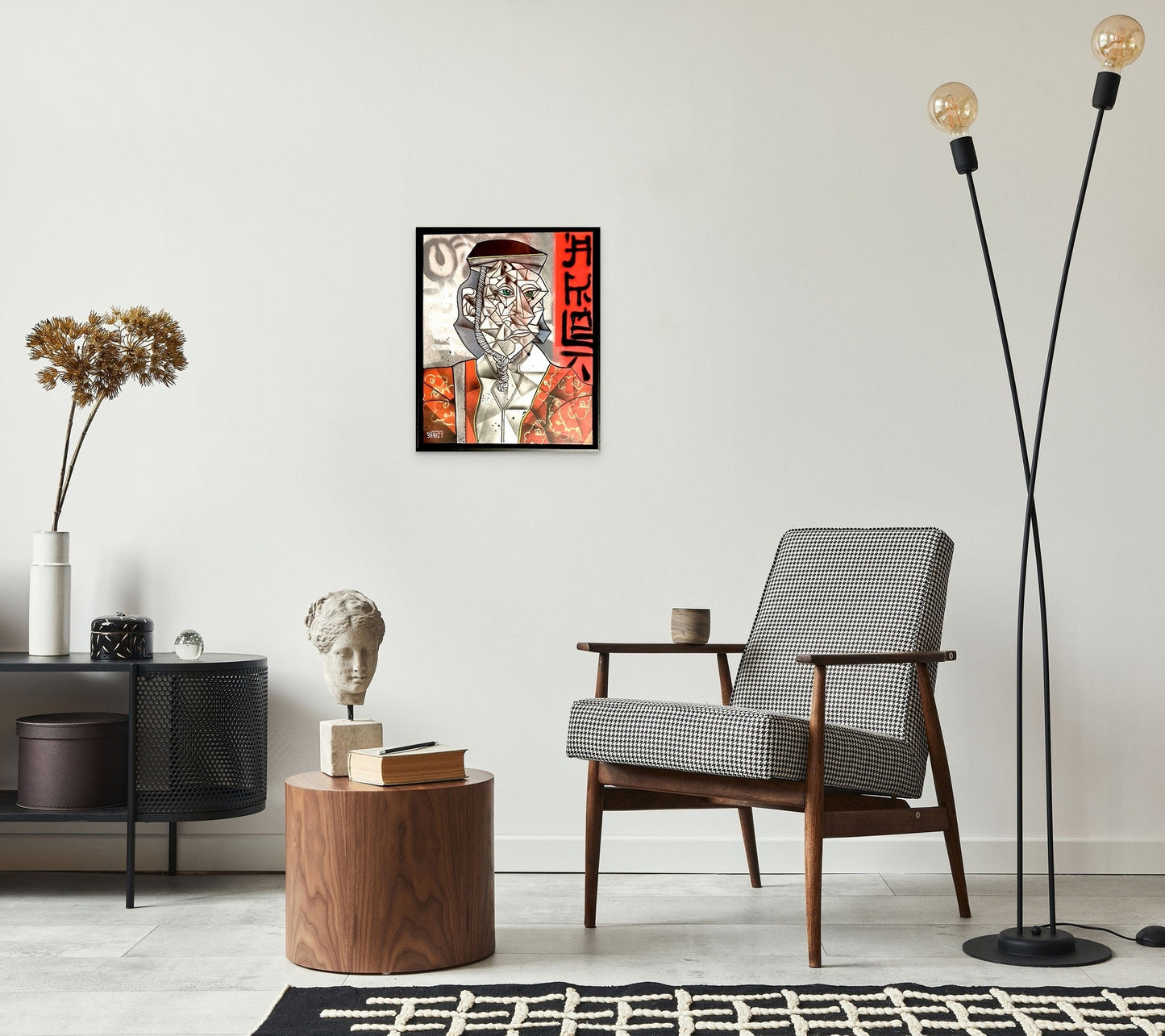 Une caractéristique frappante de cette œuvre est l'utilisation de la calligraphie traditionnelle japonaise en arrière-plan, qui juxtapose la modernité de l'interprétation cubiste avec des symboles culturels intemporels. La teinte rouge vif de la calligraphie contraste avec la palette monochromatique de la figure, attirant l'attention sur la fusion des cultures et la profondeur de la réflexion qui transcende le langage et le temps.
