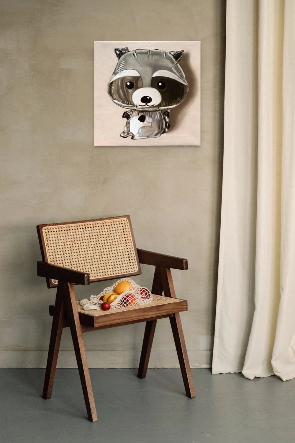 Le tableau 'Raccoon' d'Ian Bertolucci mesure 40x40 cm (15 ¾ x 15 ¾ po) et est une peinture à l'huile mettant en valeur un ballon en forme de raton laveur de style photoréaliste avec des détails complexes et scintillants.