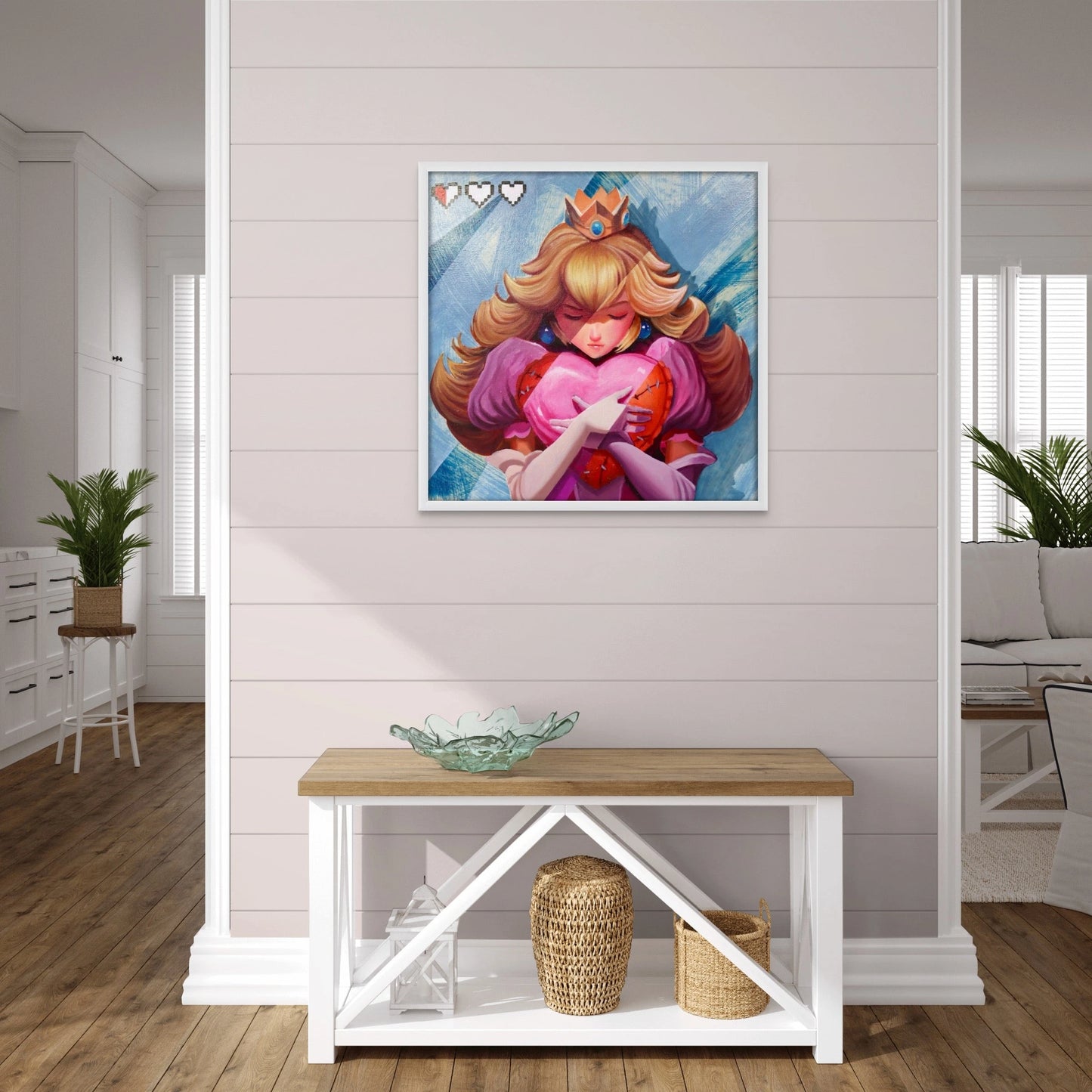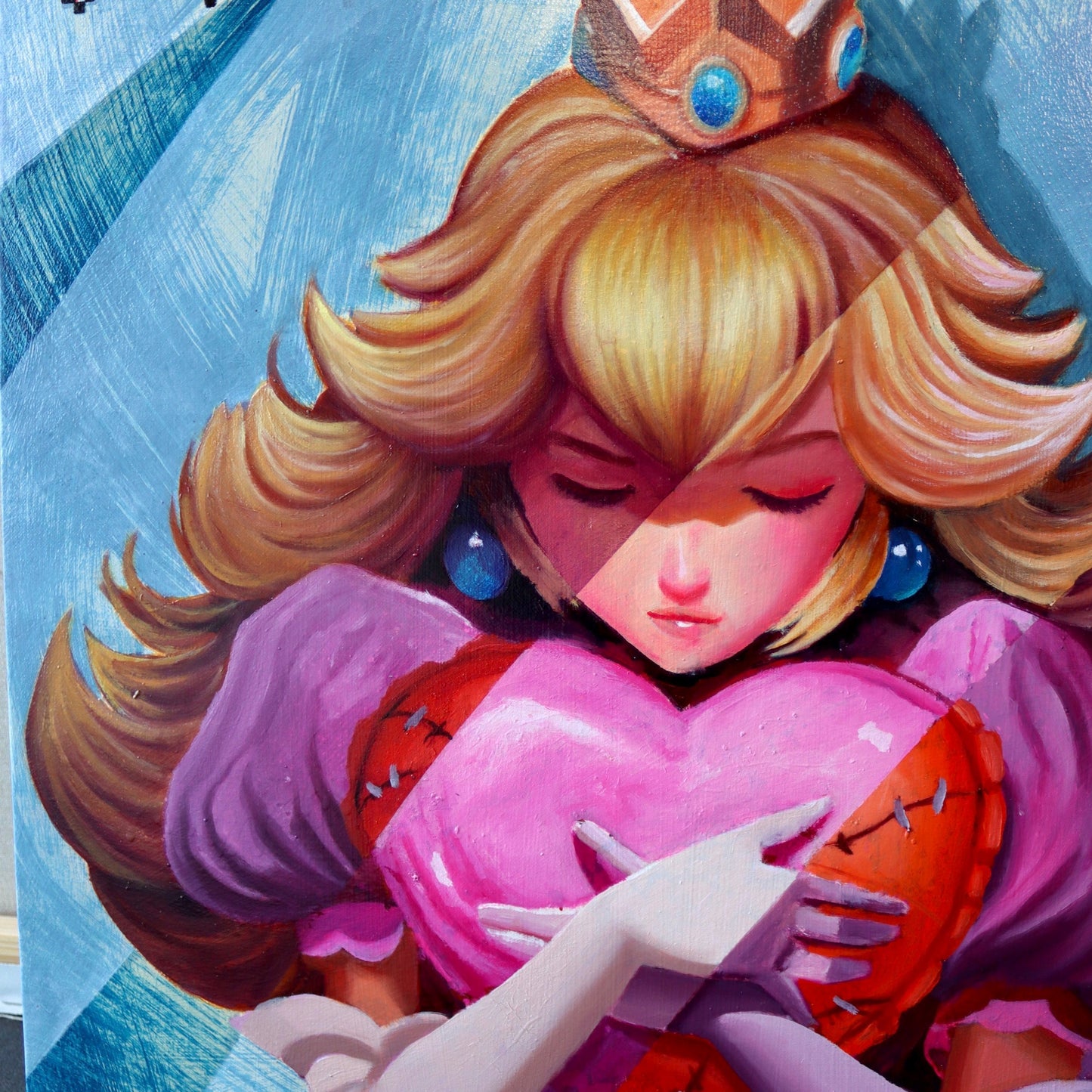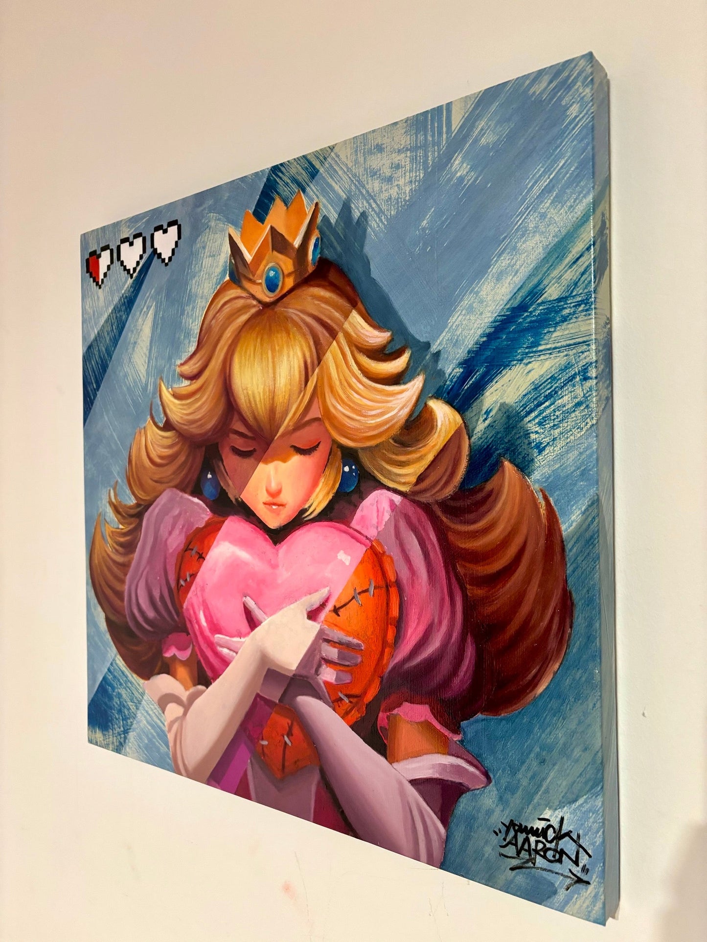 Cette peinture sur toile présente une fusion de médiums acryliques et à l'huile, offrant une princesse stylisée et vivante tenant son cœur.