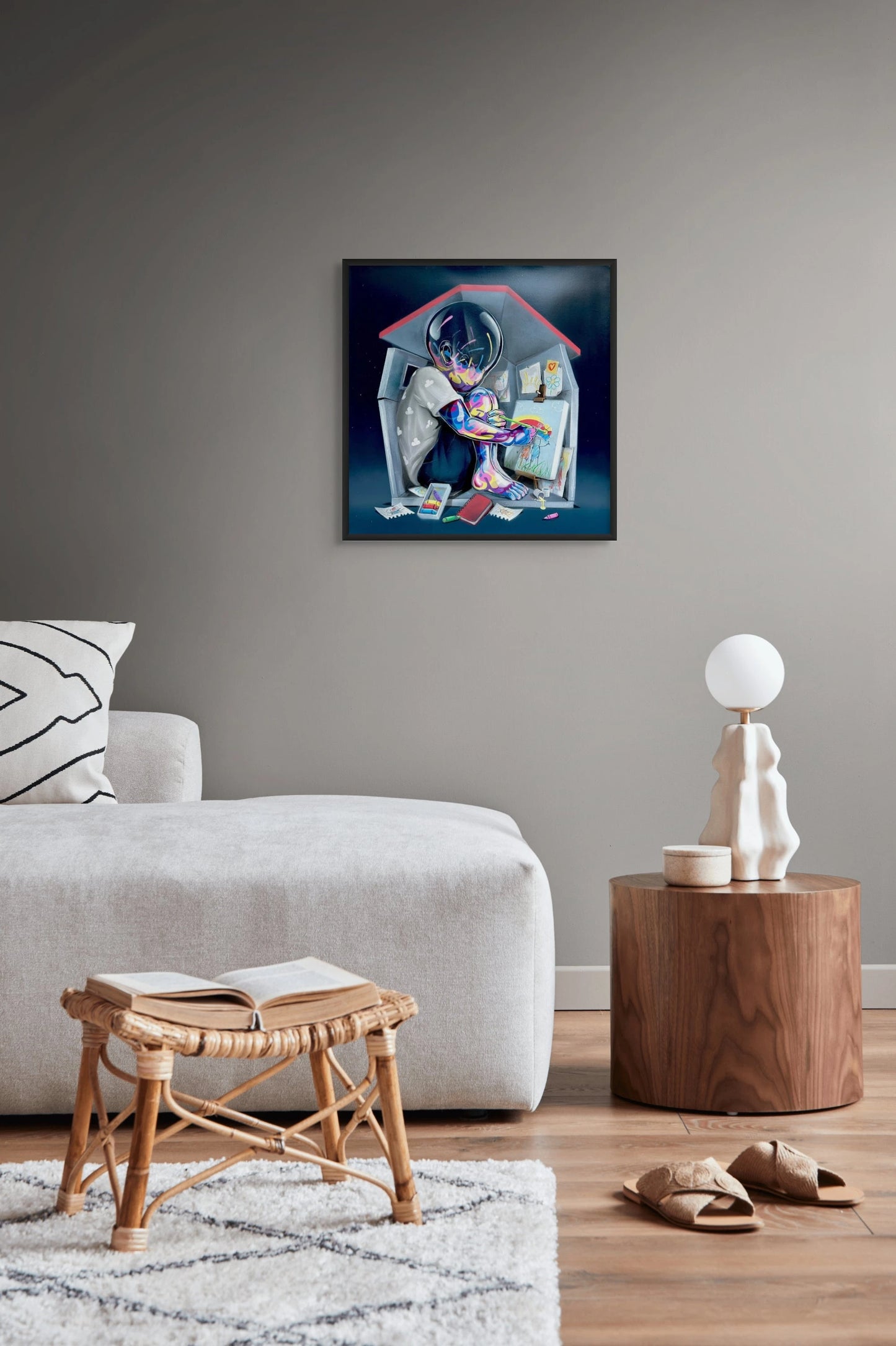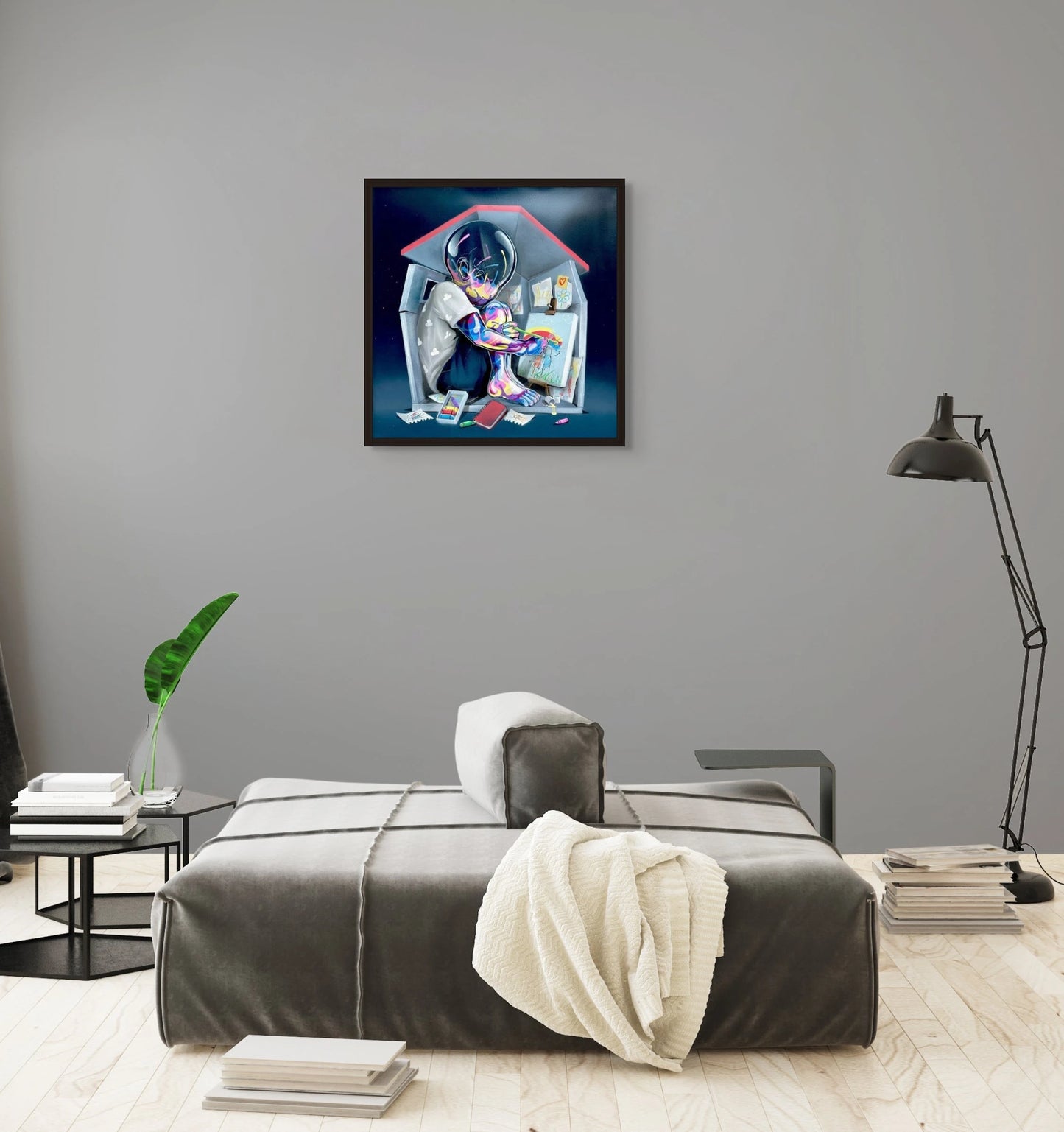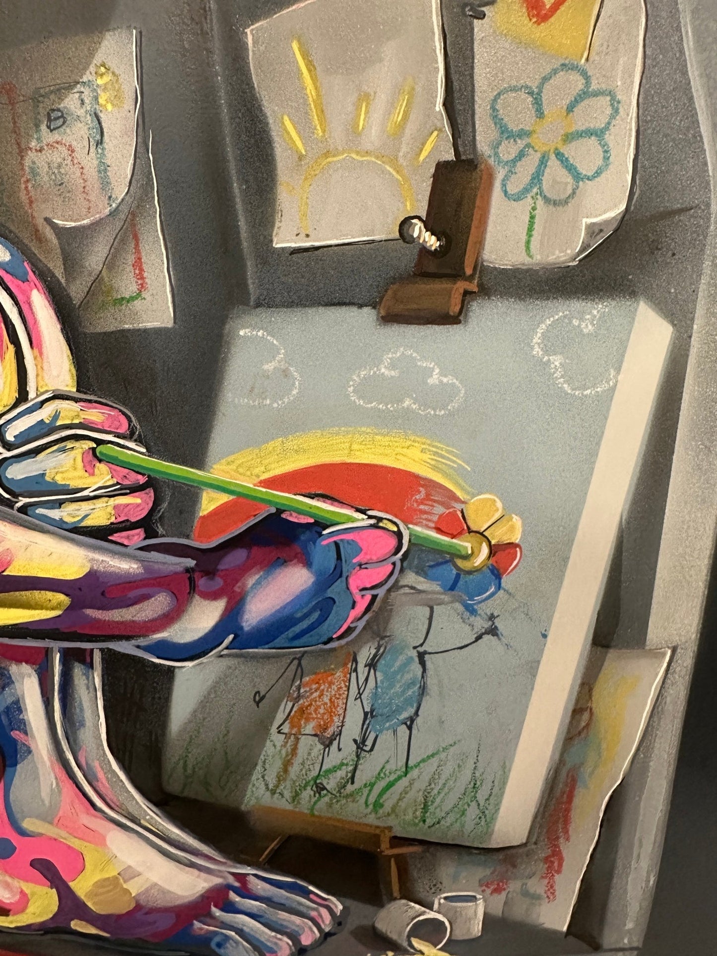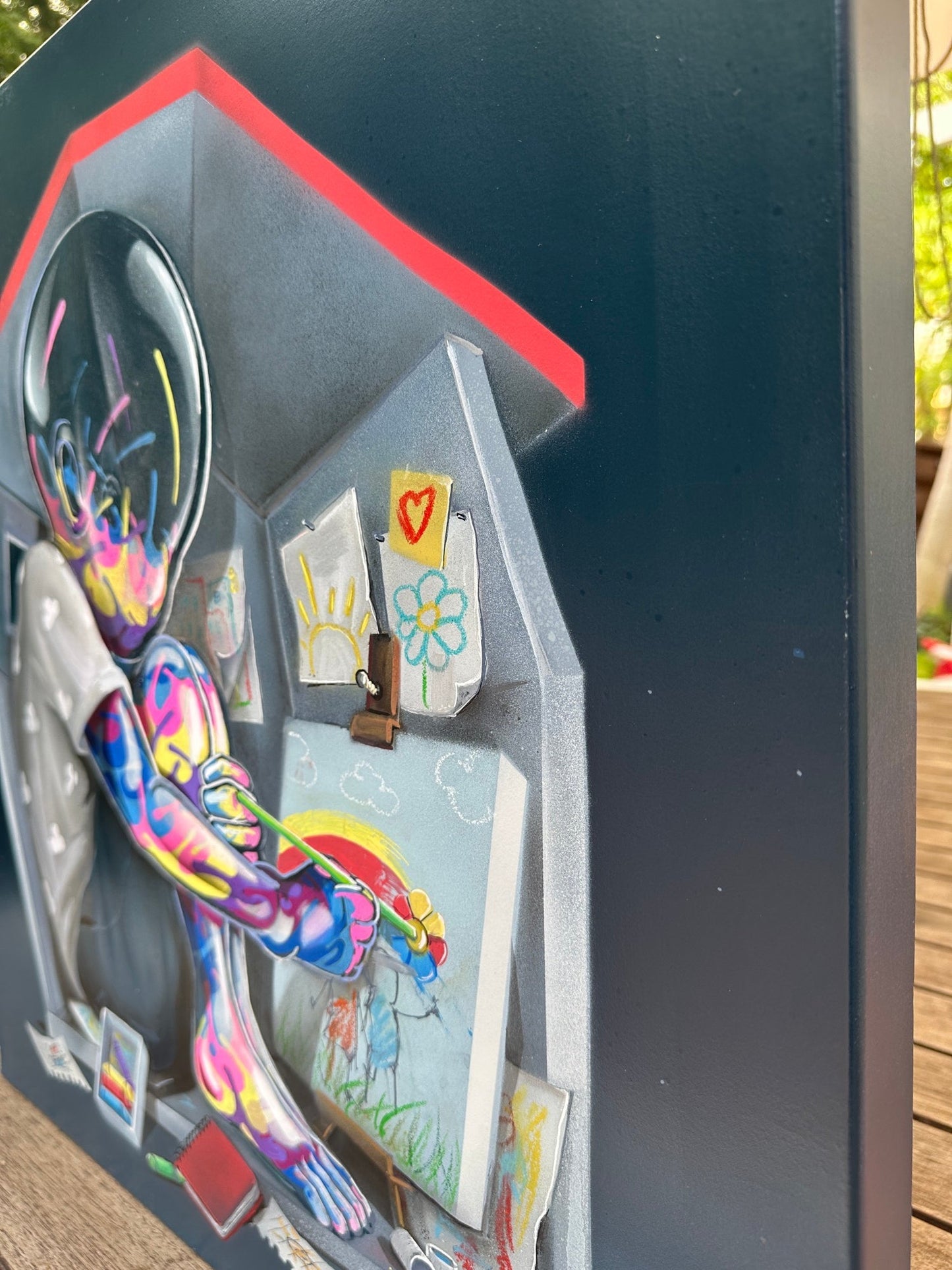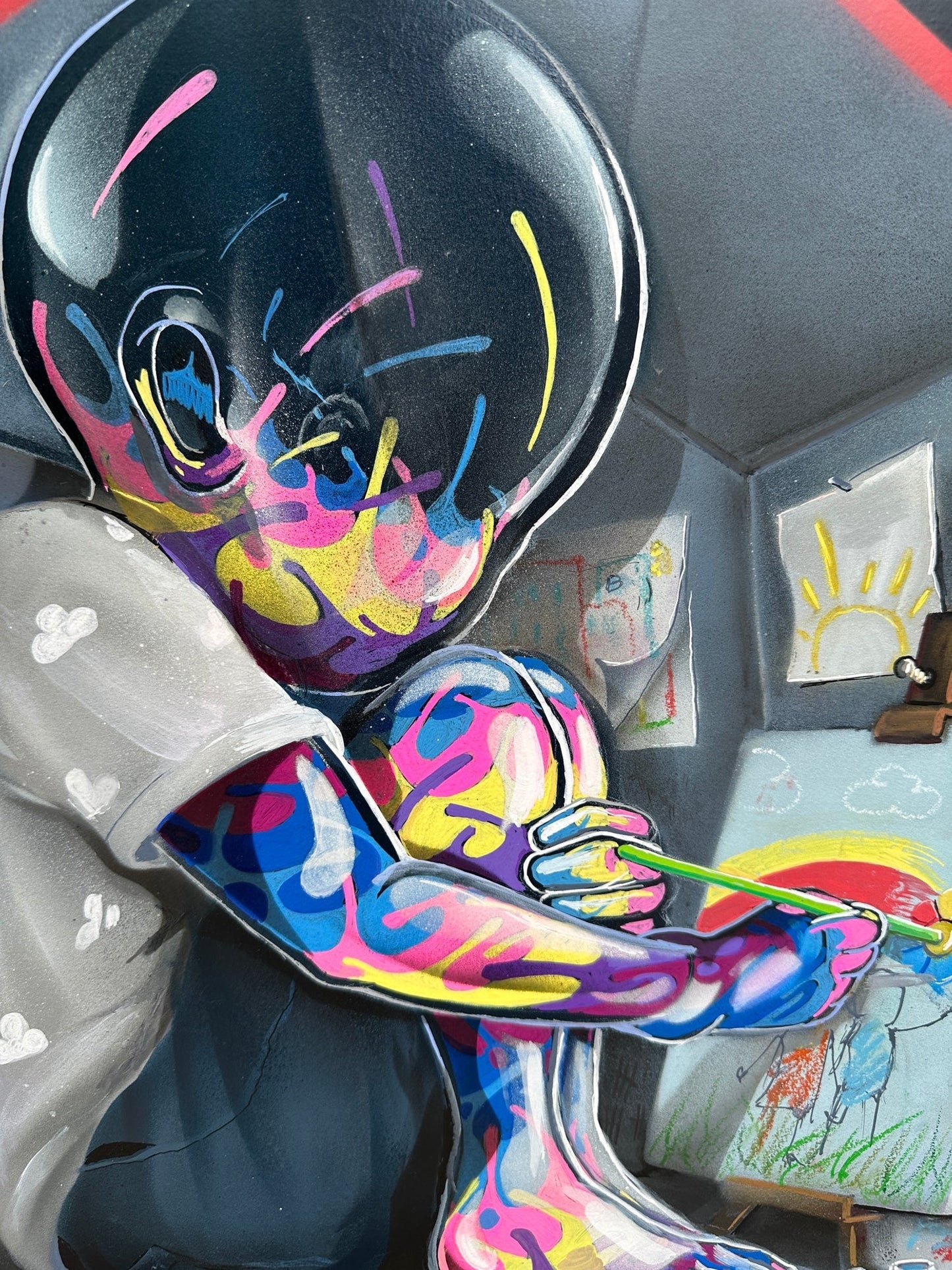 Commentaire de Flog : "C'est presque comme le titre le suggère, une œuvre introspective, représentant la façon dont je crée mes peintures, à partir des gribouillages, des croquis dans mon cahier, de mes recherches et de la peinture dans un espace pendant des années où je n'ai presque pas d'espace. Mais cette passion pour le dessin dans ce petit espace m'a permis de grandir en tant qu'artiste et de vivre de ma passion maintenant grâce au soutien incroyable que j'ai reçu de tout le monde. Ce n'est que le début du voyage et j'espère grandir encore.