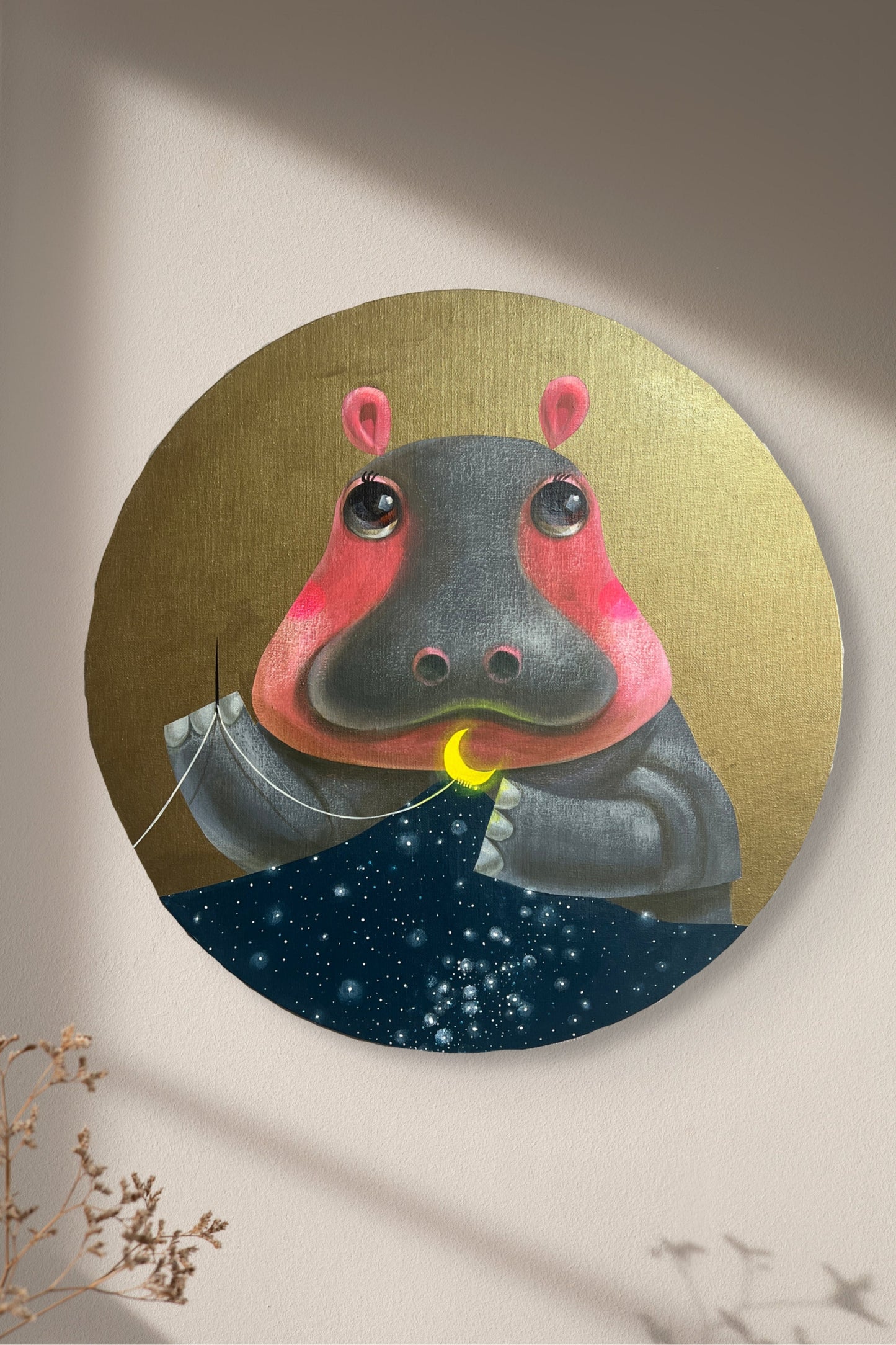 L'œuvre fantaisiste et captivante « Sewing the Moon » d'Akio Harada montre un hippopotame cousant avec brio un croissant de lune dans un tissu céleste orné d'étoiles. Les mains sensibles de l'hippopotame tirent amoureusement sur le fil, symbolisant la création et la connexion, tandis que ses joues roses douces et ses yeux écarquillés et charmants respirent la chaleur et la curiosité. La qualité mystique et onirique de l'œuvre est soulignée par l'éclat céleste du fond doré. Les spectateurs sont entraînés dans un monde paisible et amusant par l'attention minutieuse d'Akio Harada aux détails, qui se manifeste dans tout, de la fourrure texturée aux étoiles scintillantes.
