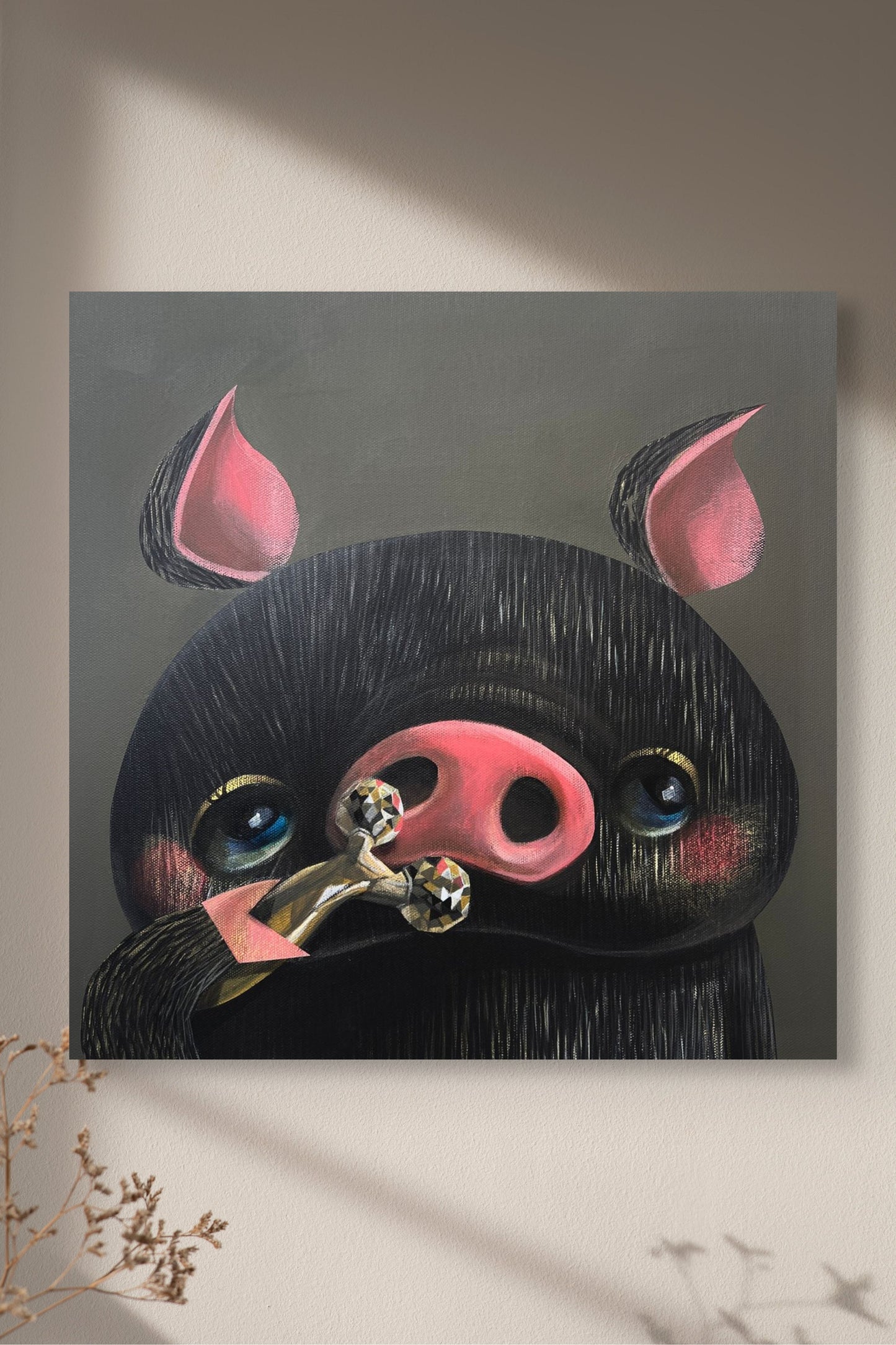 L'œuvre d'art amusante et captivante « Skin Care and Holes » (スキンケアと穴) d'Akio Harada représente un cochon noir aux yeux bleus expressifs et au museau rose vif. Le cochon tient un appareil scintillant qui ressemble à un équipement de beauté coûteux, ce qui suggère une touche comique aux soins personnels. Son museau et ses oreilles rose pâle contrastent bien avec ses cheveux texturés, ce qui confère à l'œuvre profondeur et charme. Les caractéristiques colorées du personnage sont soulignées par le fond neutre, qui établit un équilibre entre fantaisie et élégance. Cette composition capture parfaitement le talent d'Harada pour donner vie et comédie à ses sujets fantastiques.