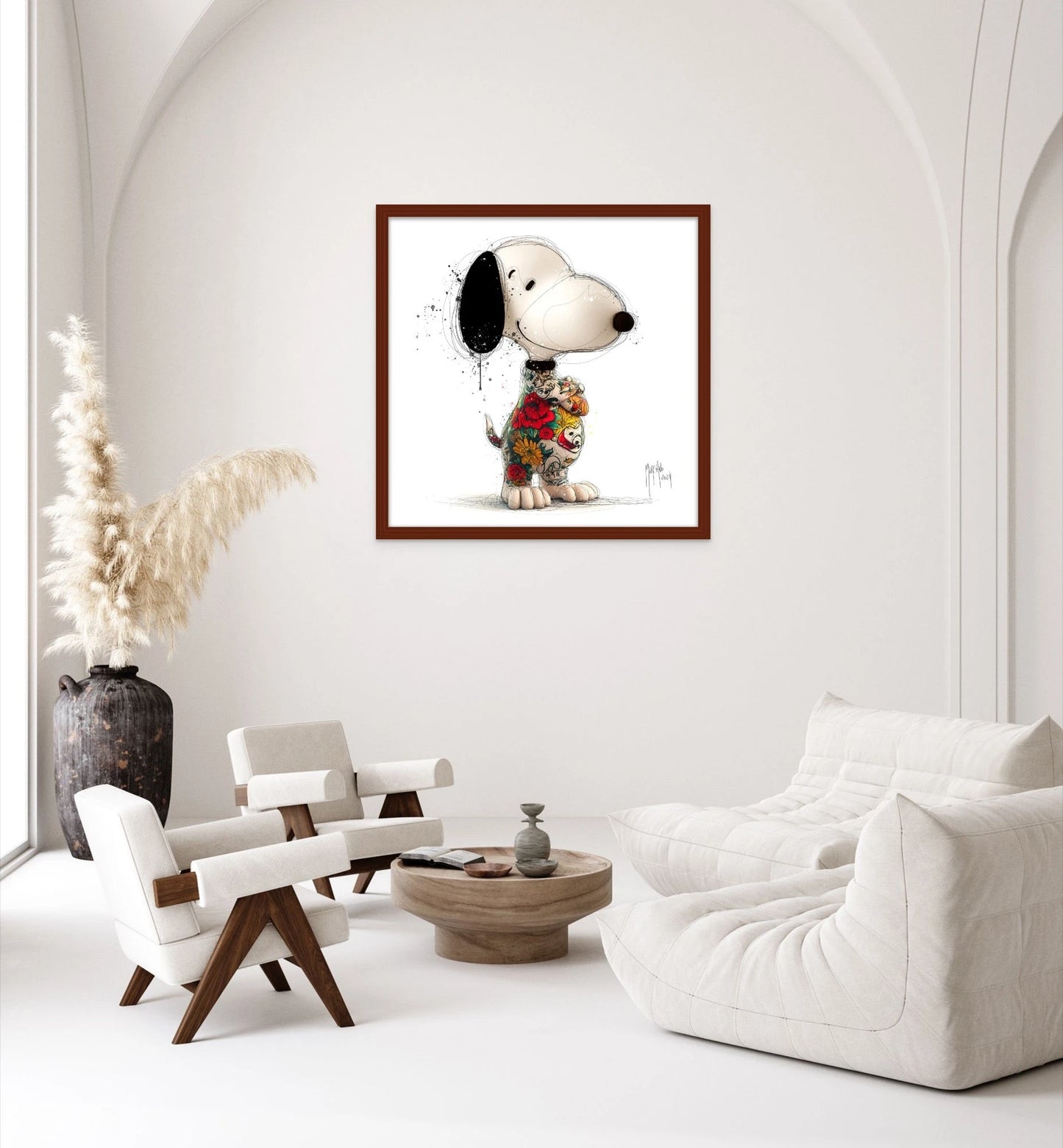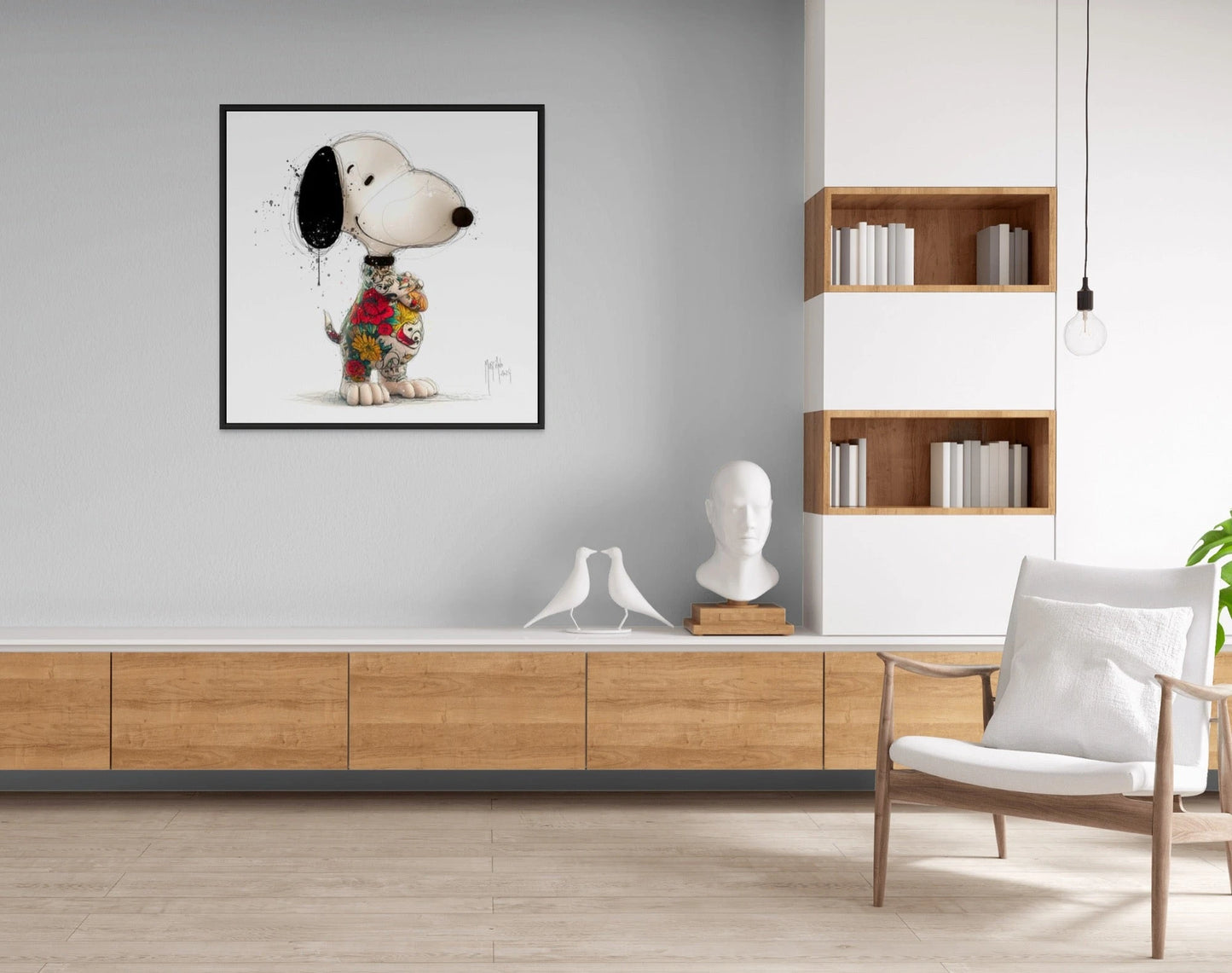 "Le 'Snoopy' de Murciano anime le beagle classique avec une touche, l'ornant d'un motif floral vibrant ressemblant à un tatouage sur une toile de 39"x39" pouces (100x100 cm), fusionnant fantaisie avec une touche de rébellion."
