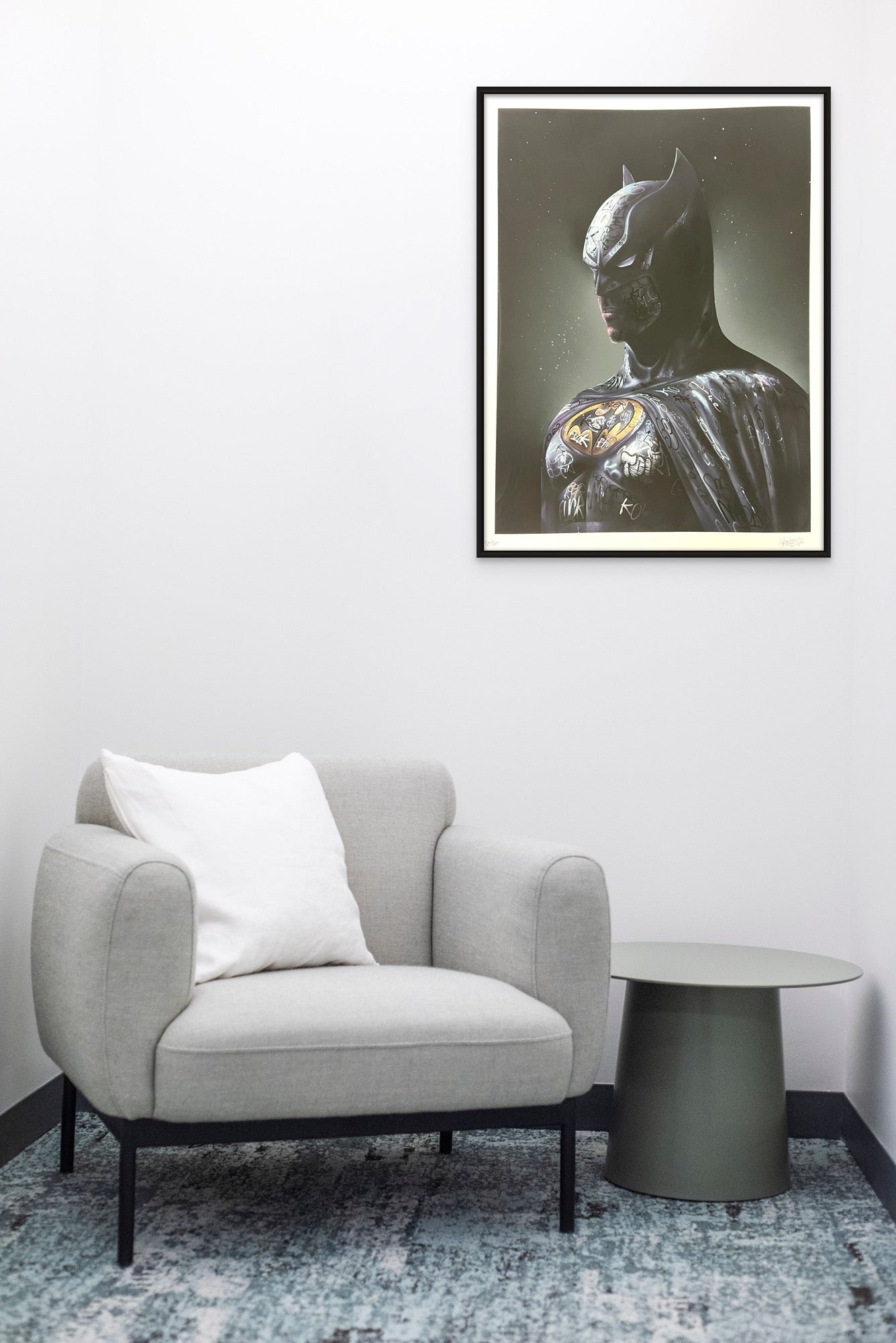 Cette œuvre saisissante présente une représentation dramatique et hyperréaliste de Batman, captant immédiatement l'attention du spectateur avec ses détails minutieux et son atmosphère intense.