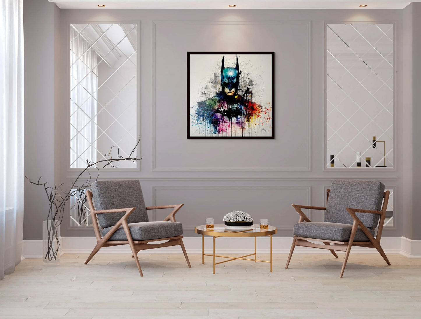 Les éclaboussures colorées qui entourent la silhouette de Batman ajoutent à la sensation dynamique, suggérant l'action et l'intensité.