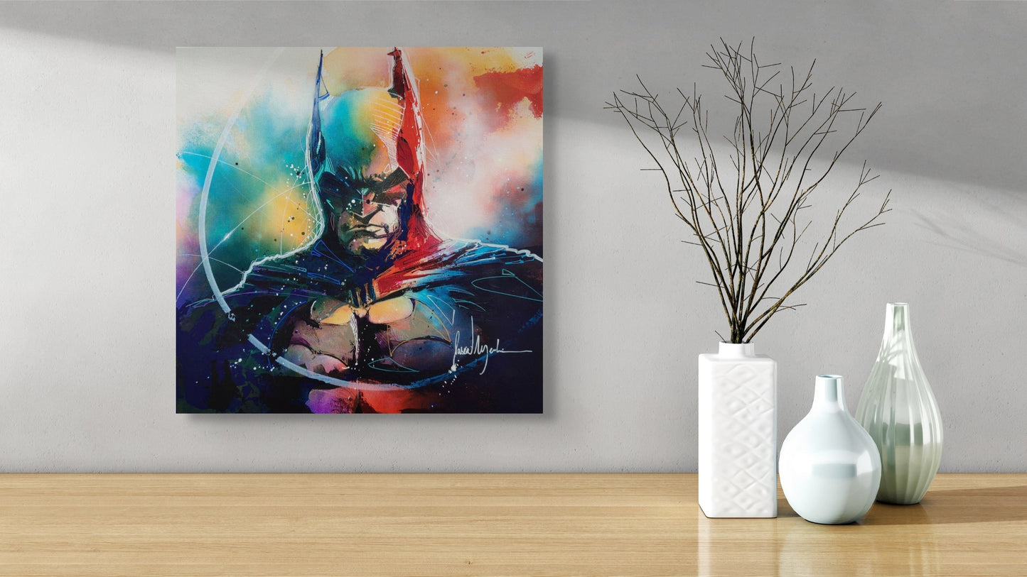 Merlin Pascal a réalisé le tableau intitulé "Batman". Il s'agit d'une œuvre d'art originale signée de 50 x 50 cm réalisée en acrylique. La composition utilise des couleurs vives et dramatiques comme le bleu, le rouge et le jaune pour représenter le super-héros emblématique Batman.