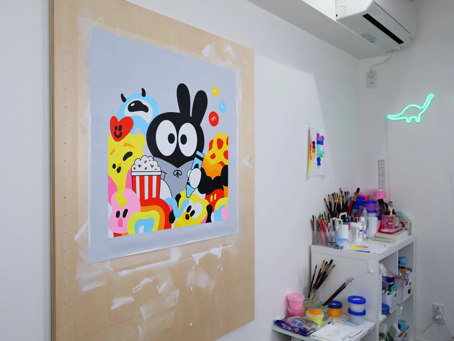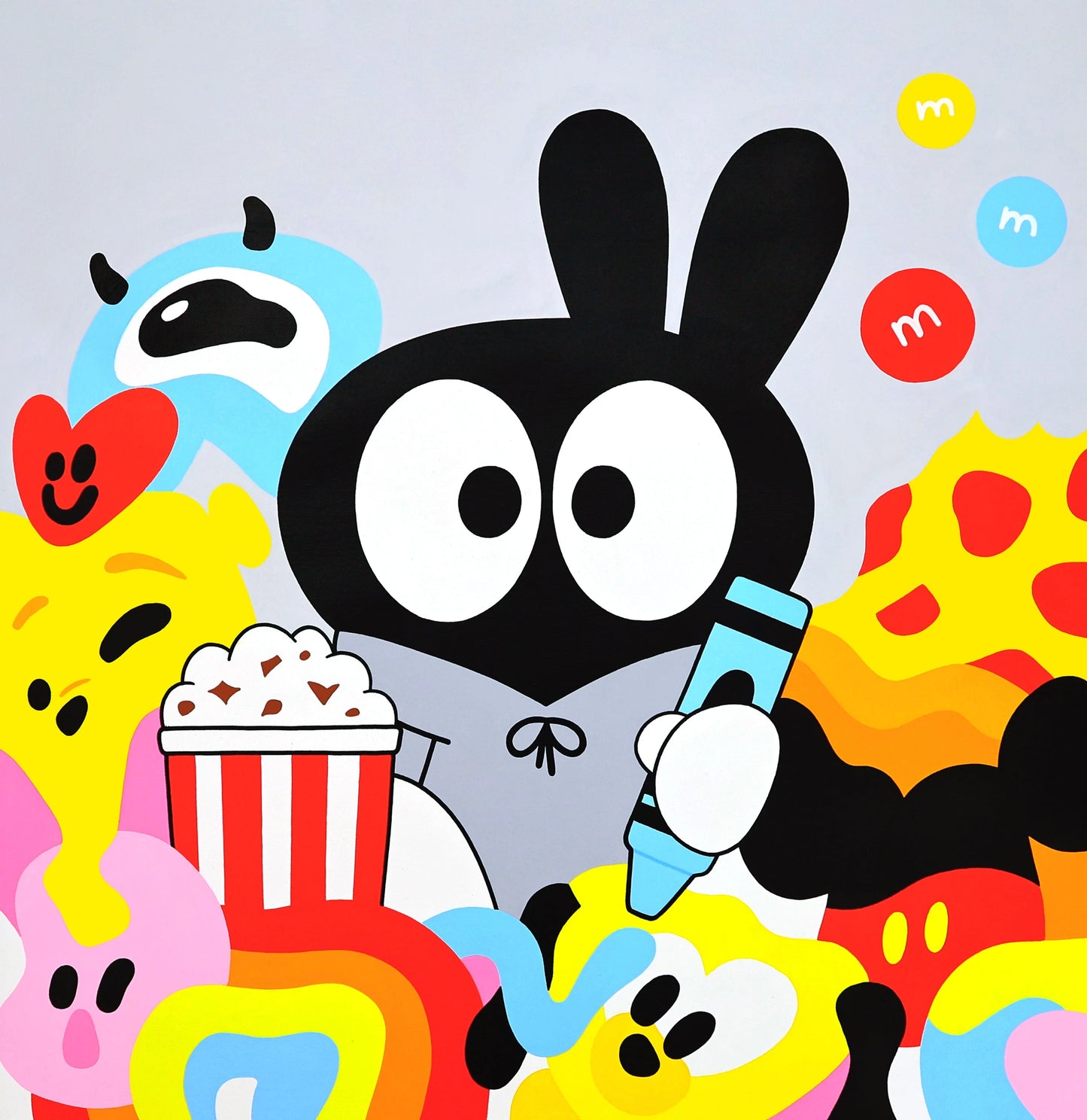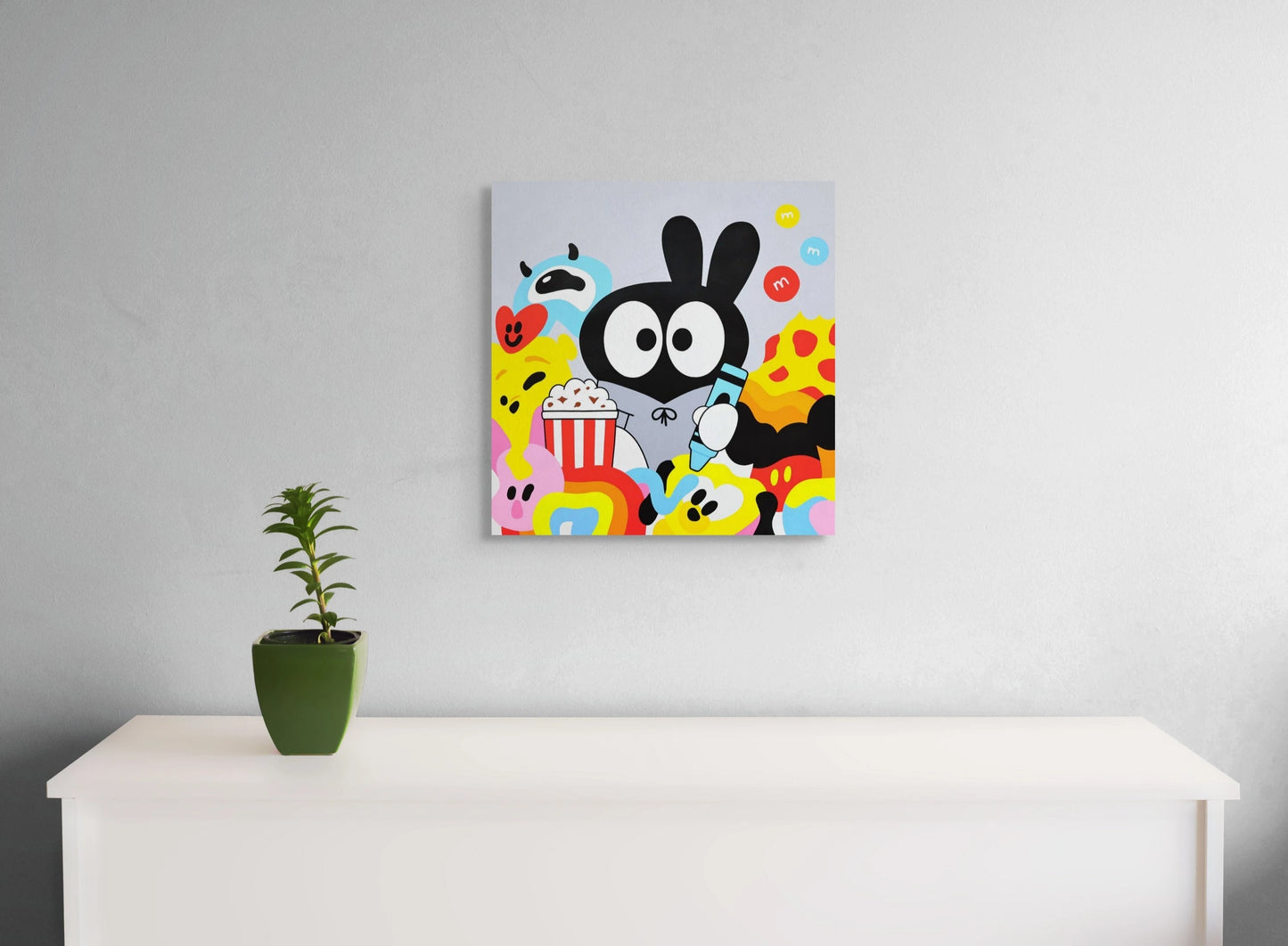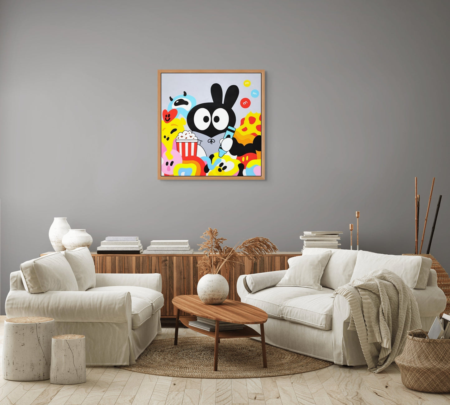 Cette œuvre ludique de Yeka Haski met en scène Michi, le personnage emblématique de l'artiste ressemblant à un lapin, qui respire le charme et la positivité. Le design minimaliste en noir et blanc, sur fond gris doux, met en valeur la personnalité expressive de Michi et son geste emblématique du signe de paix. La pièce rayonne de joie et d'innocence, capturant l'essence de l'émerveillement enfantin qui définit le monde imaginaire de Yeka. Parfait pour égayer n'importe quel espace avec son esthétique joyeuse et moderne.
