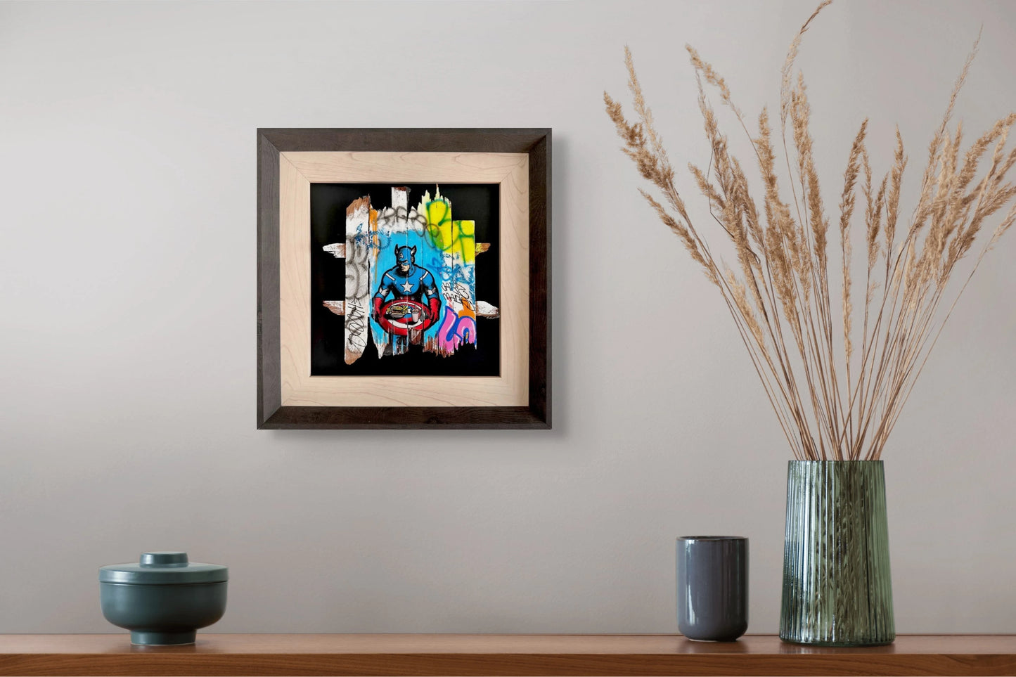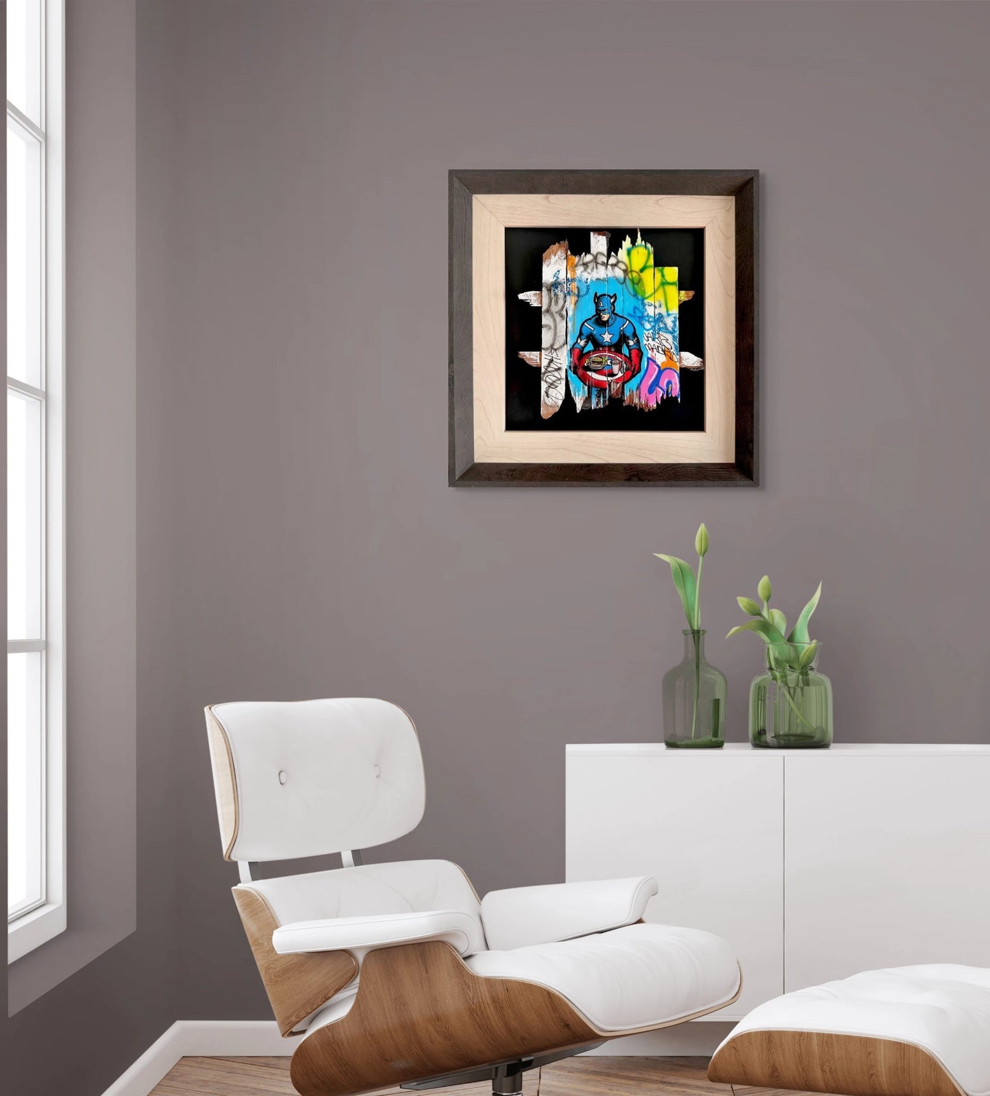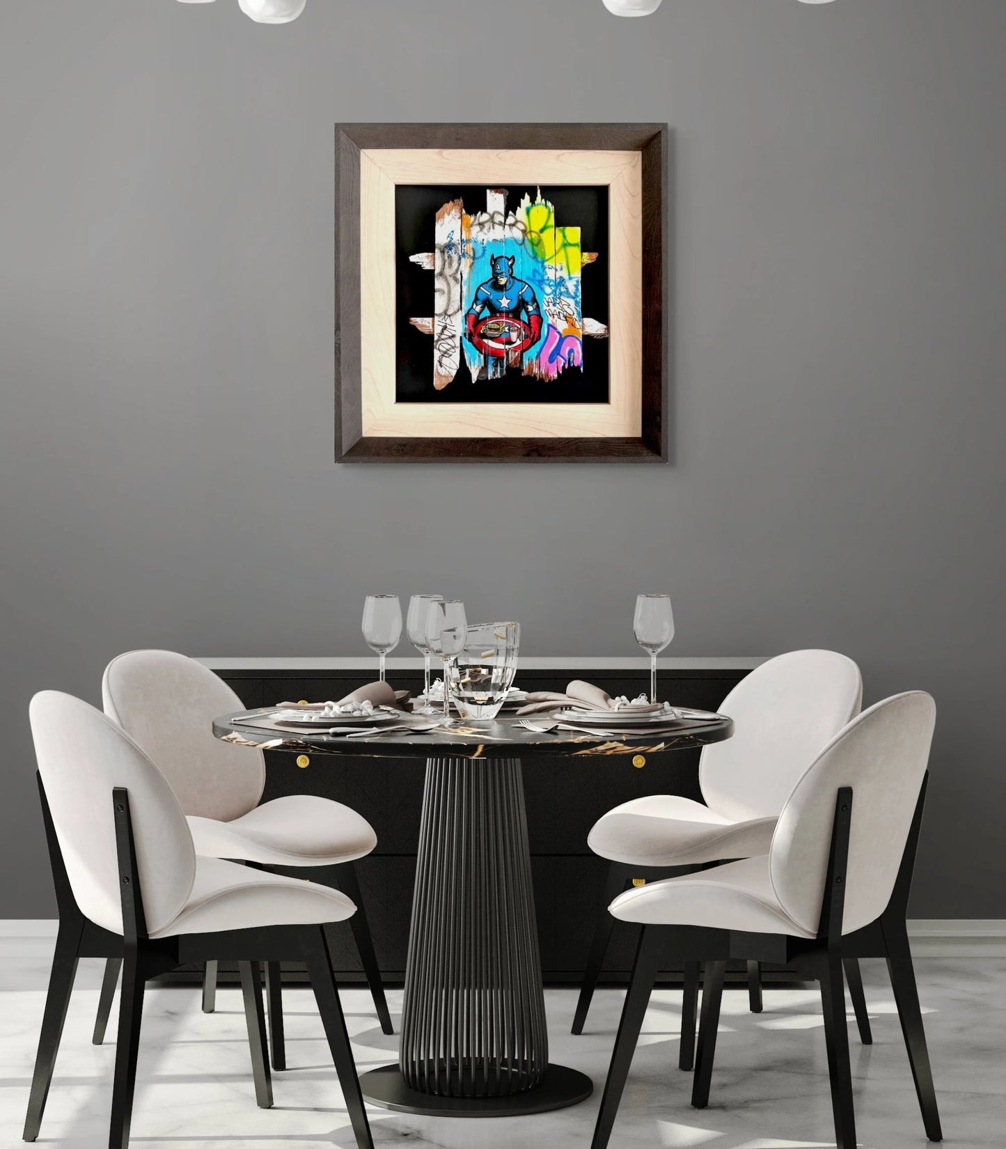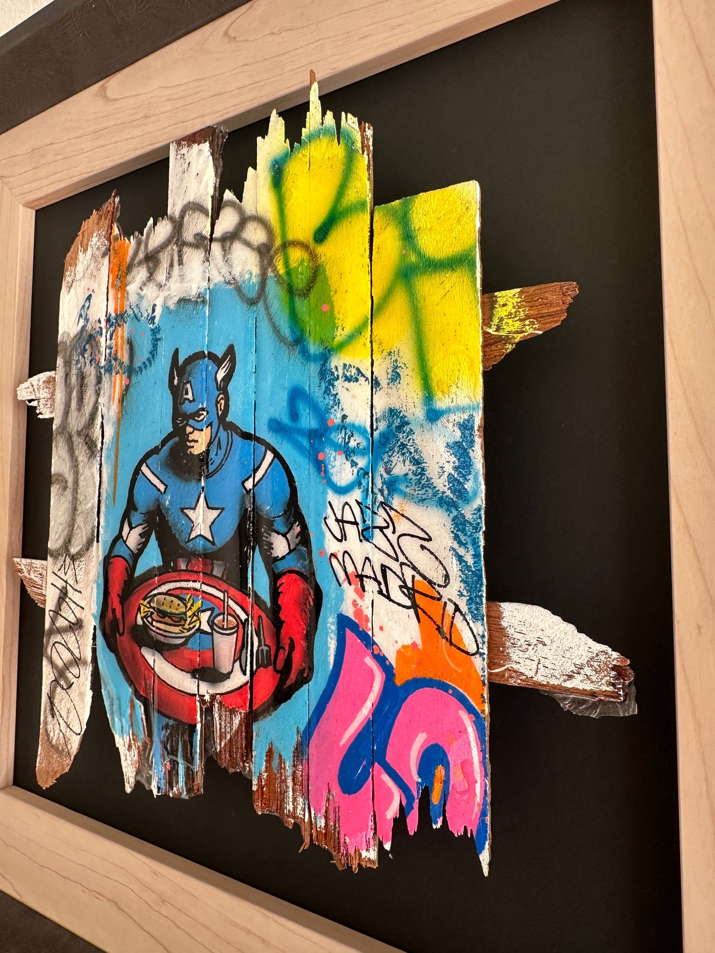 Cette œuvre d'art, qui met en scène Captain America dans son célèbre uniforme, mêle pop culture et street art. Des couleurs métropolitaines vibrantes comme le bleu, le jaune et le rose se marient à des tags dynamiques et des éléments peints à la bombe sur des panneaux de bois patinés et couverts de graffitis.