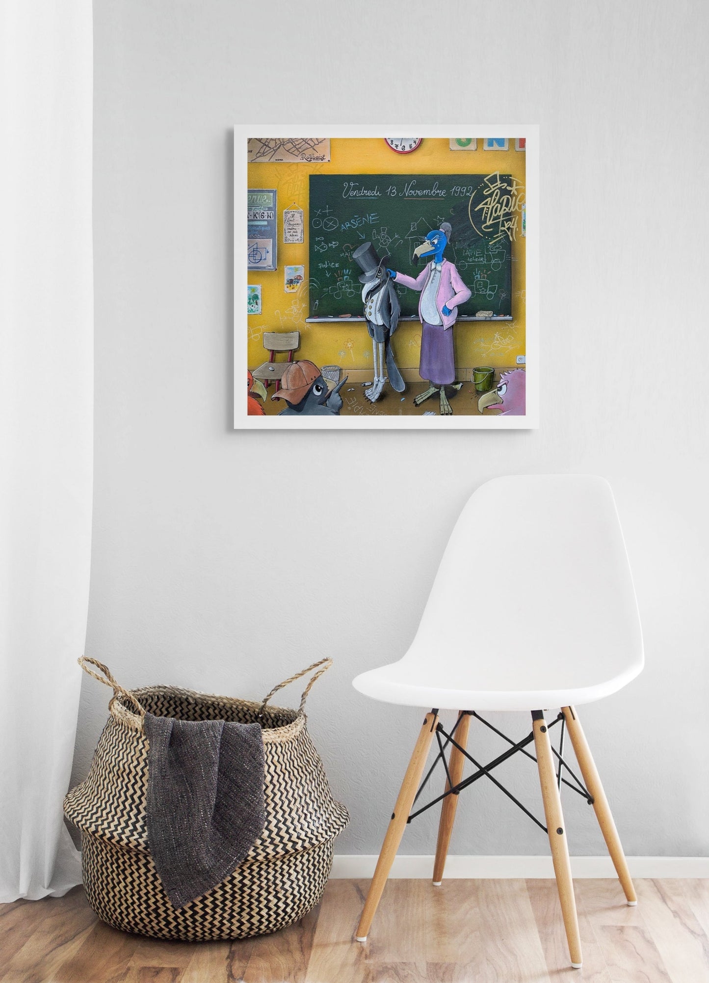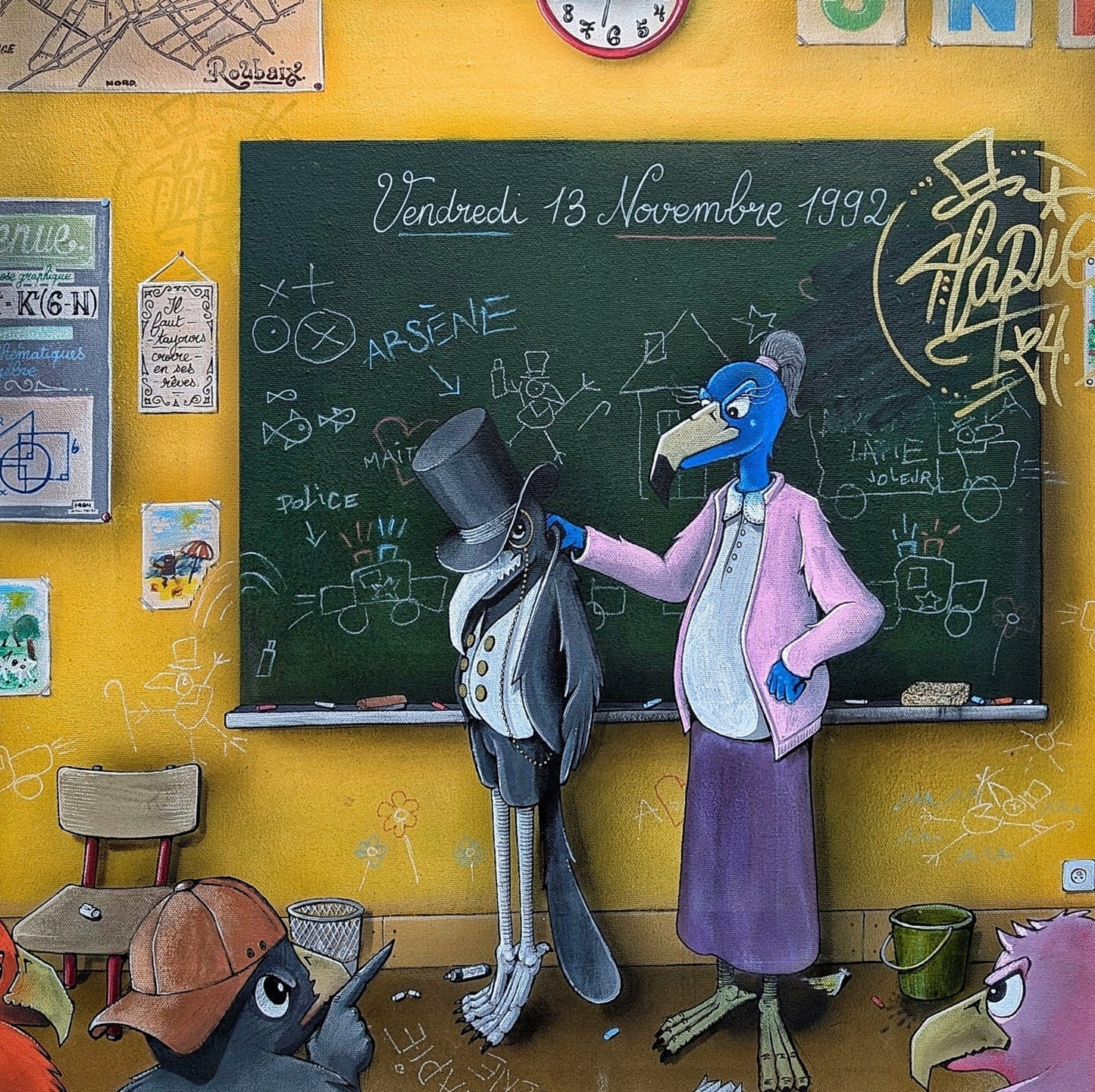 « Pauvre Arsène Lapie ! Il s'est fait surprendre par la maîtresse d'école après avoir dessiné partout dans la classe ! Profitant d'un moment d'inattention, l'oiseau farfelu s'est laissé aller à ses rêves d'aventure et d'évasion, exprimant ses désirs et espérant peut-être égayer la classe au passage. »