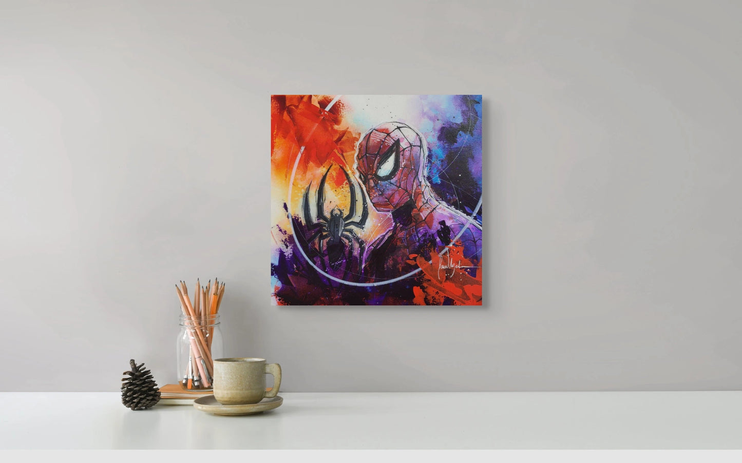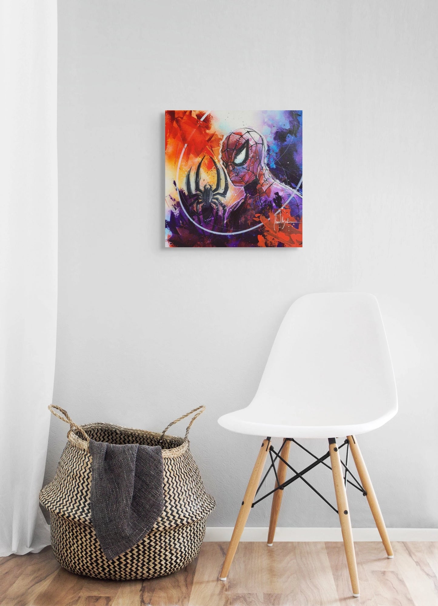 Les dimensions de cette œuvre acrylique de 50 × 50 cm ont été réalisées par Merlin Pascal. Il s'agit d'une œuvre d'art originale signée par l'artiste. Une image emblématique de Spider-Man est présente dans la composition, qui combine des teintes vives et vibrantes comme l'orange, le bleu et le rouge avec des accents noirs saisissants pour le contraste.