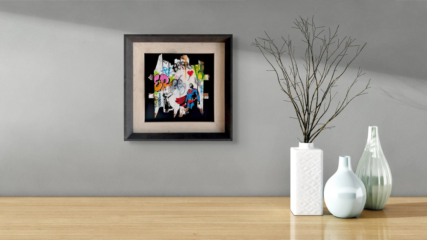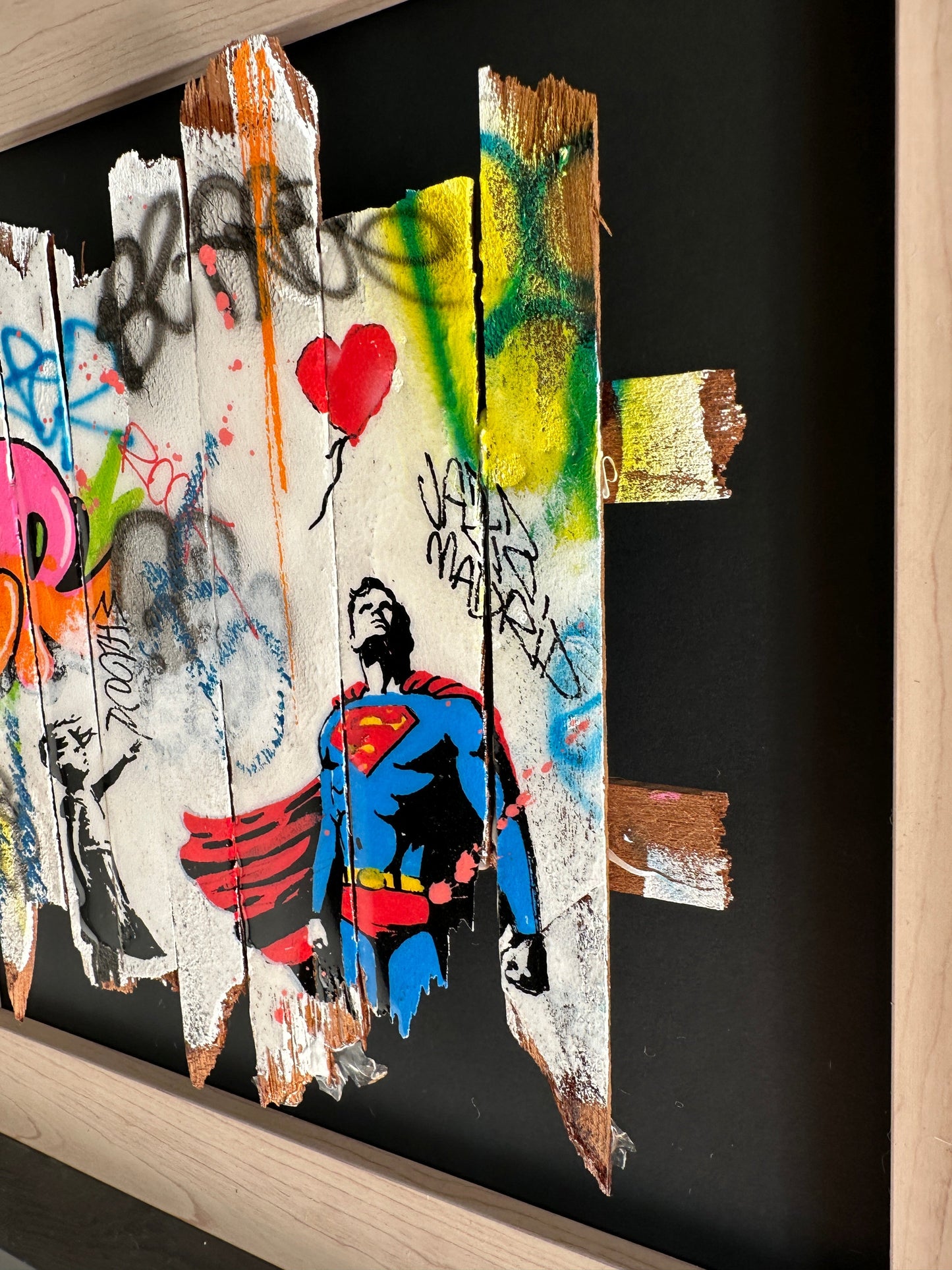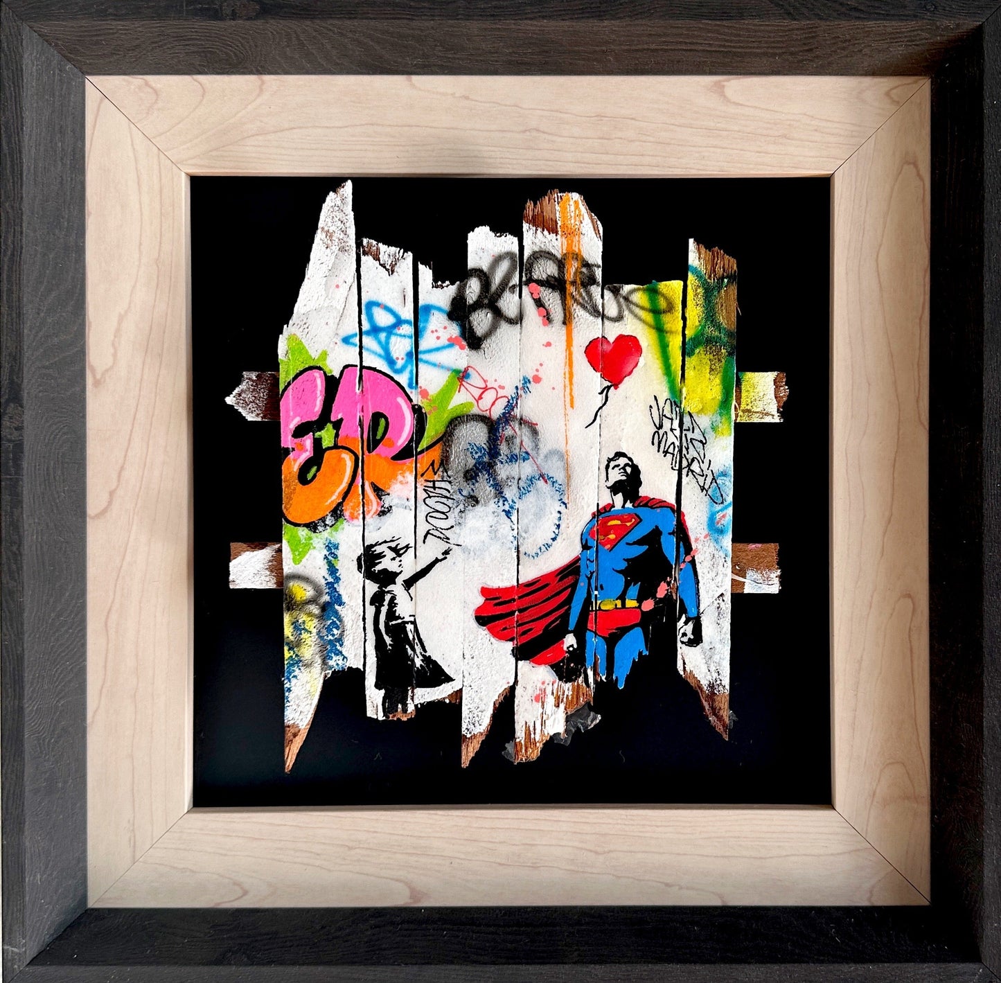 Cette composition impressionnante juxtapose des super-héros et des arts de la rue dans une seule image encadrée pour représenter les scènes de la vie réelle de la ville : un Superman capé de rouge, vêtu de bleu, discutant avec un très jeune enfant tenant un ballon en forme de cœur.