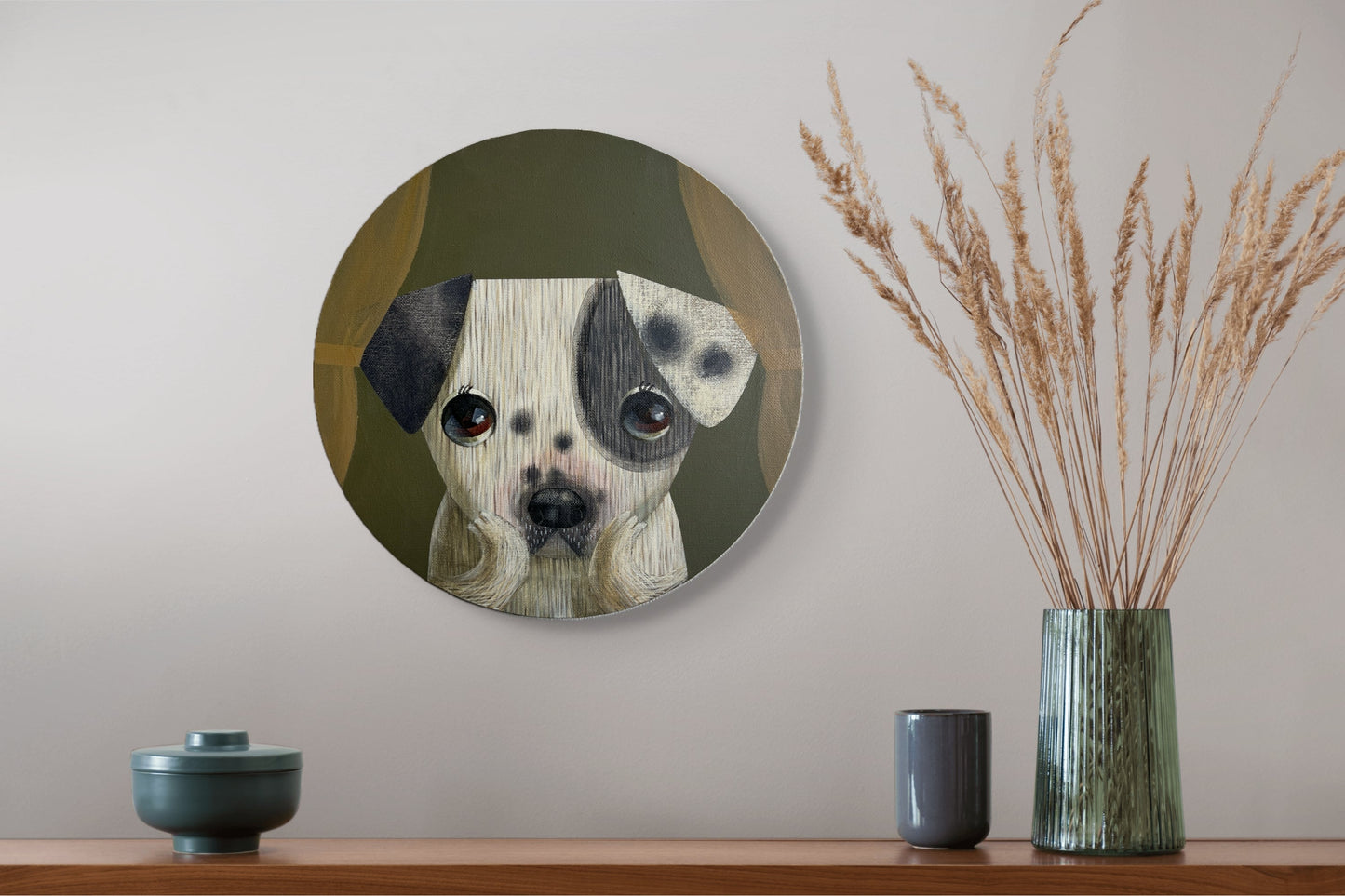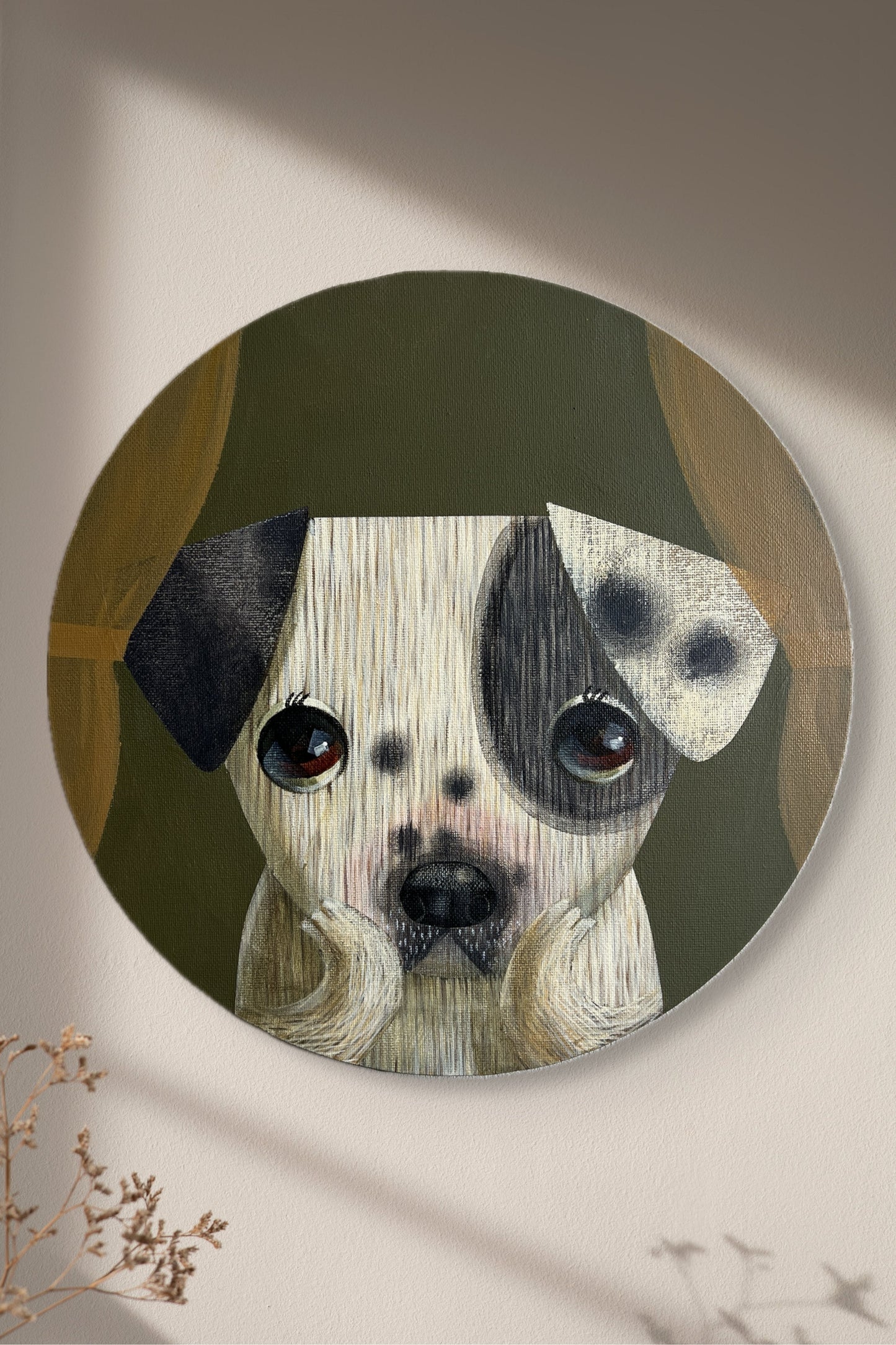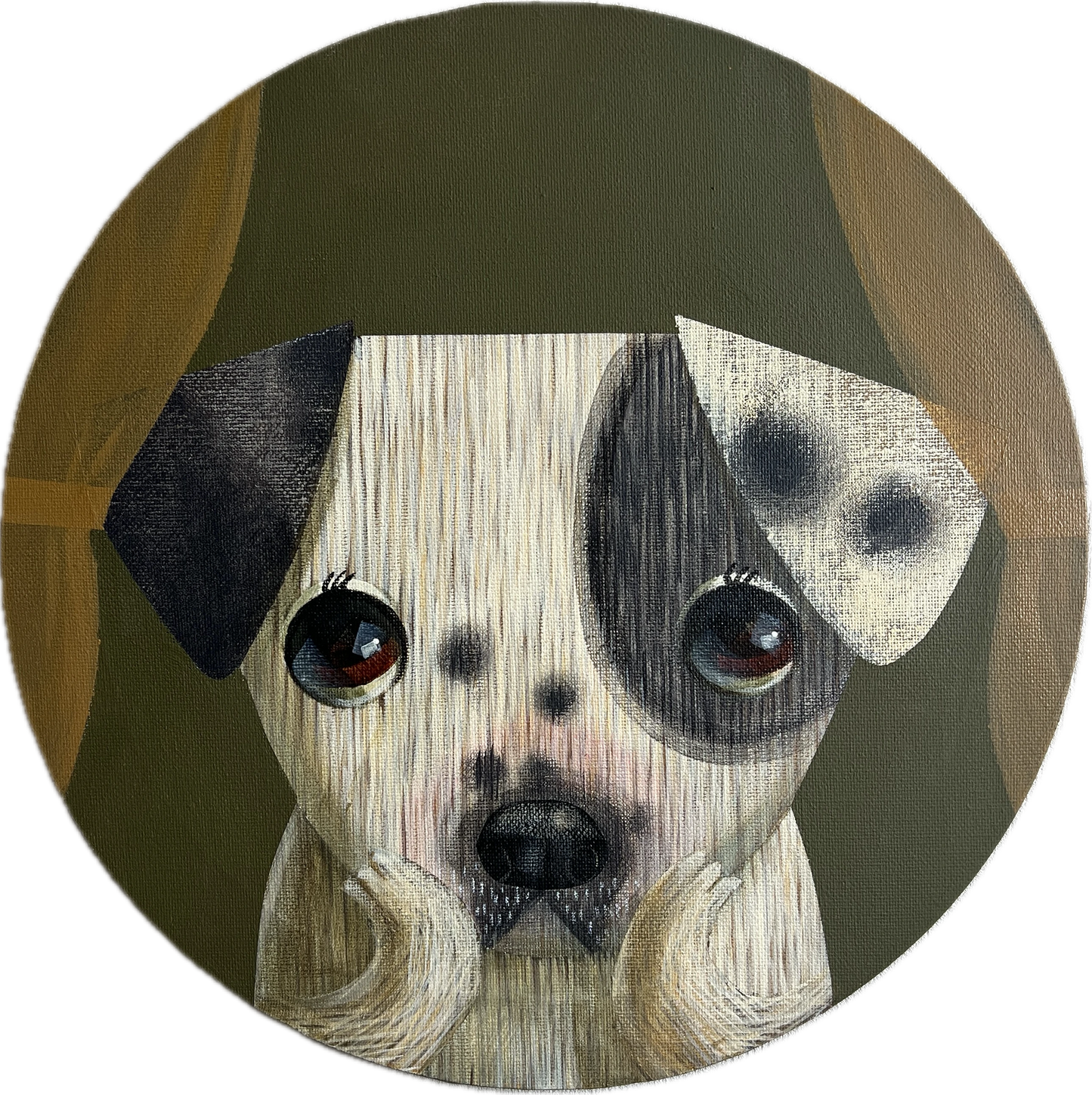 L'œuvre « Spot Discovery » d'Akio Harada représente un chien mignon assis sur un fond vert discret, avec un cache-œil remarquable sur un œil. Le visage expressif du chien bénéficie d'une attention particulière et personnelle grâce à la composition circulaire. L'animal invite le spectateur à s'identifier à ses sentiments nuancés avec ses grands yeux pleins d'âme, sa fourrure soyeuse et ses pattes doucement posées. Cette œuvre est un délicieux examen de la personnalité et du caractère en raison de l'attention portée par Harada aux détails et de l'utilisation de tons terreux, qui produisent un mélange harmonieux de chaleur et de charme.