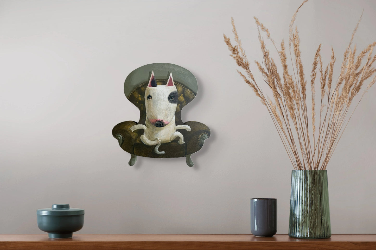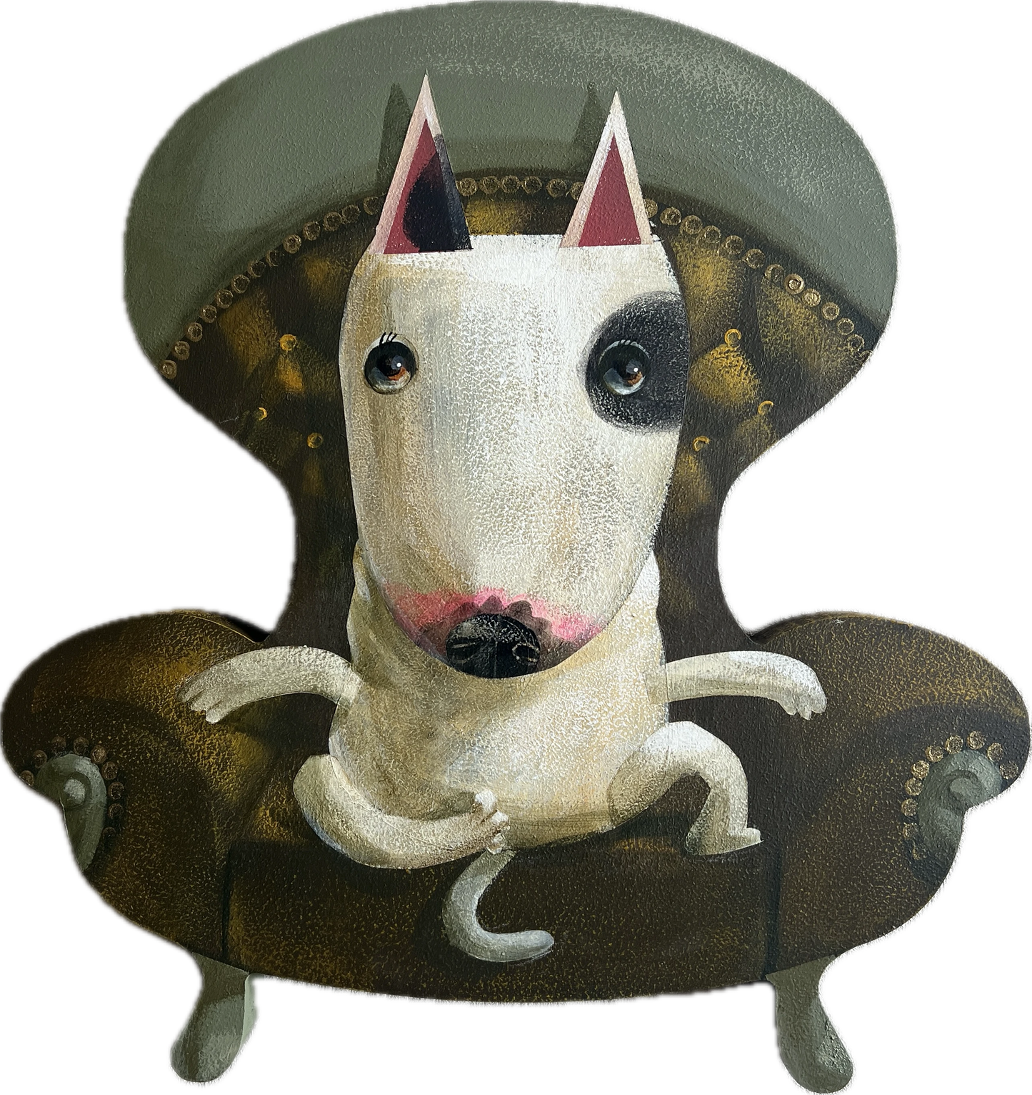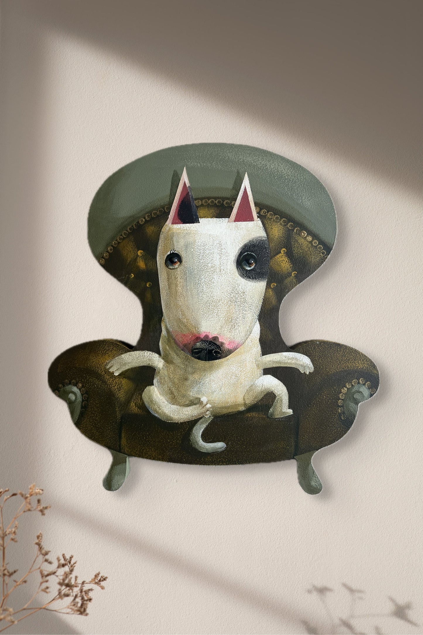 L'œuvre « The Rumoured Toshio » d'Akio Harada montre un bull terrier fantaisiste allongé sur un fauteuil opulent. L'œuvre possède un charme unique grâce au cache-œil noir caractéristique du chien, qui accentue son regard expressif et légèrement curieux. L'élégance et le côté ludique sont harmonieusement équilibrés par les textures soigneusement texturées de la fourrure et les ornements dorés élaborés de la chaise. Les teintes terreuses atténuées de la chaise et de l'arrière-plan mettent en valeur la personnalité unique du chien et sa posture particulière. L'utilisation habile de l'art par Harada pour raconter une histoire est évidente dans cette représentation charmante et captivante.