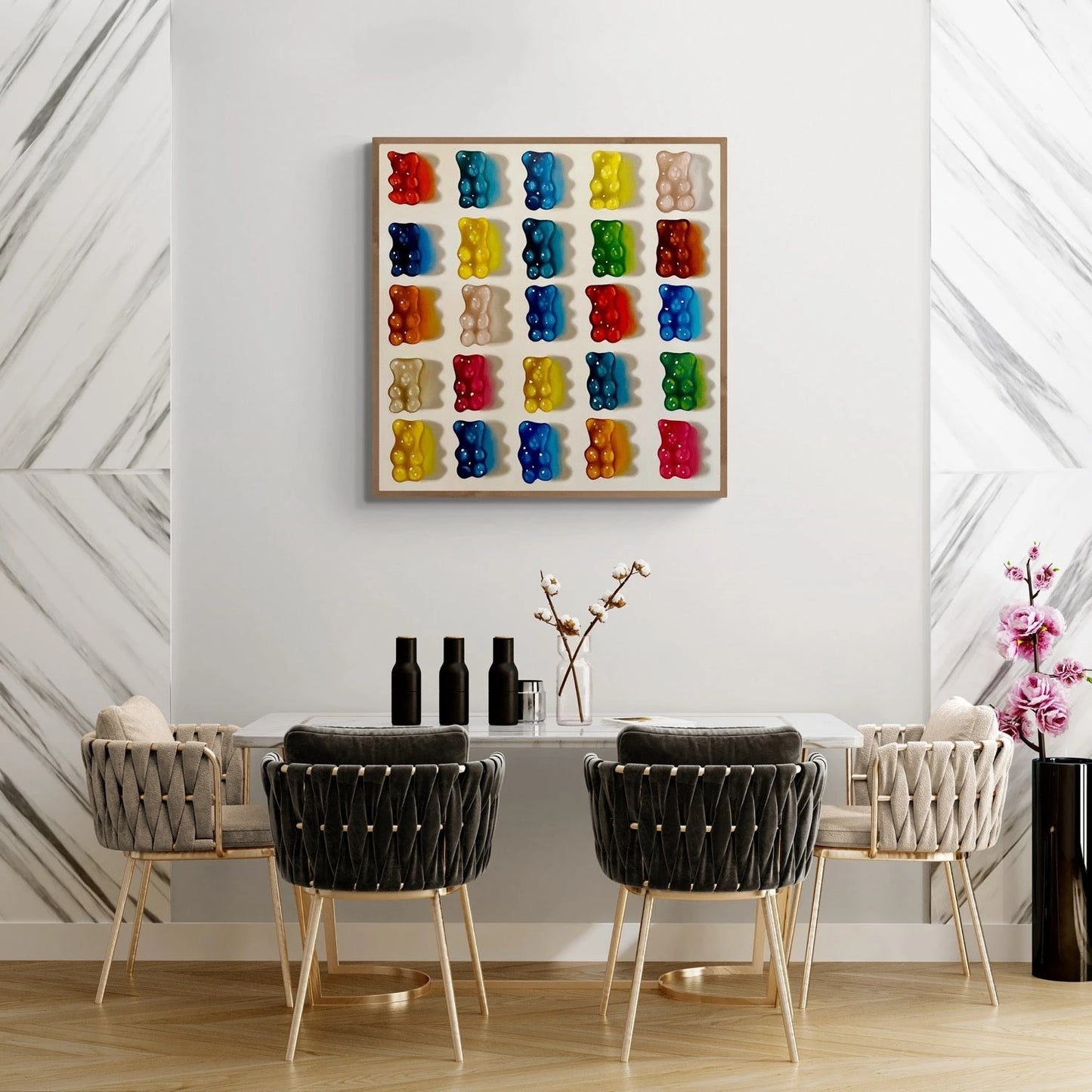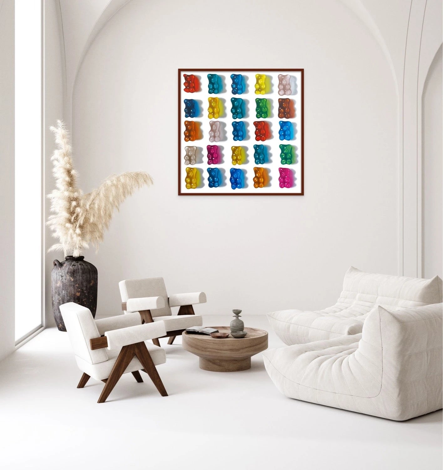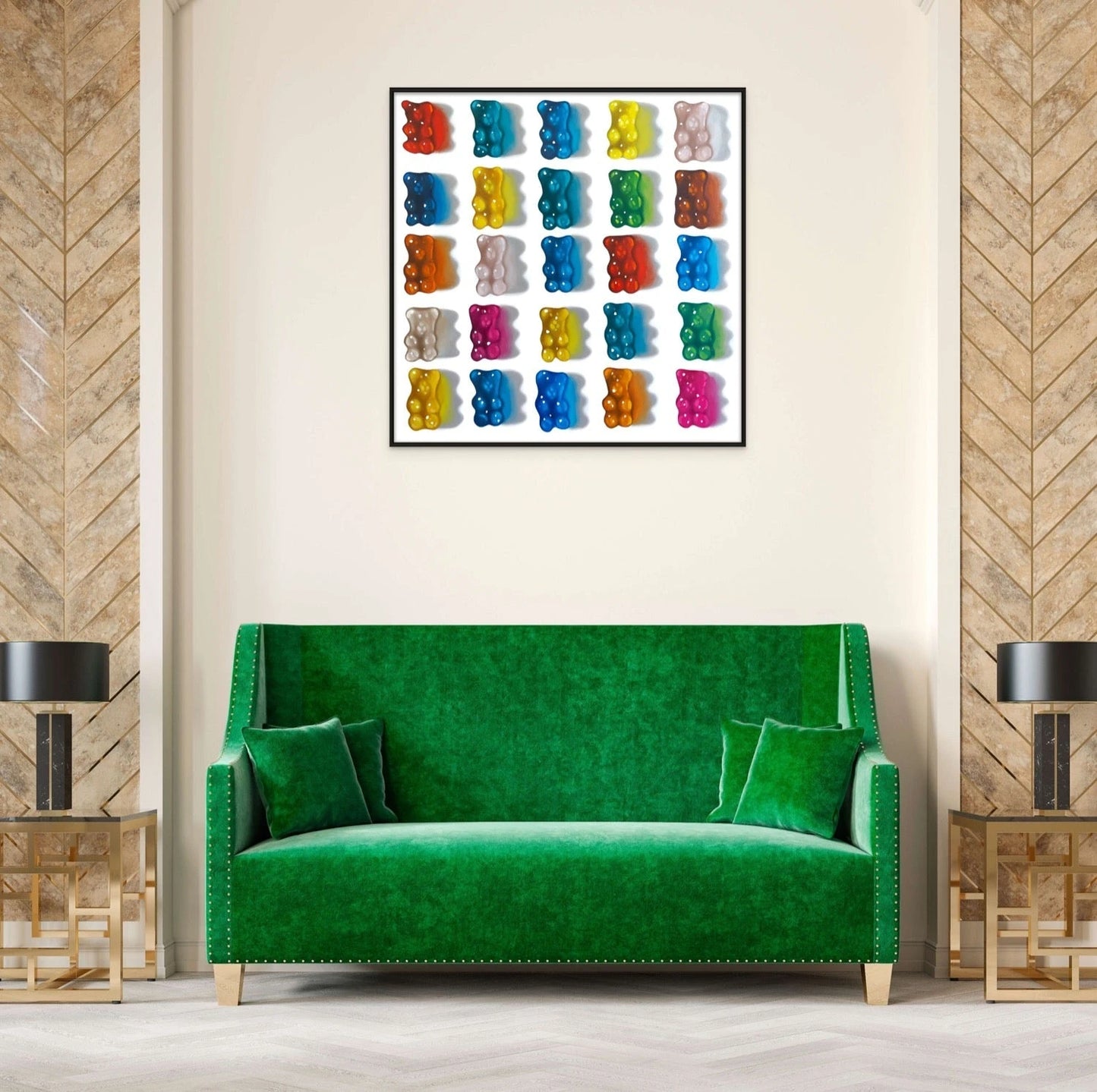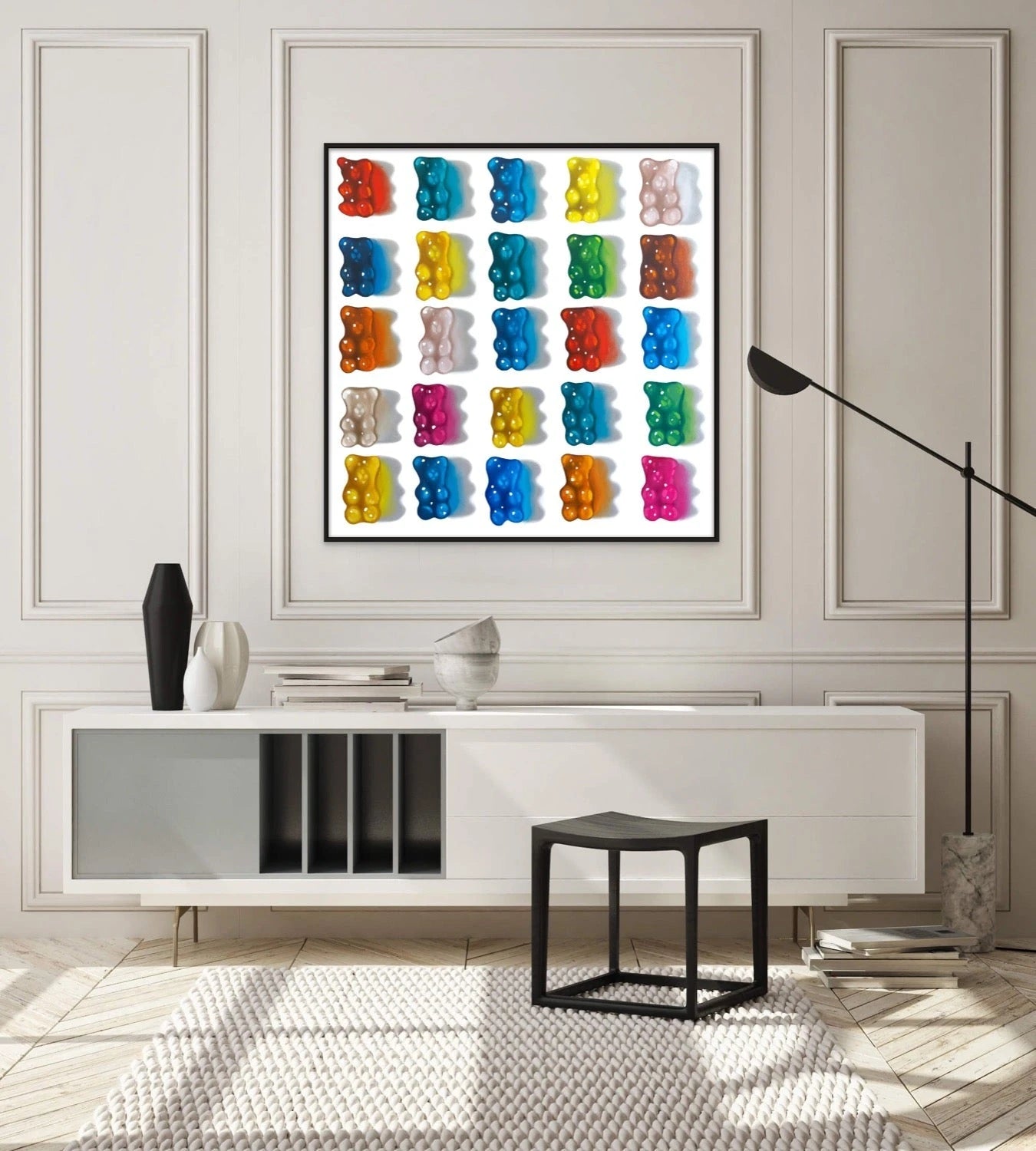 La peinture est une symphonie de couleurs, chaque ours étant illuminé de teintes riches et saturées qui dansent sur la toile, faisant écho à la joie et au rythme inhérents aux plaisirs simples. L'utilisation de la lumière par l'artiste met non seulement en valeur la texture moelleuse des ours mais également leur translucidité, créant une luminosité semblable à un bijou qui rayonne de l'œuvre. Avec une répétition délibérée et un placement soigné, Bertolucci imprègne la composition d'un sentiment d'ordre et d'harmonie, invitant le spectateur à trouver du réconfort dans les motifs qui se répètent rythmiquement tout en variant subtilement en ton et en nuance.