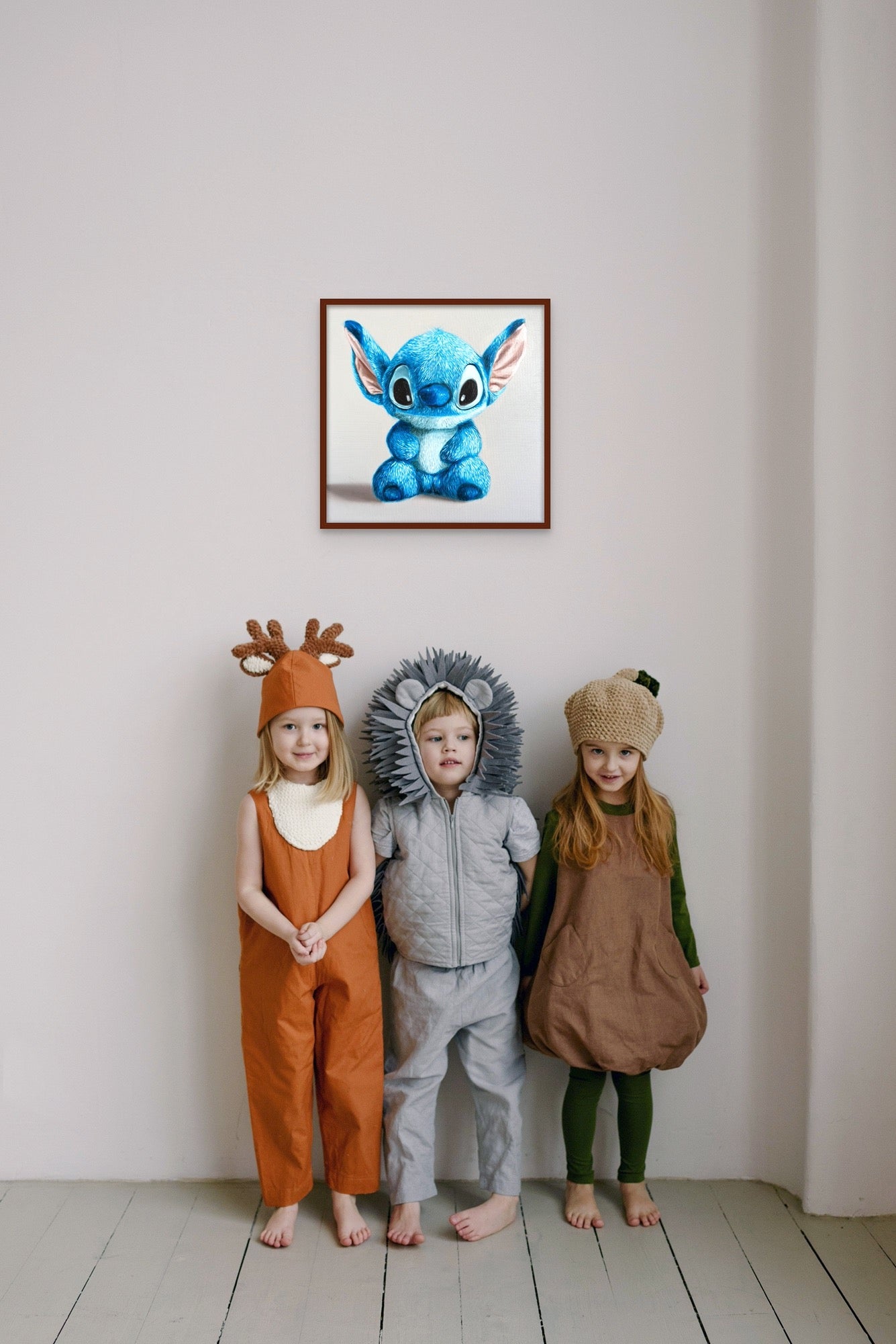 La maîtrise de la texture et de la lumière de Bertolucci est pleinement mise en valeur, puisque la fourrure du sujet, teinte dans les nuances de bleu les plus délicates, présente un réalisme tactile qui murmure presque la sensation du toucher. Le travail au pinceau complexe donne une impression de profondeur et de dimensionnalité, chaque brin de fourrure étant méticuleusement rendu pour capturer l'interaction entre l'ombre et la luminescence. Les oreilles surdimensionnées de la créature, teintées d'une douce teinte rose, encadrent un visage qui rayonne d'innocence et d'un désir inexprimé de compagnie et d'aventure.