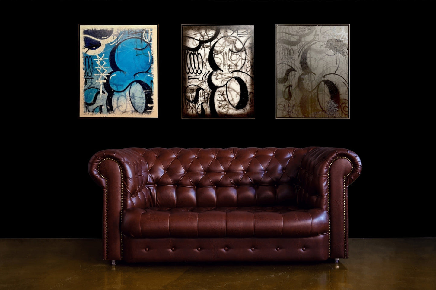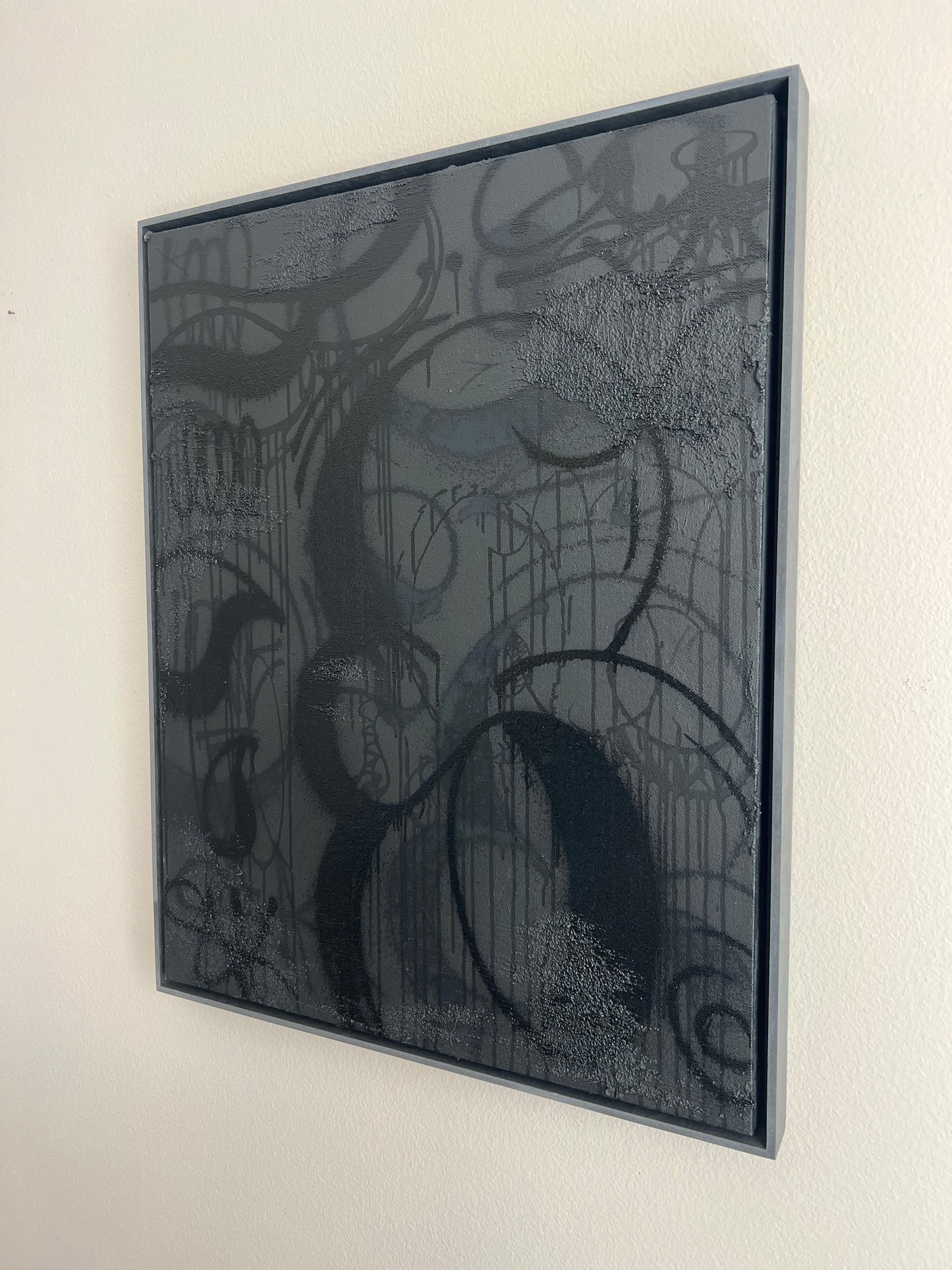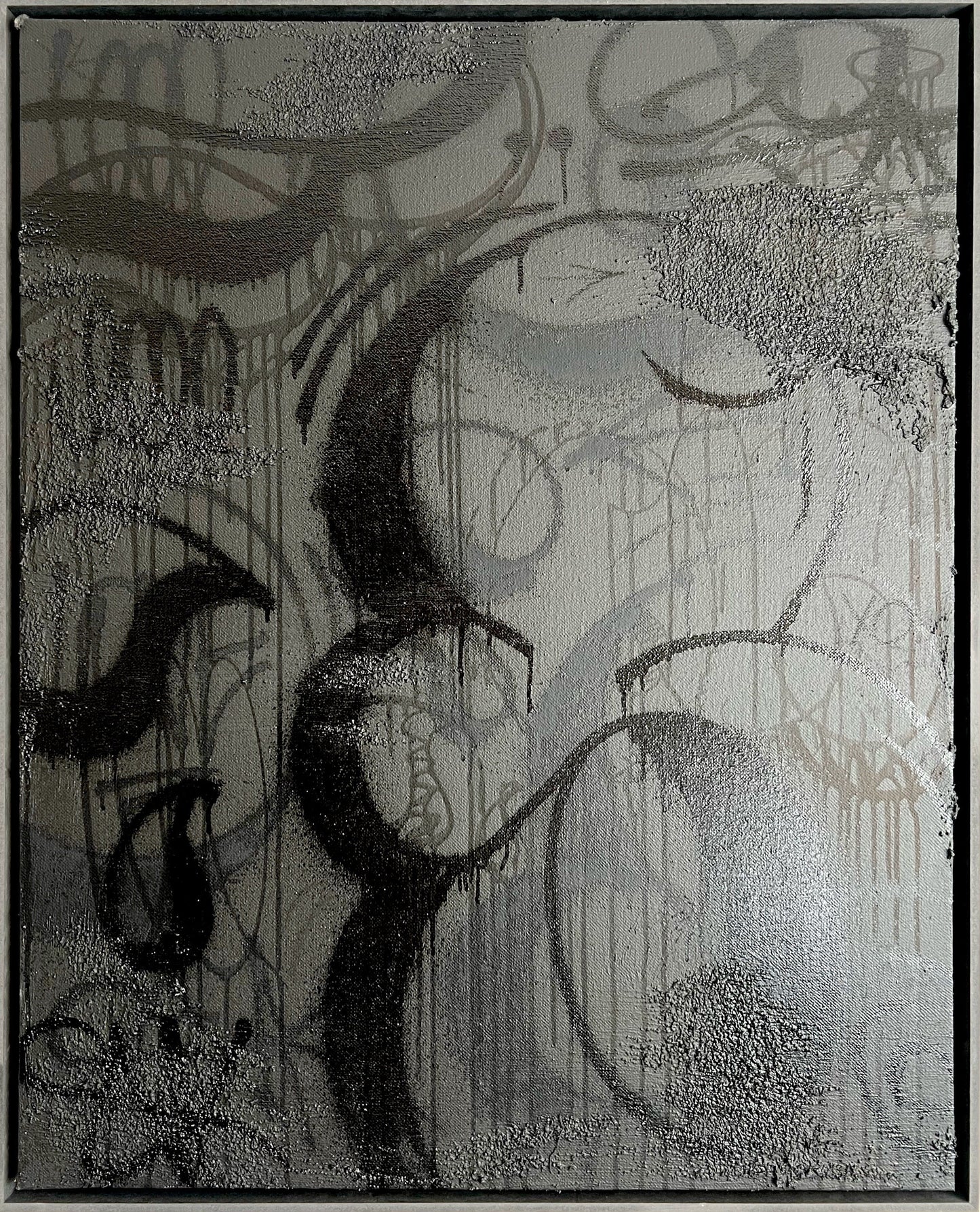 "Forever Yours" de Sven présente une composition abstraite caractérisée par des courbes amples et des gouttes fluides sur une surface métallique, créant un jeu dynamique d'ombre et de lumière. L'utilisation dominante du noir et des nuances de gris renforce son effet dramatique, tandis que la qualité réfléchissante de la toile de fond ajoute de la profondeur et de la dimension. Les lignes fluides et gestuelles dansent sur la toile, évoquant un sens du mouvement et du rythme. Des textures subtiles émergent là où la peinture s'épaissit, offrant un contraste attrayant avec des zones plus lisses. Cette pièce incarne un mélange harmonieux de chaos et d'ordre, invitant les spectateurs à explorer ses subtilités superposées. La manipulation habile des éléments par Sven encourage une interprétation personnelle, ce qui en fait un point focal convaincant dans n'importe quel espace.