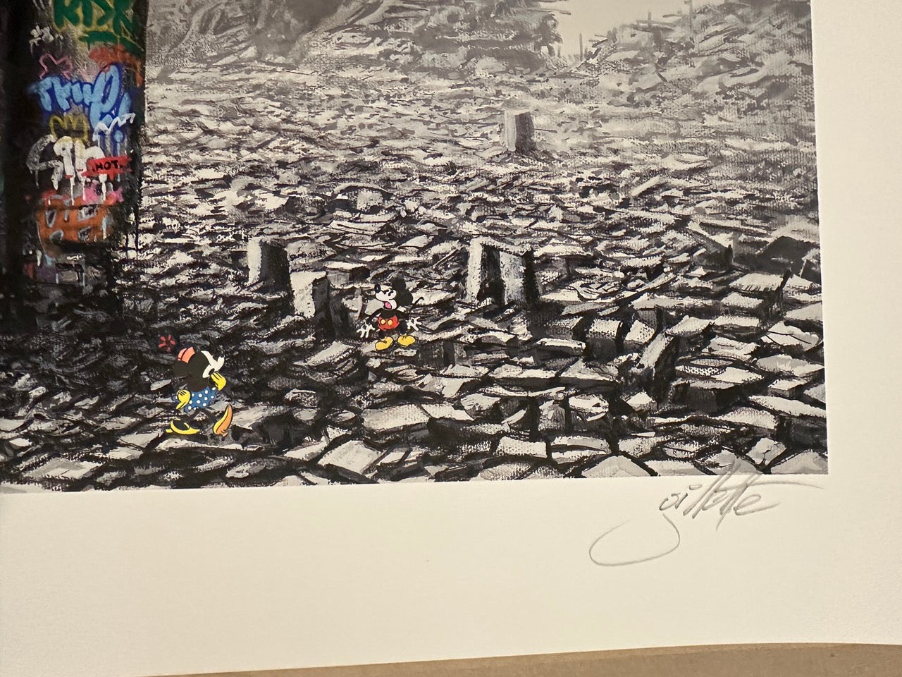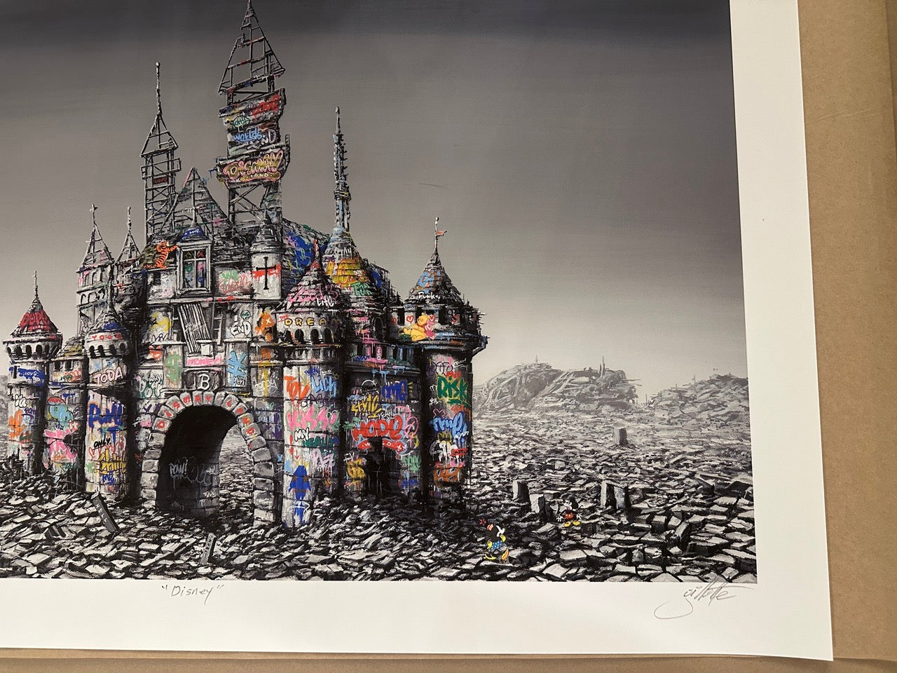 This HAND-ENHANCED limited-edition print, 24" x 34", by Jeff Gillette and Roamcouch presents a striking, dystopian reimagining of the Disney castle, juxtaposing elements of whimsy with a somber, post-apocalyptic landscape.