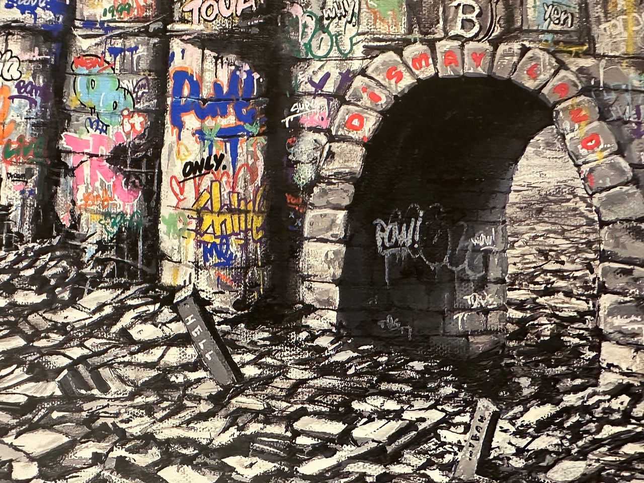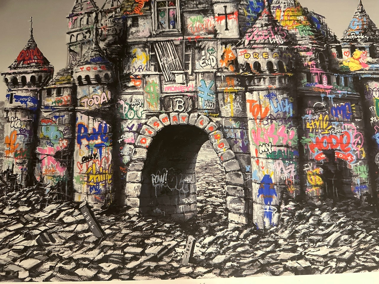 The castle, typically a symbol of fantasy and childhood dreams, is rendered here with an intricate overlay of urban decay. The walls are a chaotic medley of vibrant graffiti and vivid colors, standing in stark contrast to the grayscale environment that surrounds it.
